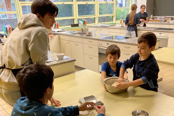 Im Dezember trafen sich die Zweitkindergartenkinder des KIGA Nuechtal 1mit den Schülerinnen und Schülern der B2a in der Kochschule. Die Oberstufenschülerinnen und -schüler leiteten die Kindergartenkinder mit viel Geduld und Können an, sodass aus den Grundzutaten wunderbar individuelle Grittibänze entstehen durften.