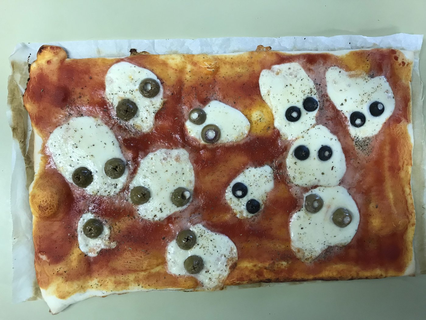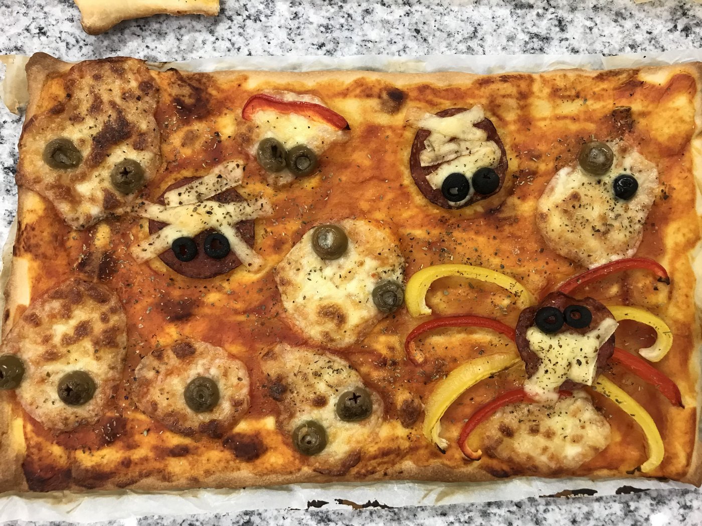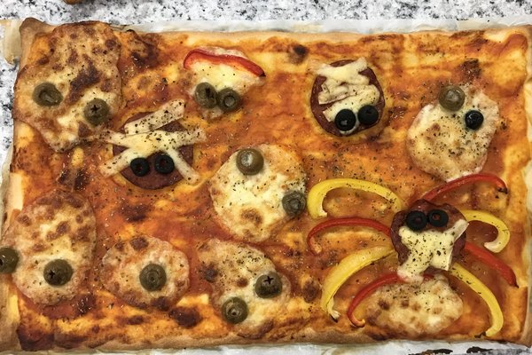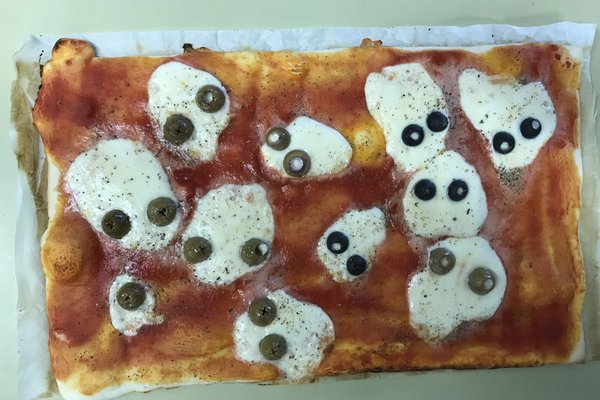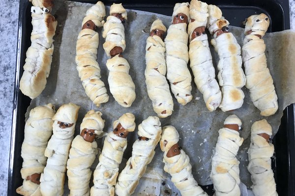 We didn’t miss the mummy sausages and the monster pizza. We wrapped sausages in puff pastry and baked them until they looked like little mummies. The pizza had little spiders and cheese-ghosts on it. Yammi.