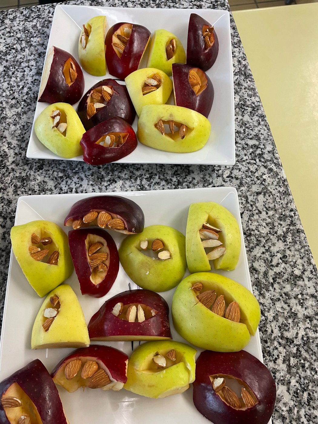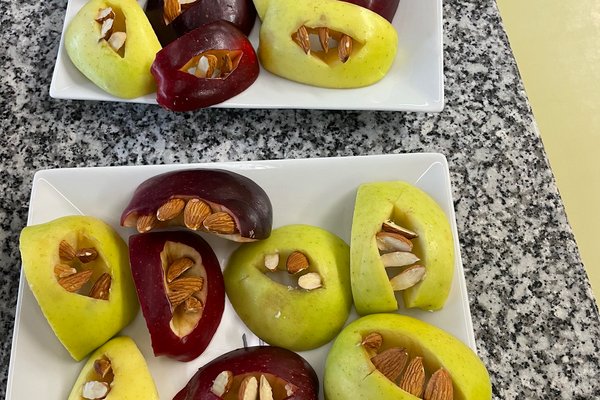 We also prepared monster mouths. We cut apple slices and used mini nuts as teeth — they looked really creepy but tasted great!