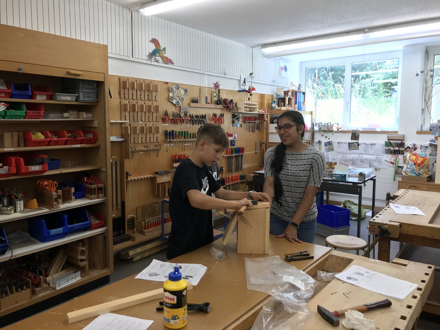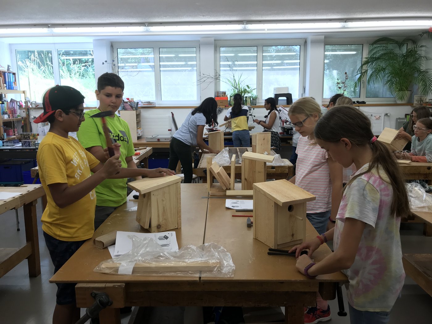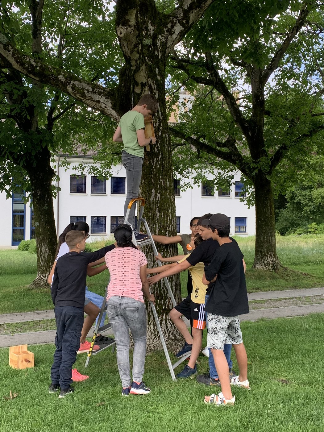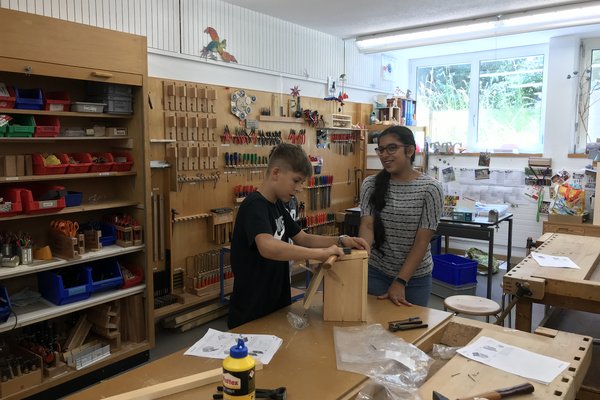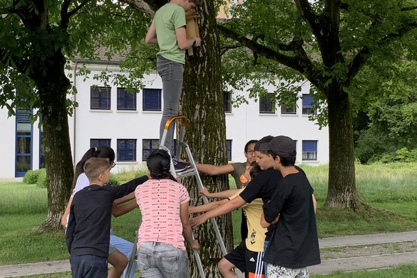 Damit es den Vögeln im Siggenthal auch gut geht, wurden in Partnerarbeit Nistkästen aus Holz gebaut und Vogeltränken aus Beton gegossen. Vier der Nistkästen wurden am Ende der Woche auf dem Pausenareal des Bachmatts aufgehängt, der Rest hängt in den Gärten der Schülerinnen und Schüler.