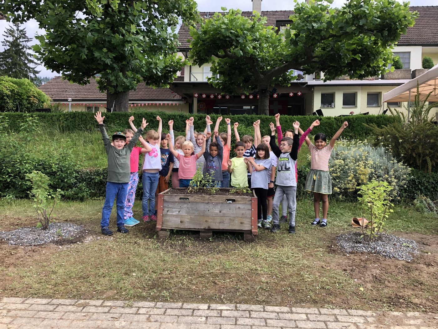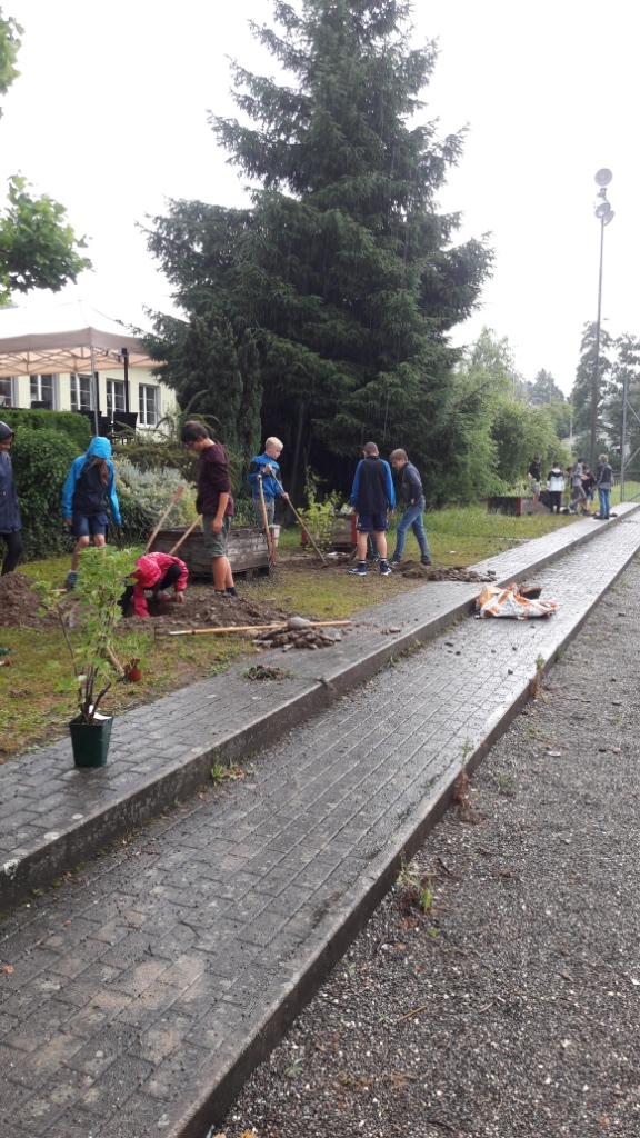 Donnerstag ging es dann bei Wind und Wetter an die Bepflanzung des Schulareals Bachmatt.