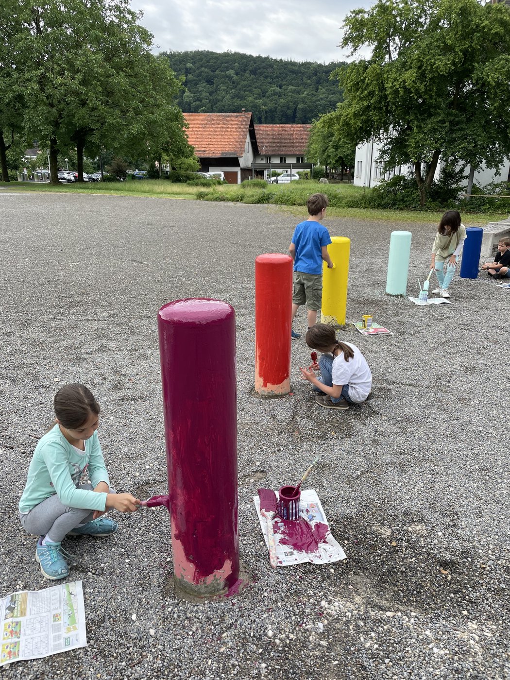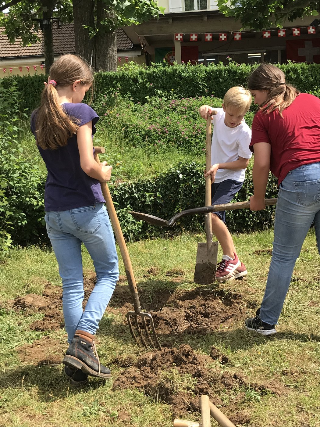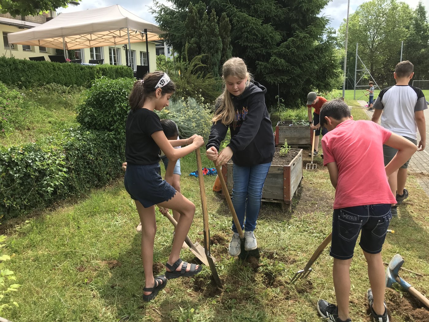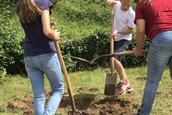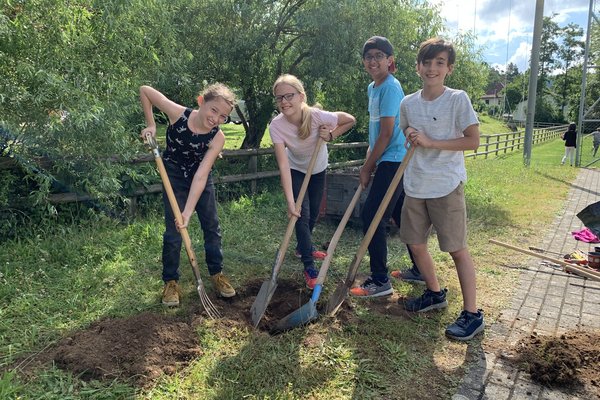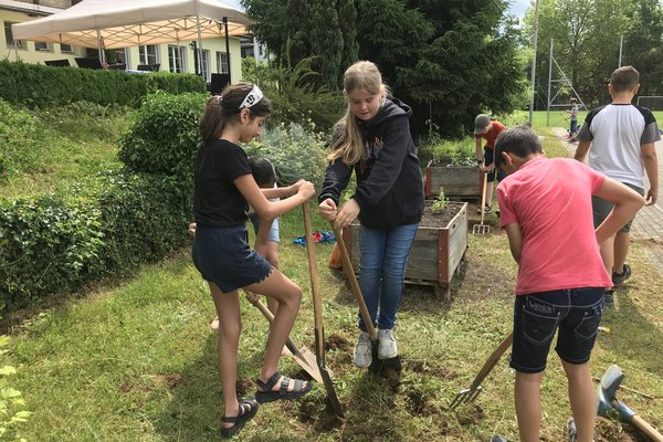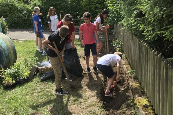 Wie die Unterstufenklassen durften auch die Fünftklässer mit Spaten und Schaufeln gärtnern, Hochbeete bepflanzen, Löcher für Stauden ausheben und diese schliesslich einpflanzen. Auch wurde ein Mühlespiel aufgezeichnet, abgeklebt und angemalt, was nun in den Pausen bespielt werden kann.