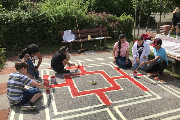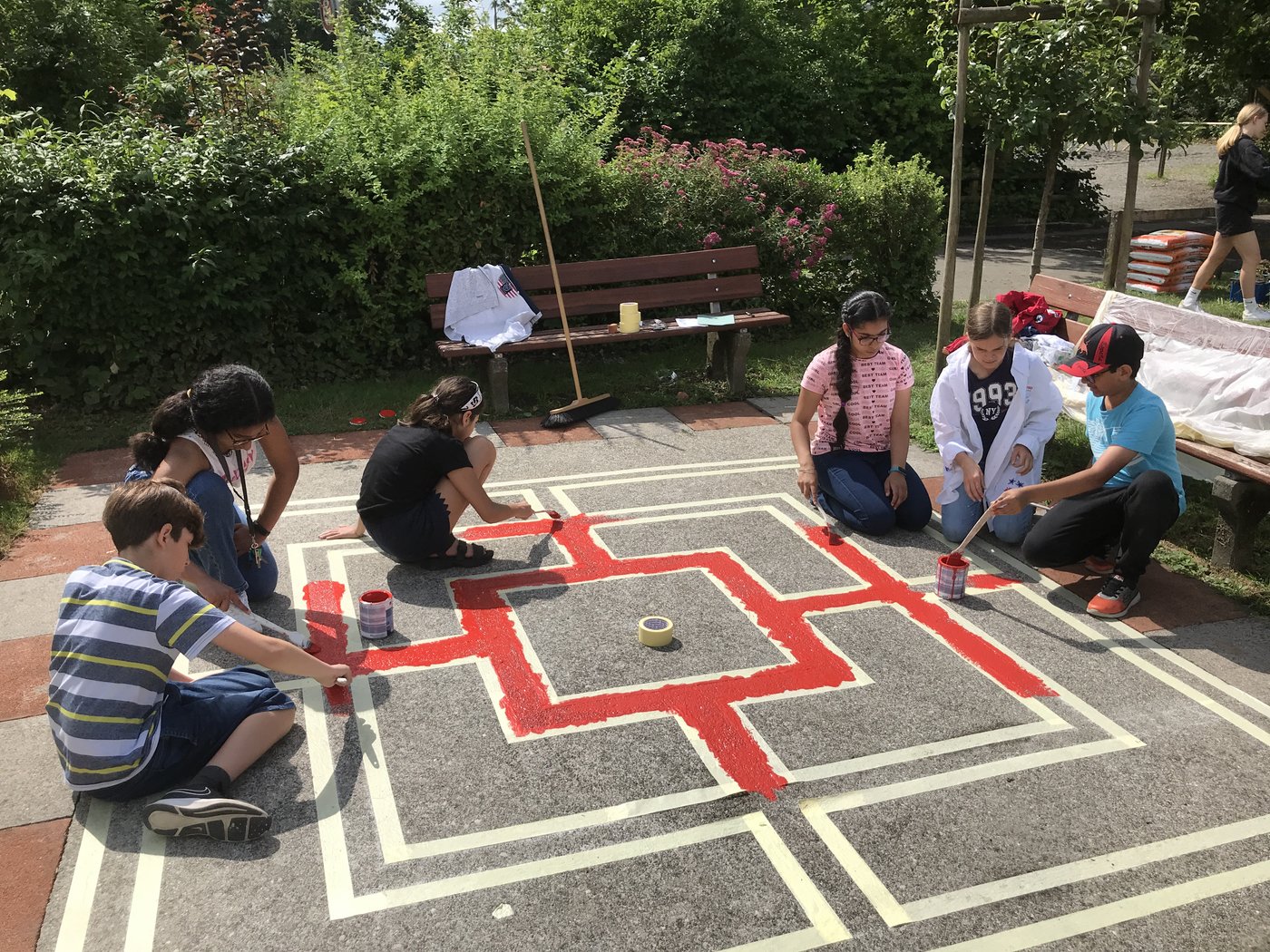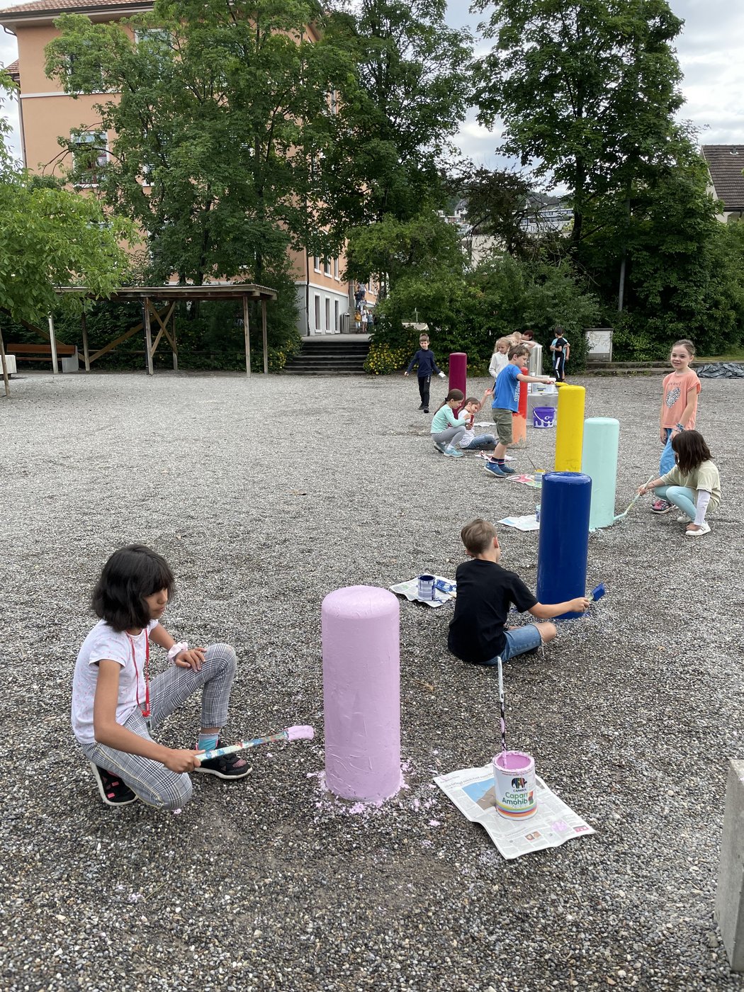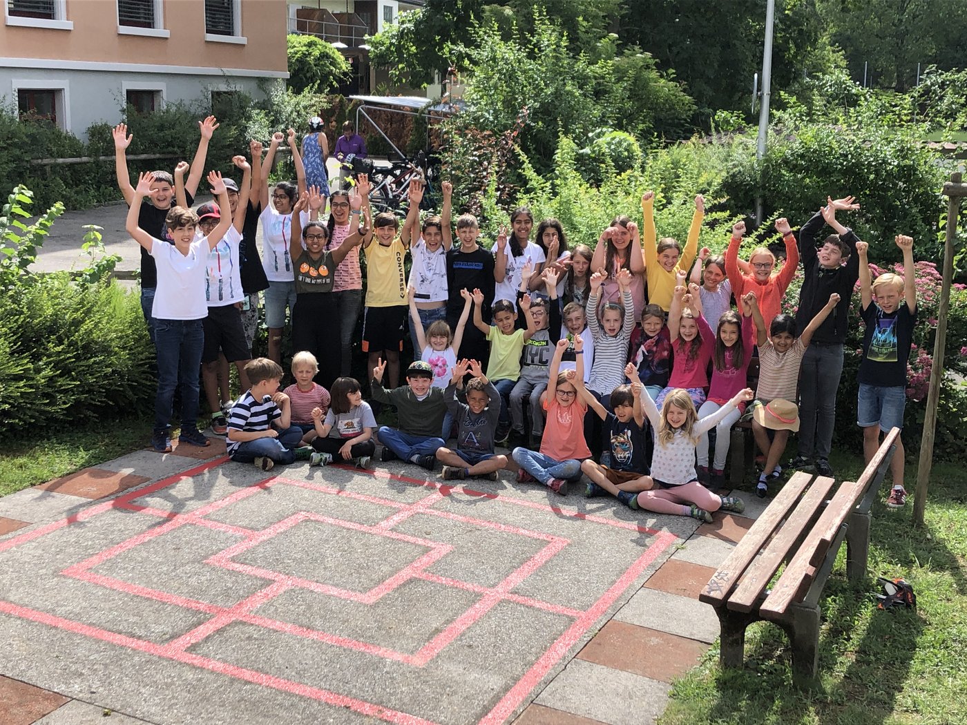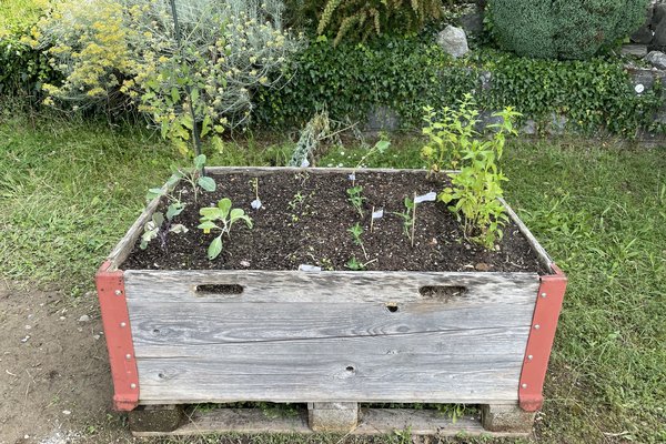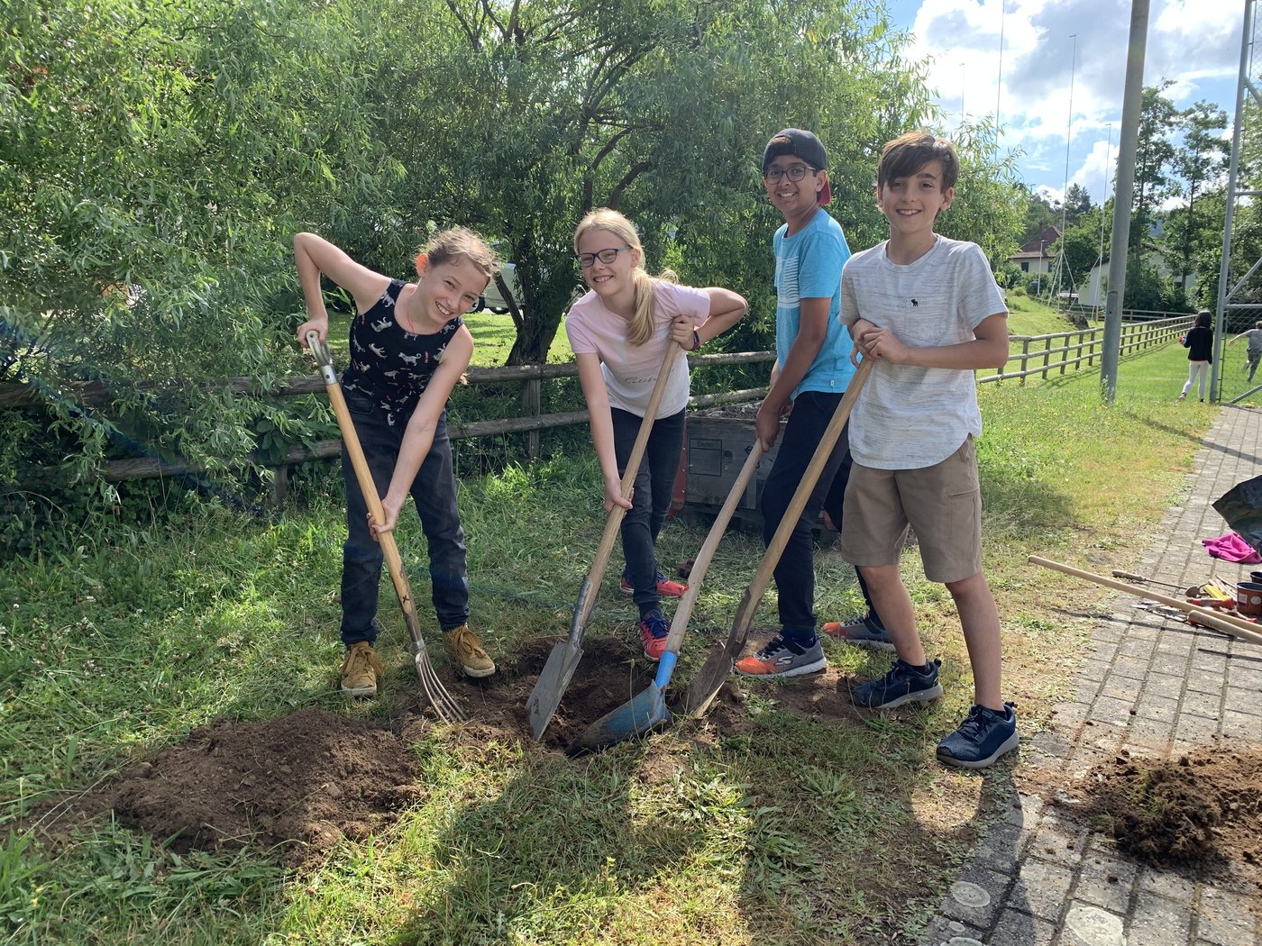 Wie die Unterstufenklassen durften auch die Fünftklässer mit Spaten und Schaufeln gärtnern, Hochbeete bepflanzen, Löcher für Stauden ausheben und diese schliesslich einpflanzen. Auch wurde ein Mühlespiel aufgezeichnet, abgeklebt und angemalt, was nun in den Pausen bespielt werden kann.