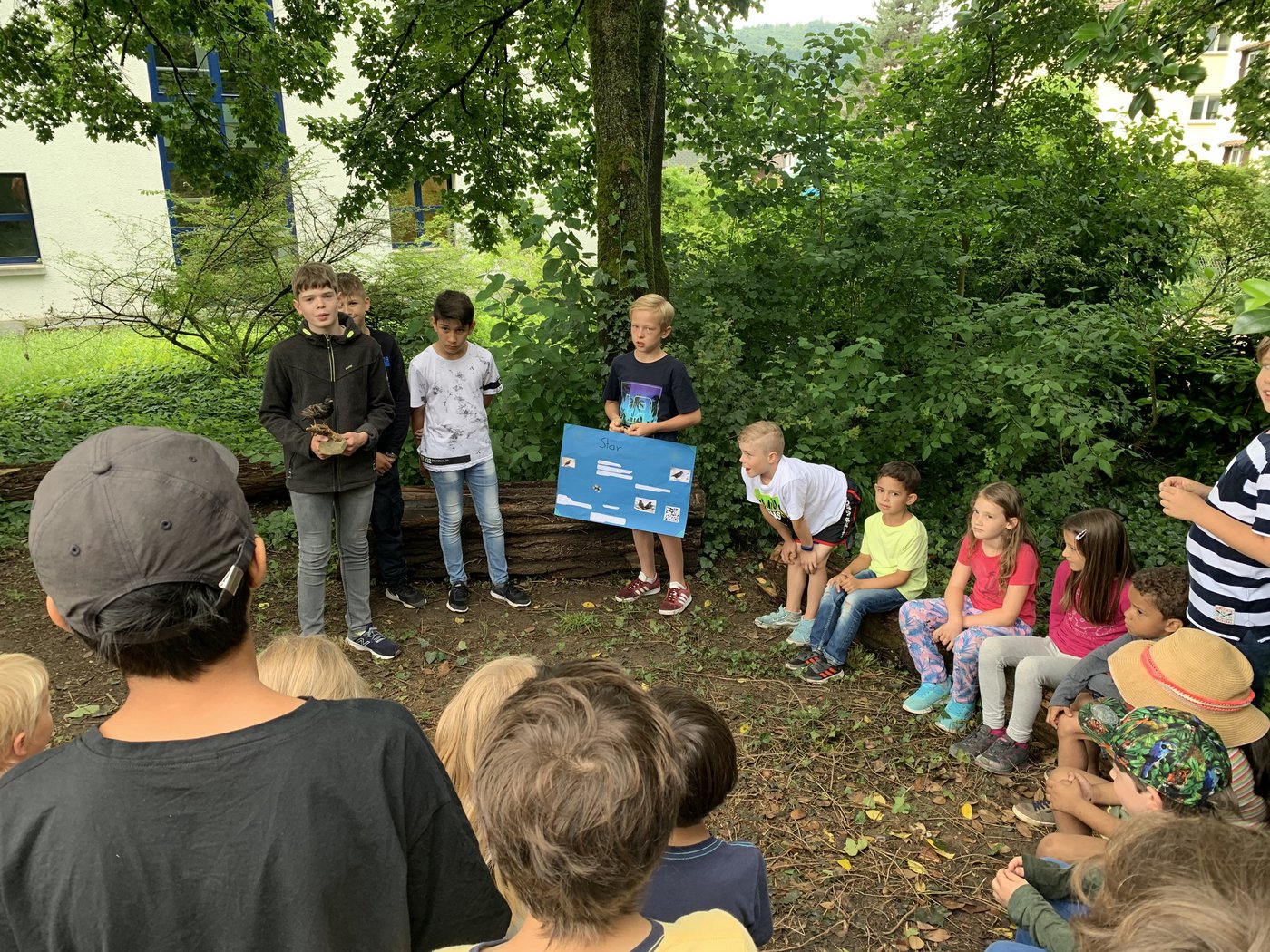 Die Kinder der P5d wurden während der Atelierwoche zu Vogelexperten und Gärtnern. In Gruppen setzten sich die Schülerinnen und Schüler mit einem einheimischen Vogel aus dem Siggenthal auseinander. Dafür mussten Bücher studiert, Gezwitscher gehört und Informationen sortiert werden. Am Ende der Woche wurden Star, Rotkehlchen, Erlenzeisig, Mäusebussard und Blaumeise mit einem Plakat den anderen Klassen aus dem Bachmatt draussen an unserem neuen Sitzplatz aus Baumstämmen präsentiert.