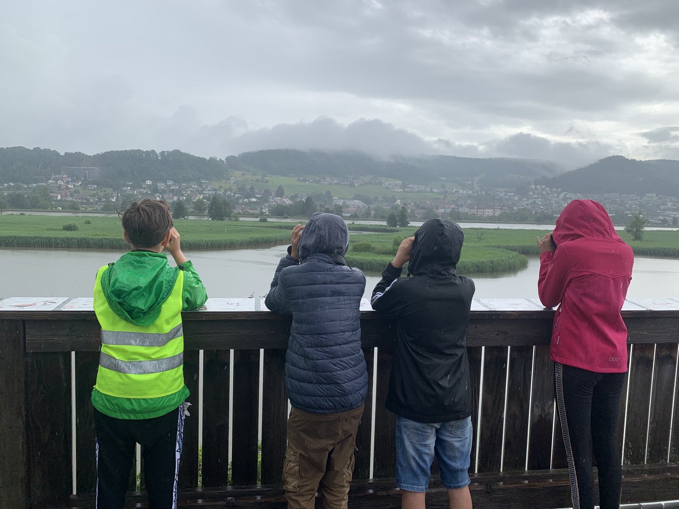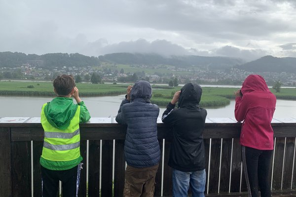 Am Donnerstag ging es mit dem Velo auf Exkursion an den Klingnauer Stausee. Leider regnete es so stark, dass sich sogar die Wasservögel versteckten und auch der Fernstecher nicht helfen konnten, viele Vögel zu entdecken. Durchnässt und fröstelnd waren alle froh, am Mittag im BirdLife-Naturzentrum zu essen und später bei Sonnenschein eine Führung zu geniessen. Zum Glück wurden wir am Schluss mit dem Anblick des Eisvogels belohnt, der sich vor uns flatternd und fischend präsentierte, als ob er sagen wollte: Allein für meinen minutenlangen Anblick hat sich eure anstrengende und nasse Velotour an den Stausee gelohnt.