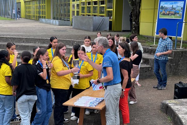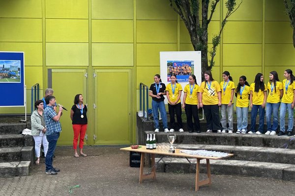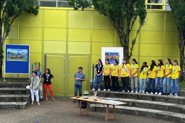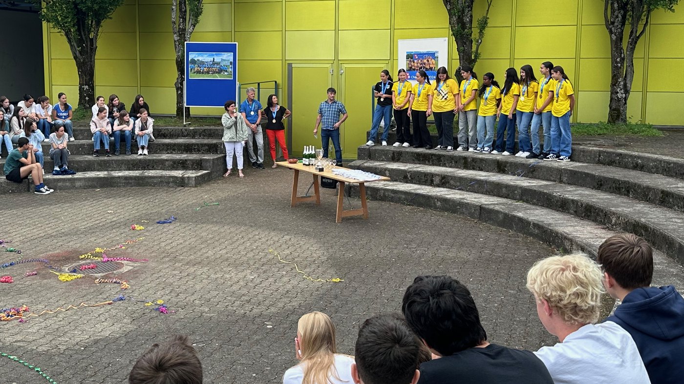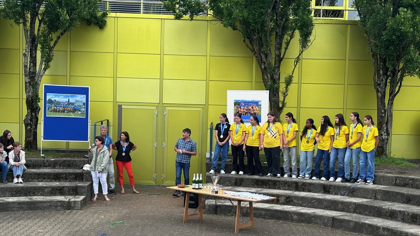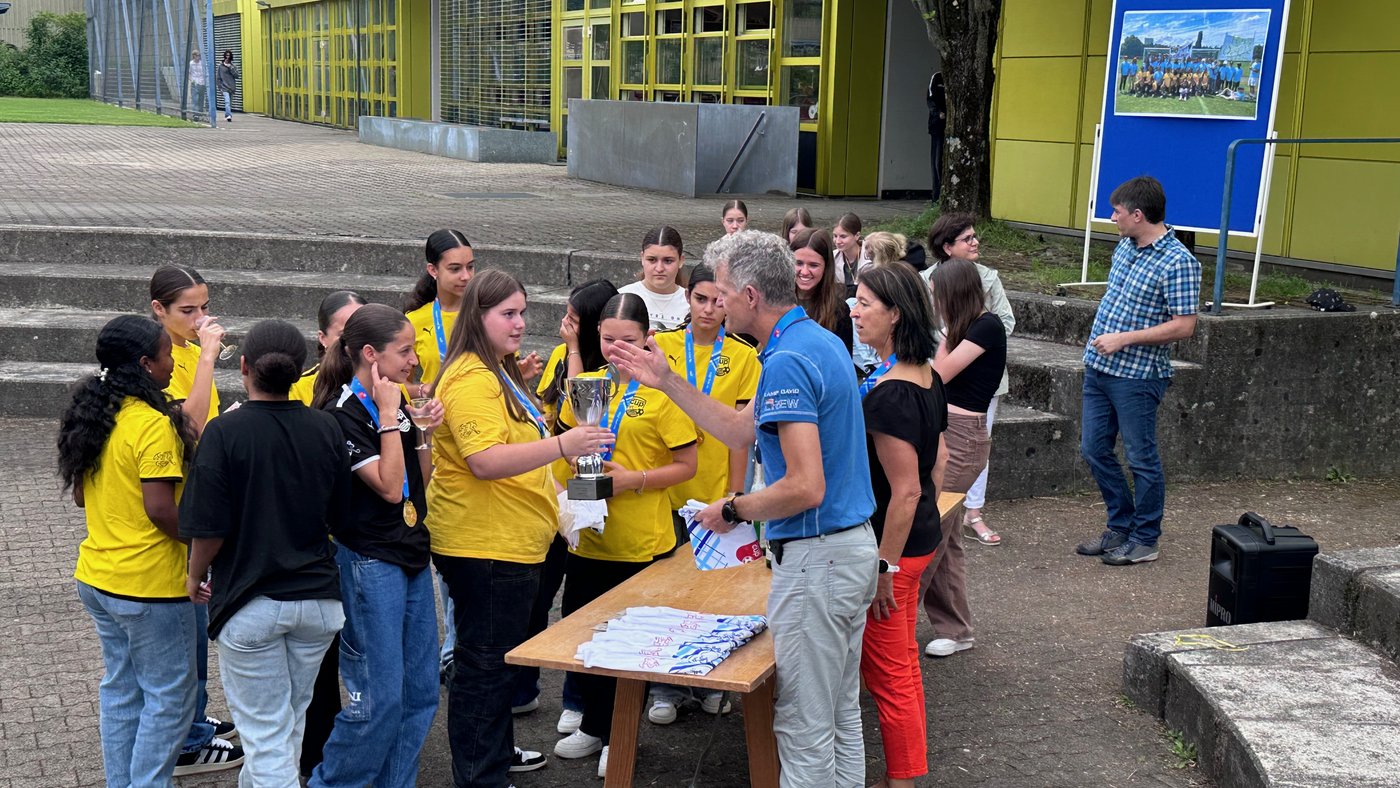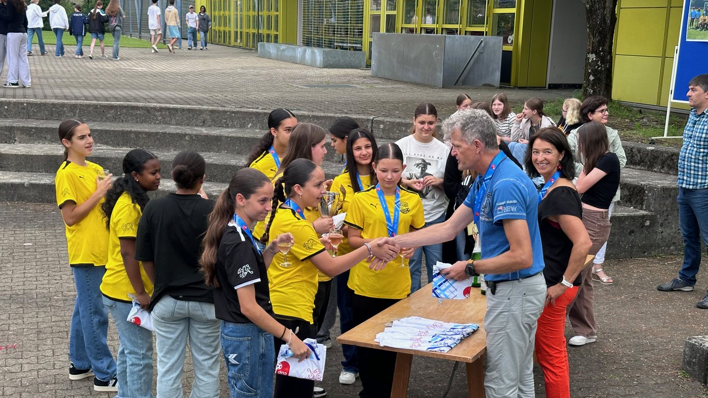 Die Schule Obersiggenthal ist stolz auf die Siegerinnen und feiert diese gemeinsam mit Frau Gemeindeammann Bettina Lutz in der grossen Pause.