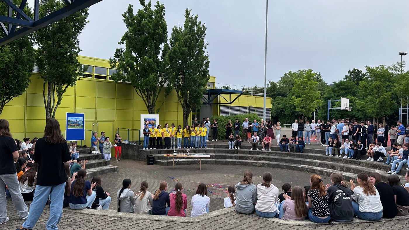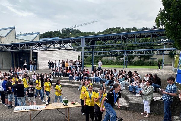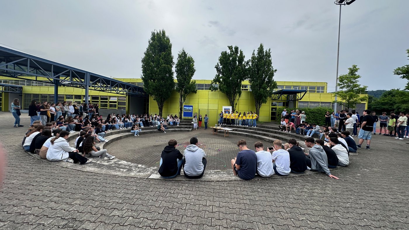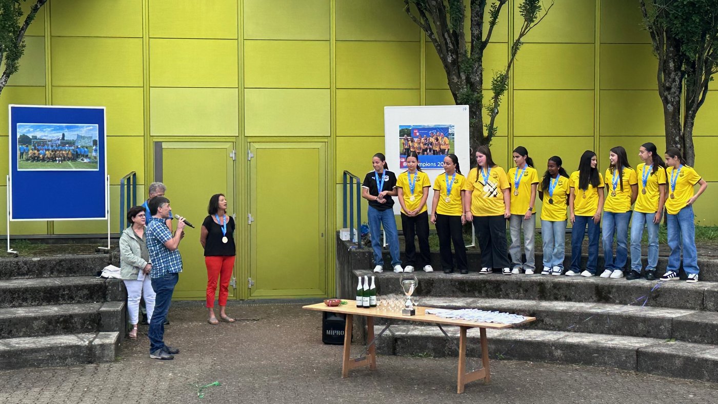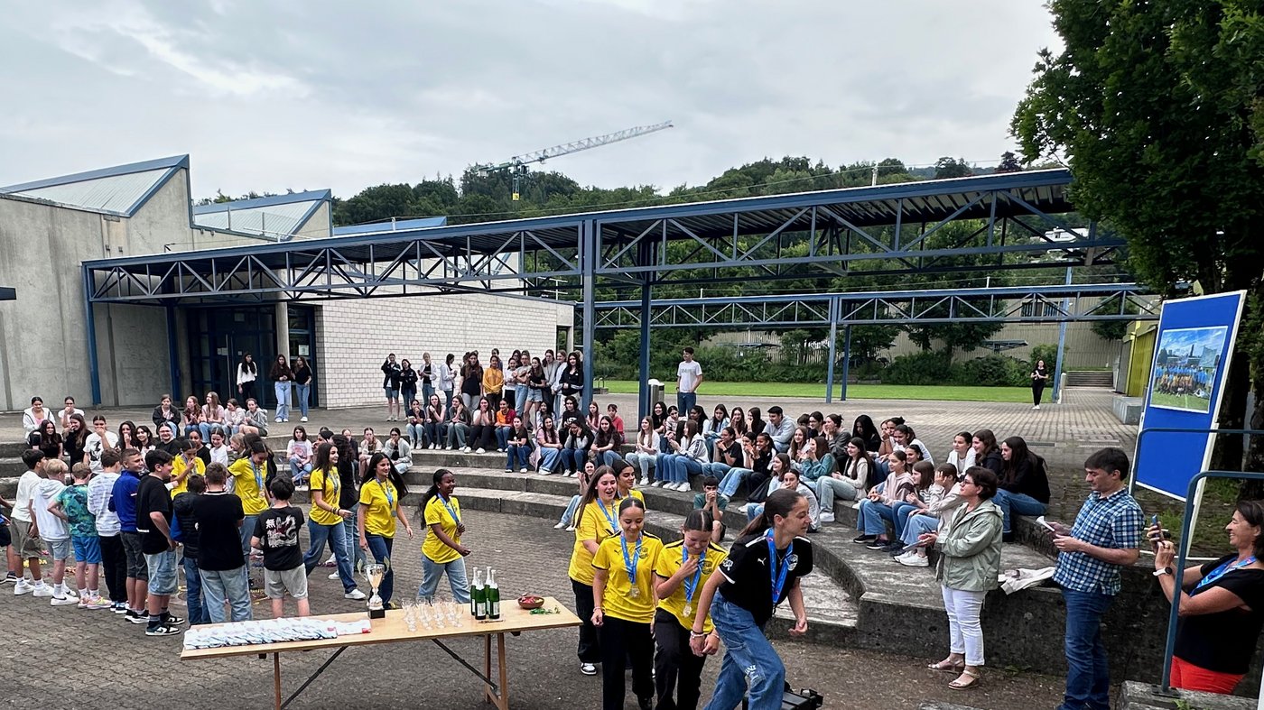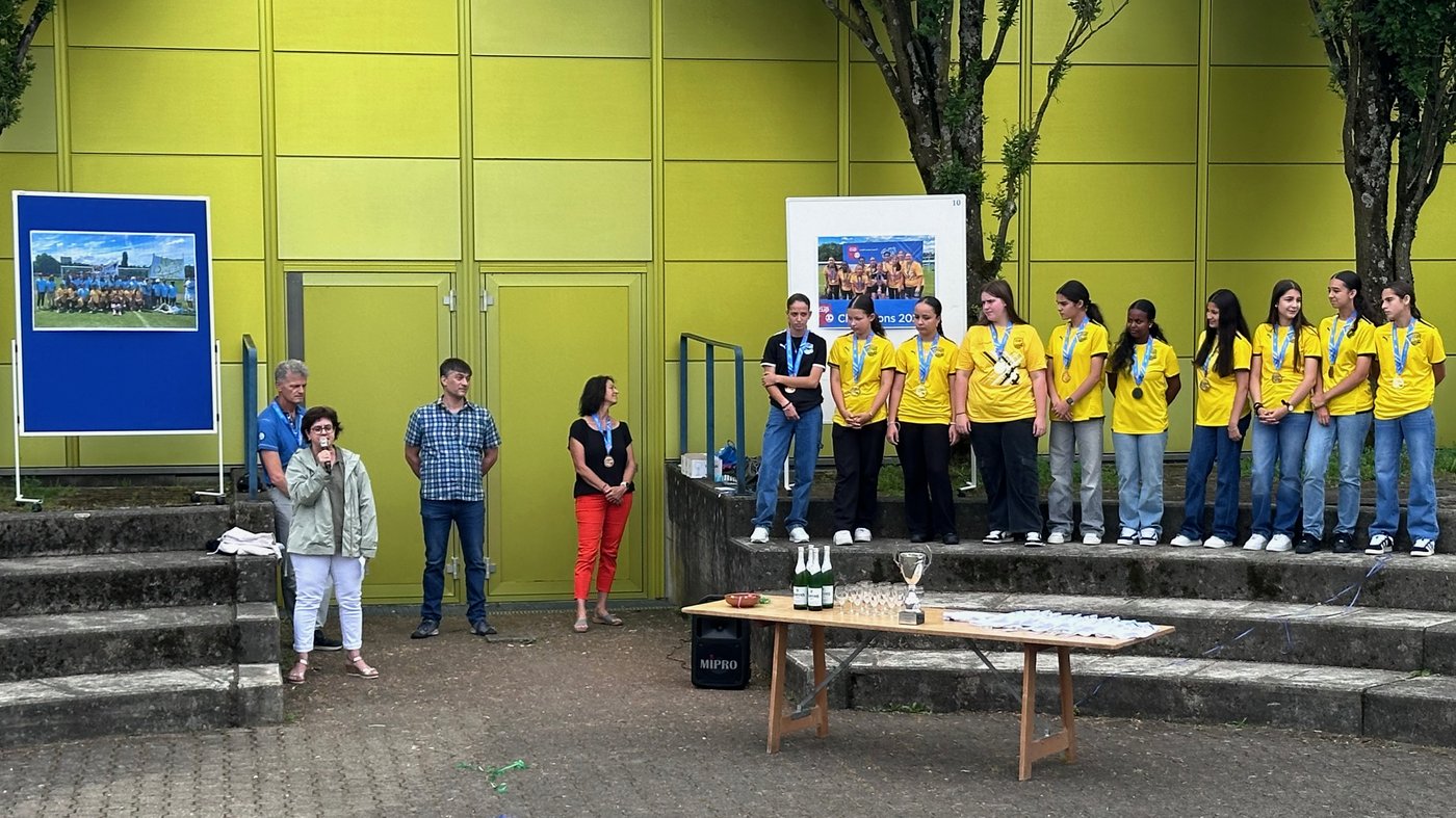 Die Schule Obersiggenthal ist stolz auf die Siegerinnen und feiert diese gemeinsam mit Frau Gemeindeammann Bettina Lutz in der grossen Pause.
