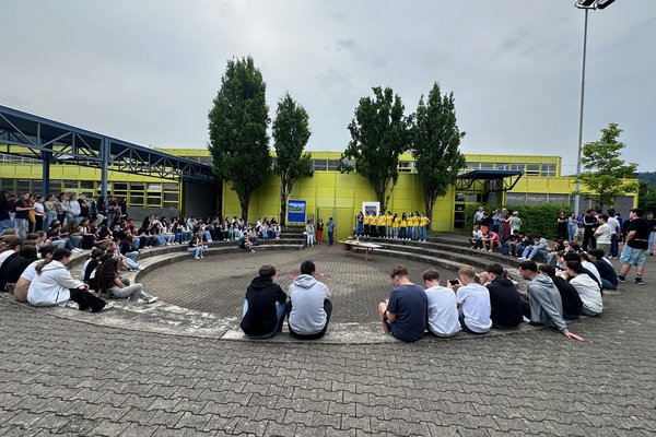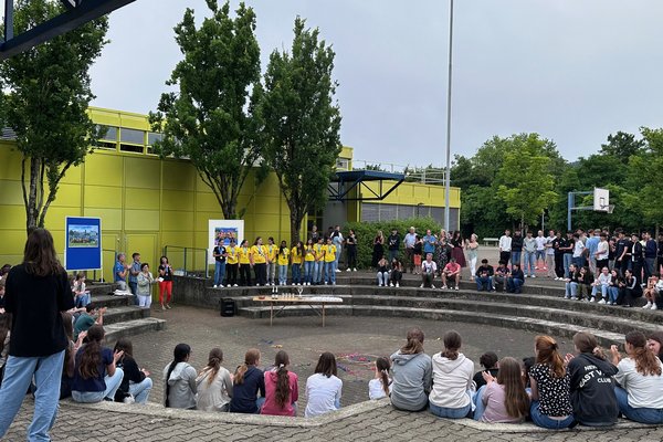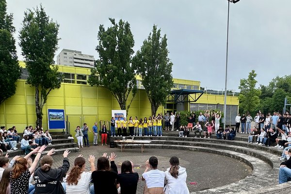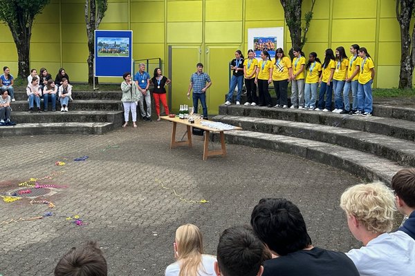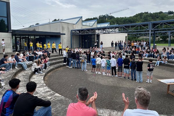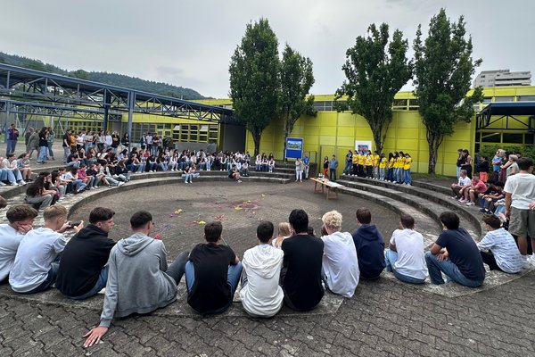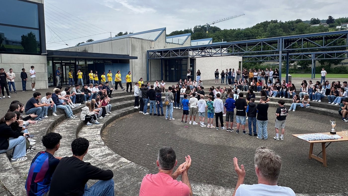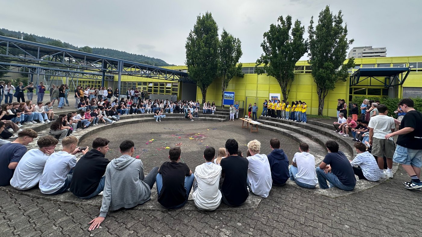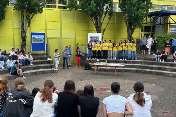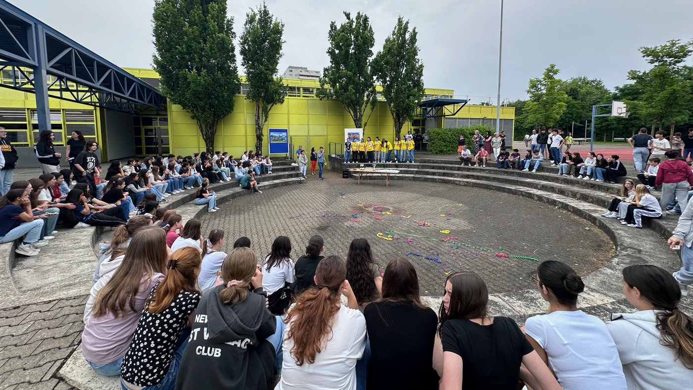 Die Schule Obersiggenthal ist stolz auf die Siegerinnen und feiert diese gemeinsam mit Frau Gemeindeammann Bettina Lutz in der grossen Pause.