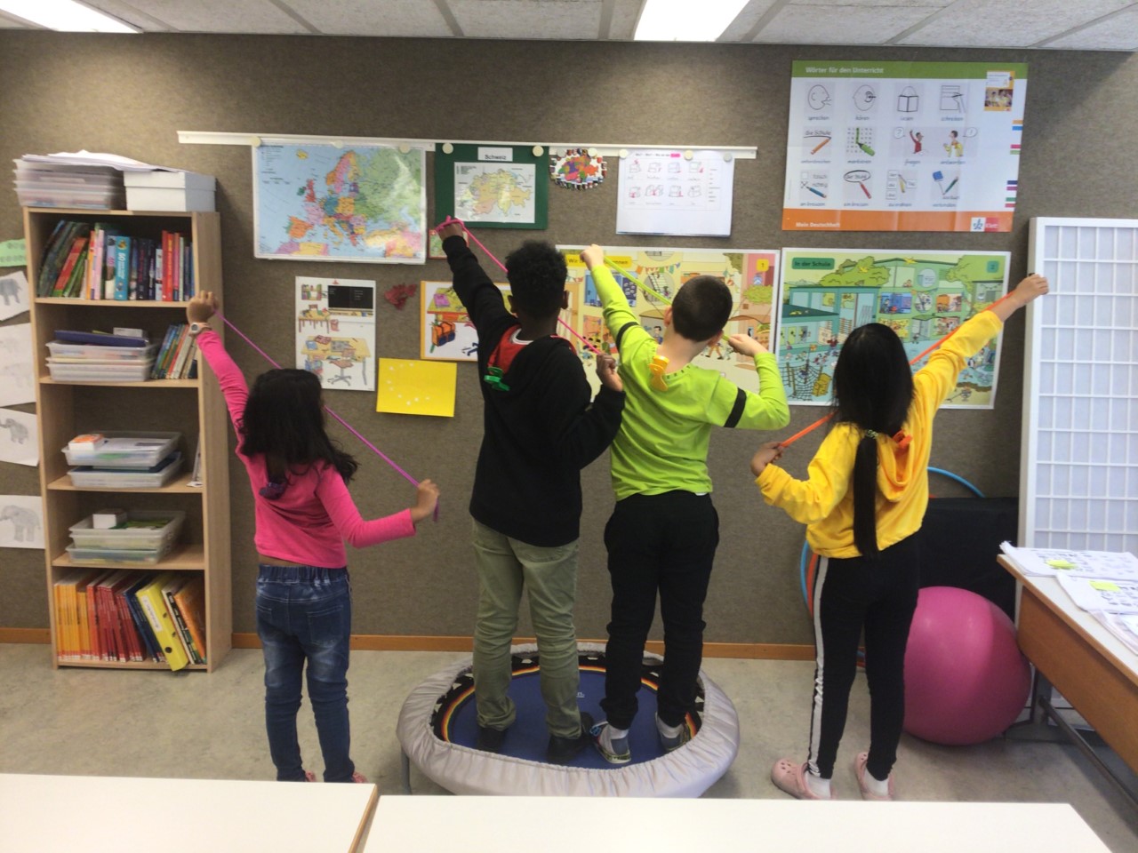 Auf dem Foto zu sehen: Kinder mit farbigen Gummibändern, Recordable Pags auf den Pullovern hinten und mit dem Trampolin.