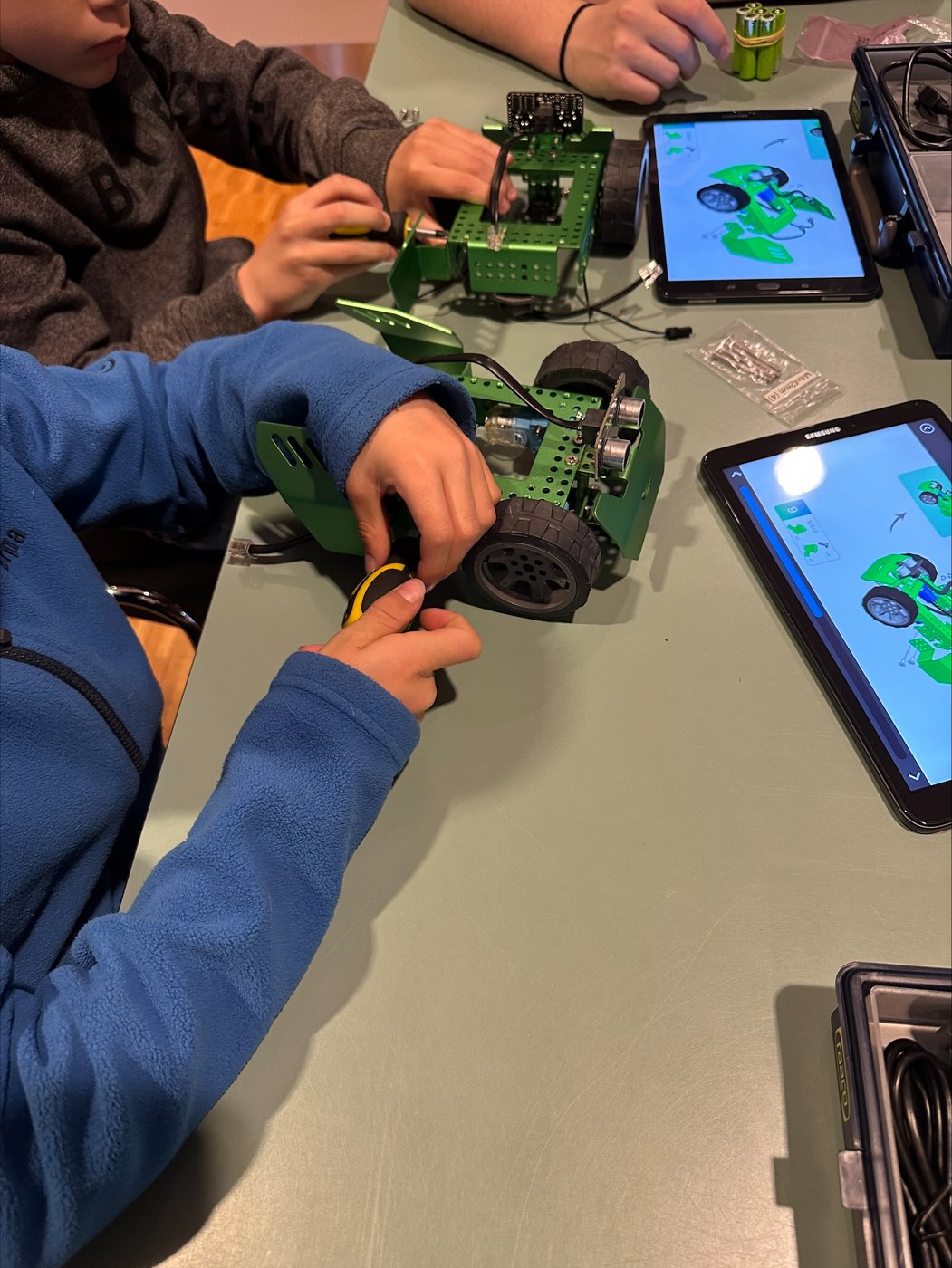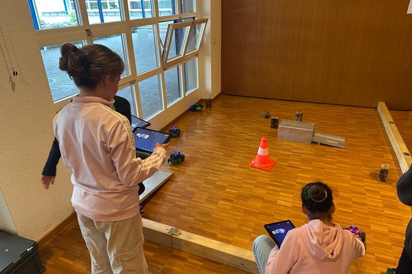 Schon beim Betreten des Technikraums lag Aufregung in der Luft – denn im Mittelpunkt stand der „Q-Scout“, ein kleines, motorisiertes Roboterauto, das von den Schülerinnen und Schülern eigenhändig zusammengebaut wurde. Mit viel Geschick, Geduld und Teamarbeit entstanden Schritt für Schritt fahrbereite Roboter, die anschliessend mithilfe von iPads und der bunten Programmiersprache Scratch programmiert wurden.