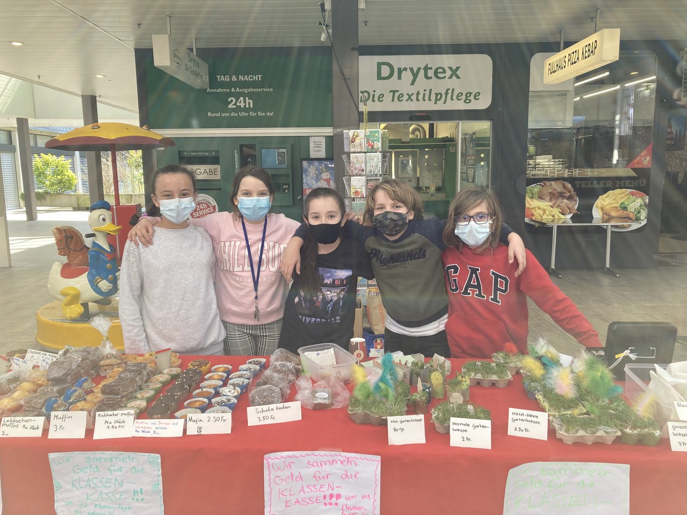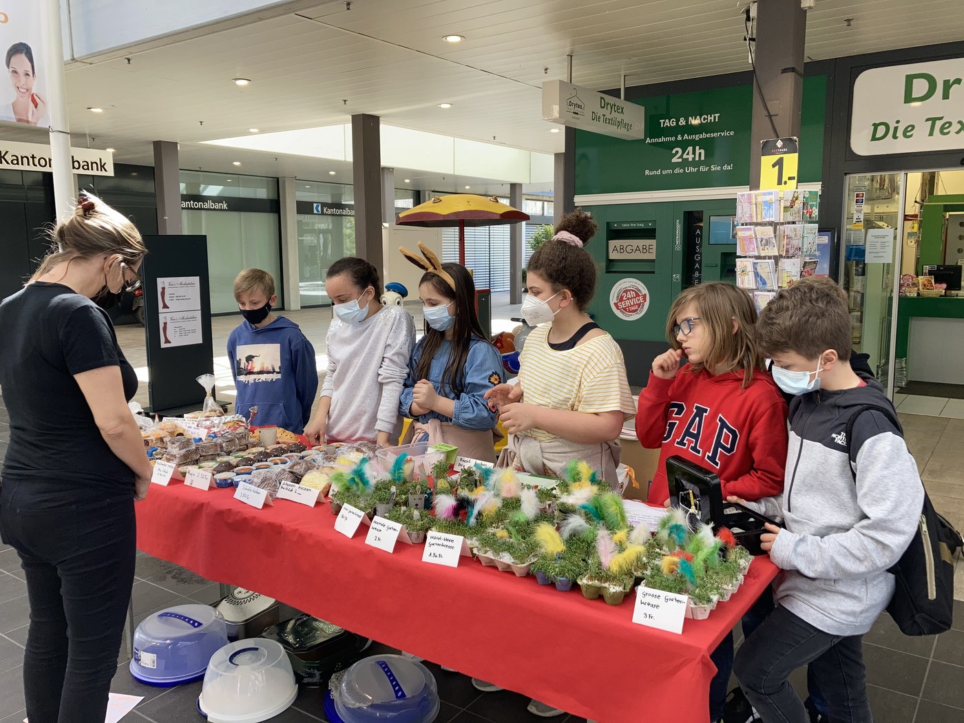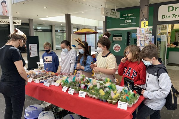 Am Tag vor dem Osterwochenende richteten die Klassen P4B und P4C auf dem Markthof einen Verkaufsstand ein, welcher reichlich mit Gebäck und gebastelten Ostersachen ausgelegt wurde. Das Ziel der Schülerinnen und Schüler war es, Geld für das bevorstehende, gemeinsame Klassenlager am Hallwilersee zu sammeln.