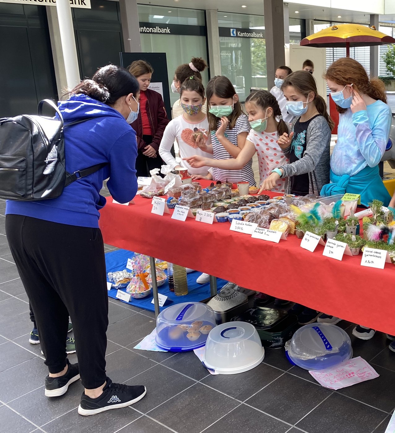Schon vor dem Verkaufstag zeigten die Schülerinnen und Schüler grosses Engagement, indem sie zu Hause Muffins, Kuchen und Cookies backten und diese Corona-konform einzeln verpackten. Am Gründonnerstag wurde dann nicht nur verkauft, sondern auch viel Werbung für den Stand gemacht. Aufgrund des starken Einsatzes der Schülerinnen und Schüler konnte am Ende des Tages eine hohe Summe auf das Lagerkonto überwiesen werden.