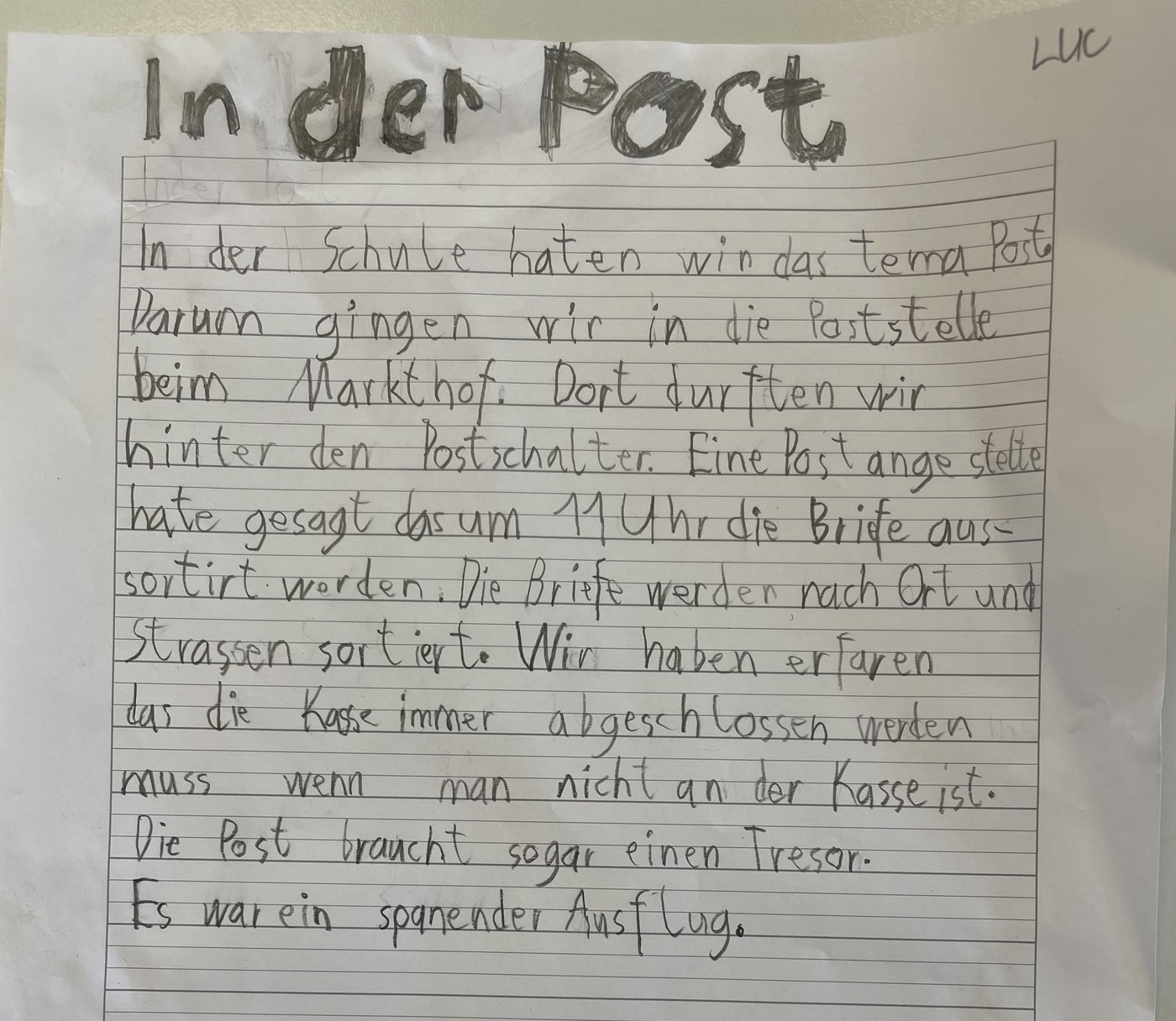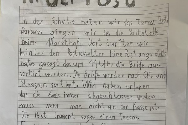 Daneben kreierten wir eigene Briefmarken, zeichneten Postautos und besuchten die Postfiliale im Markthof, worüber ein Schüler einen Bericht verfasste.