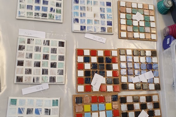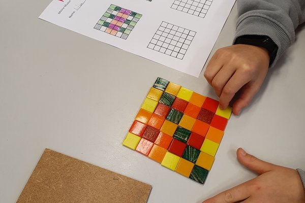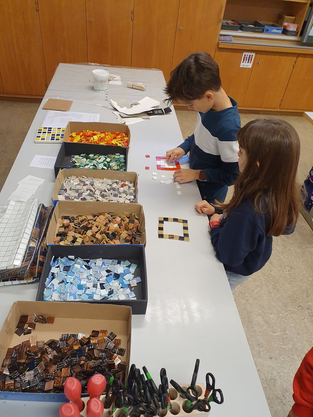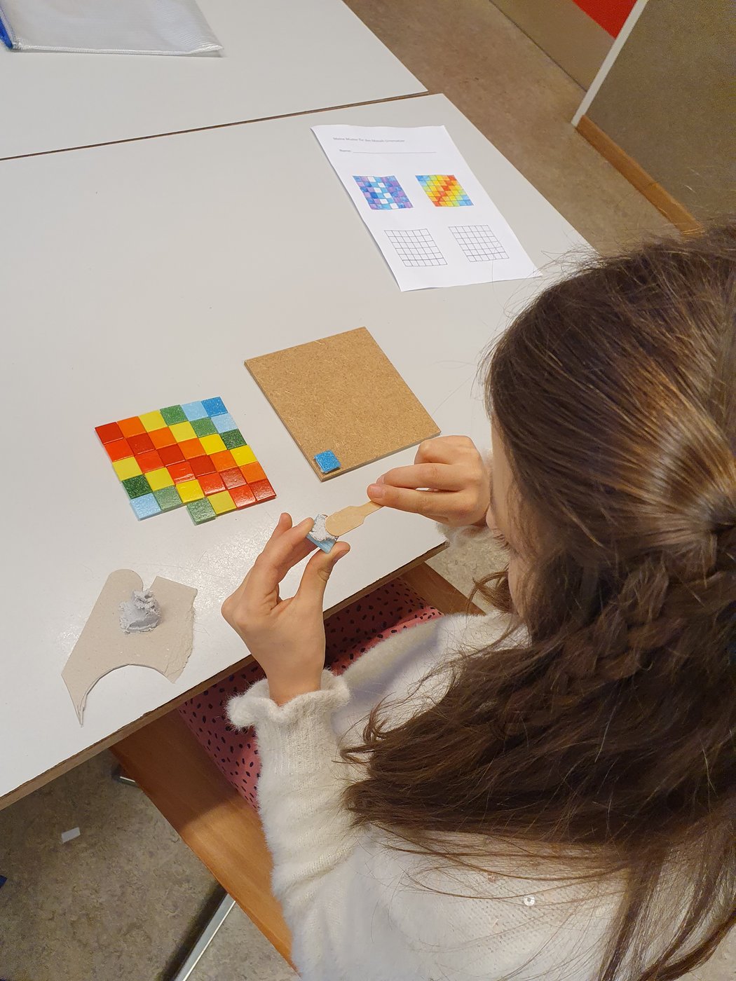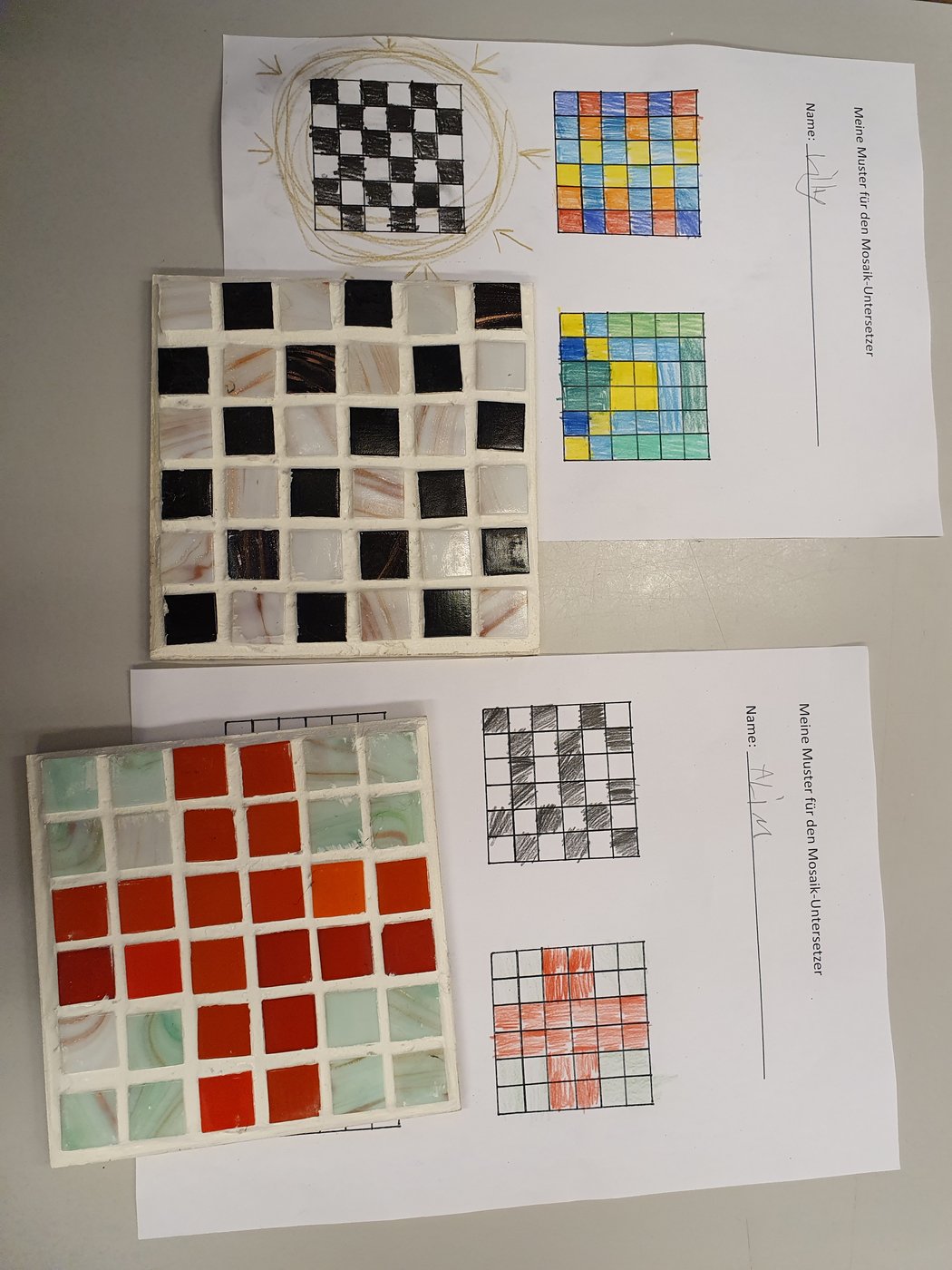 In der Woche darauf wurde dann das schönere Muster ausgewählt und mit Plattenkleber auf die Holzplatte geklebt. Als der Leim trocken war, konnten die Schülerinnen und Schüler eine Woche später ihr Mosaik fugen und vorsichtig reinigen. Wieder eine Woche später war dann alles soweit trocken, dass sie das Mosaik fertig reinigen und polieren konnten, bis es schön glänzte.
