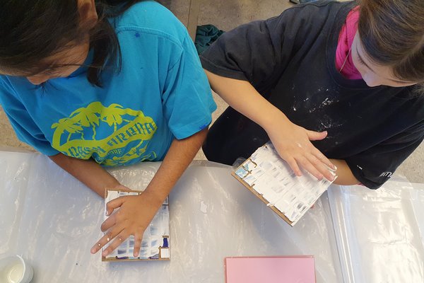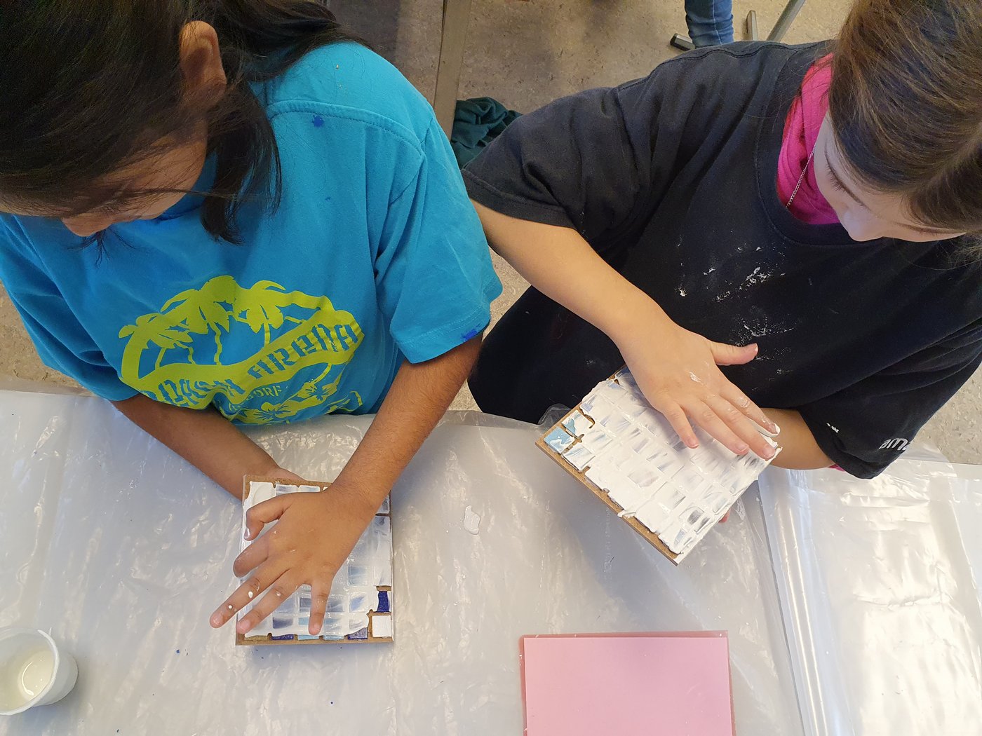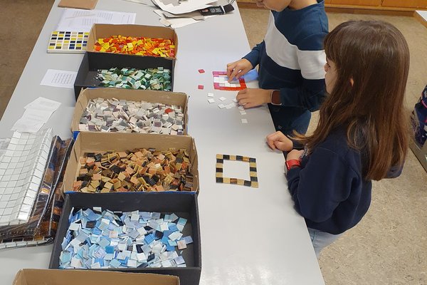 Die Schülerinnen und Schüler der Klasse P3d lernten die Arbeit eines Plattenlegers kennen, in dem sie aus einem Holzbrett und Mosaiksteinen aus Glas einen Untersetzer fertigten.