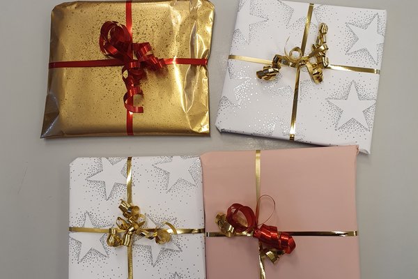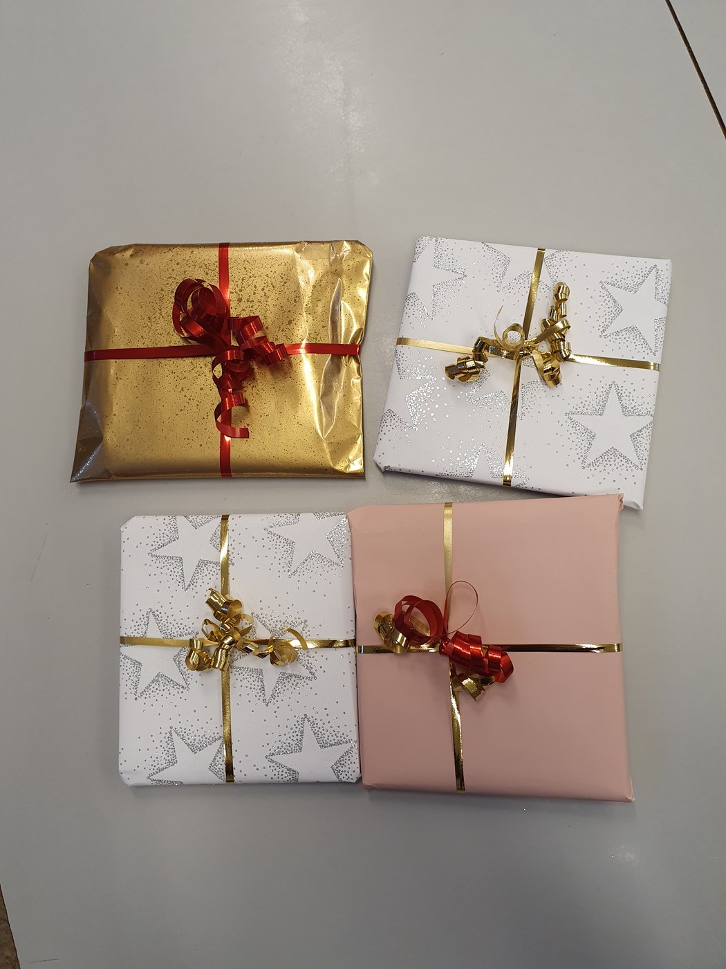 Zum Schluss packten die Kinder ihr Weihnachtsgeschenk schön ein und lernten, wie die Geschenkbänder mit der Schere gekringelt werden.