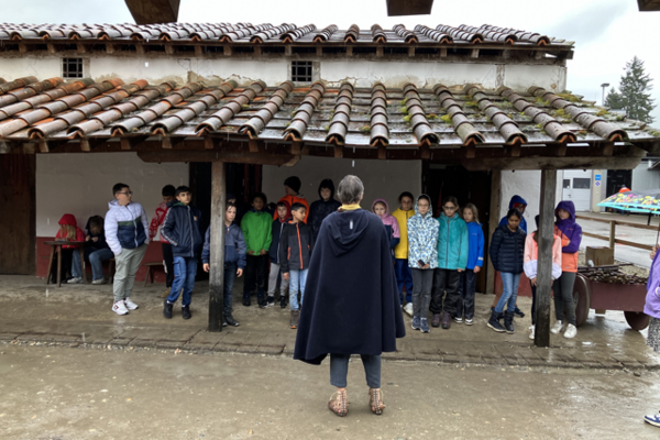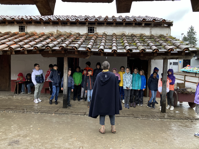 Leider spielte das Wett gar nicht mit und es regnete schon bei der Hinreise. Auch im Verlauf des Morgens wurde es nicht besser, sondern schlimmer. Trotz schwindender Motivation standen die Kinder in ihren Tuniken im Regen, marschierten und übten Befehle auszuführen, sowie den Umgang mit pilum (Speer), scutum (Schild) und gladius (Schwert). Nach dem Workshop hatte sich die Klasse ihr Picknick redlich verdient. Durchnässt und durchgefroren, sassen alle unter dem Vordach des Museums.
