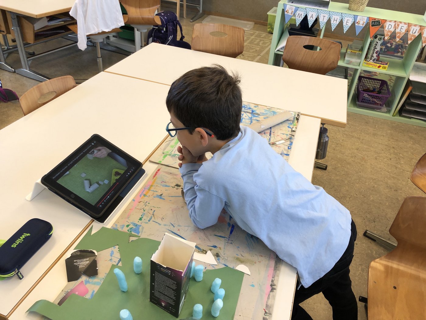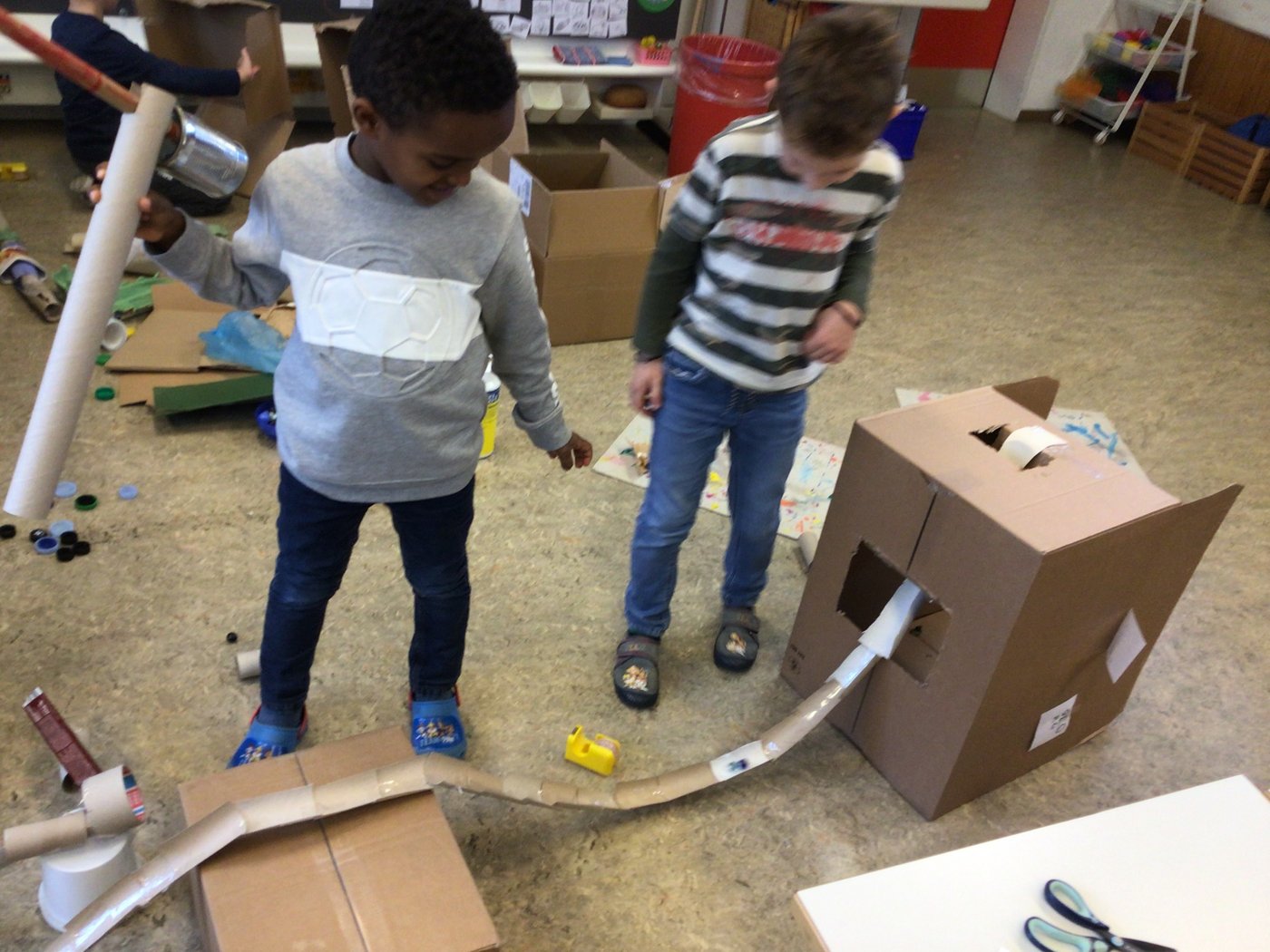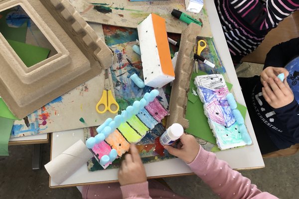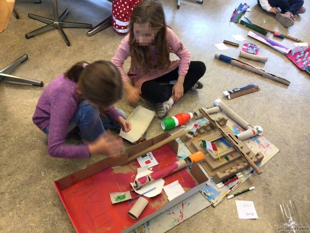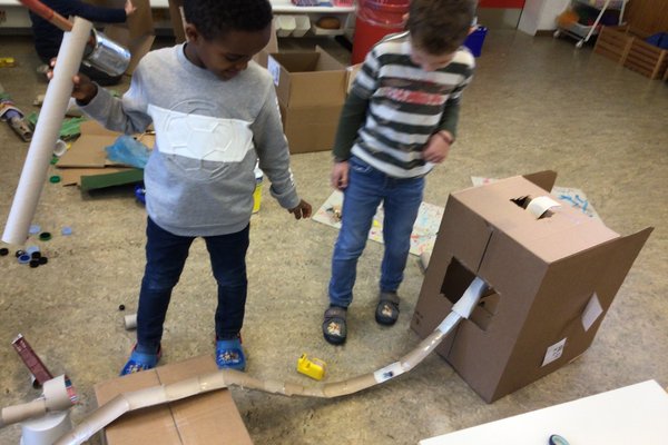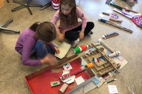 Nachdem sich die Kinder auf dem iPad über den Bau und die Konstruktion einer Murmelbahn informieren und Inspirationen holen konnten, begann bereits die Umsetzung der eigenen Murmelbahn. Dazu benutzten die Kinder verschiedene Materialien wie Karton, Papier, Styropor, PET-Flaschen usw., welche sie teilweise sogar von zu Hause mitbrachten. Nach einer ersten Phase der Umsetzung besprachen und ergründeten die Kinder zusammen, worauf es beim Bau einer funktionierenden Murmelbahn ankommt. Somit entstanden durch diesen Austausch weitere tolle Ideen, welche die Schülerinnen und Schüler kreativ umsetzten.