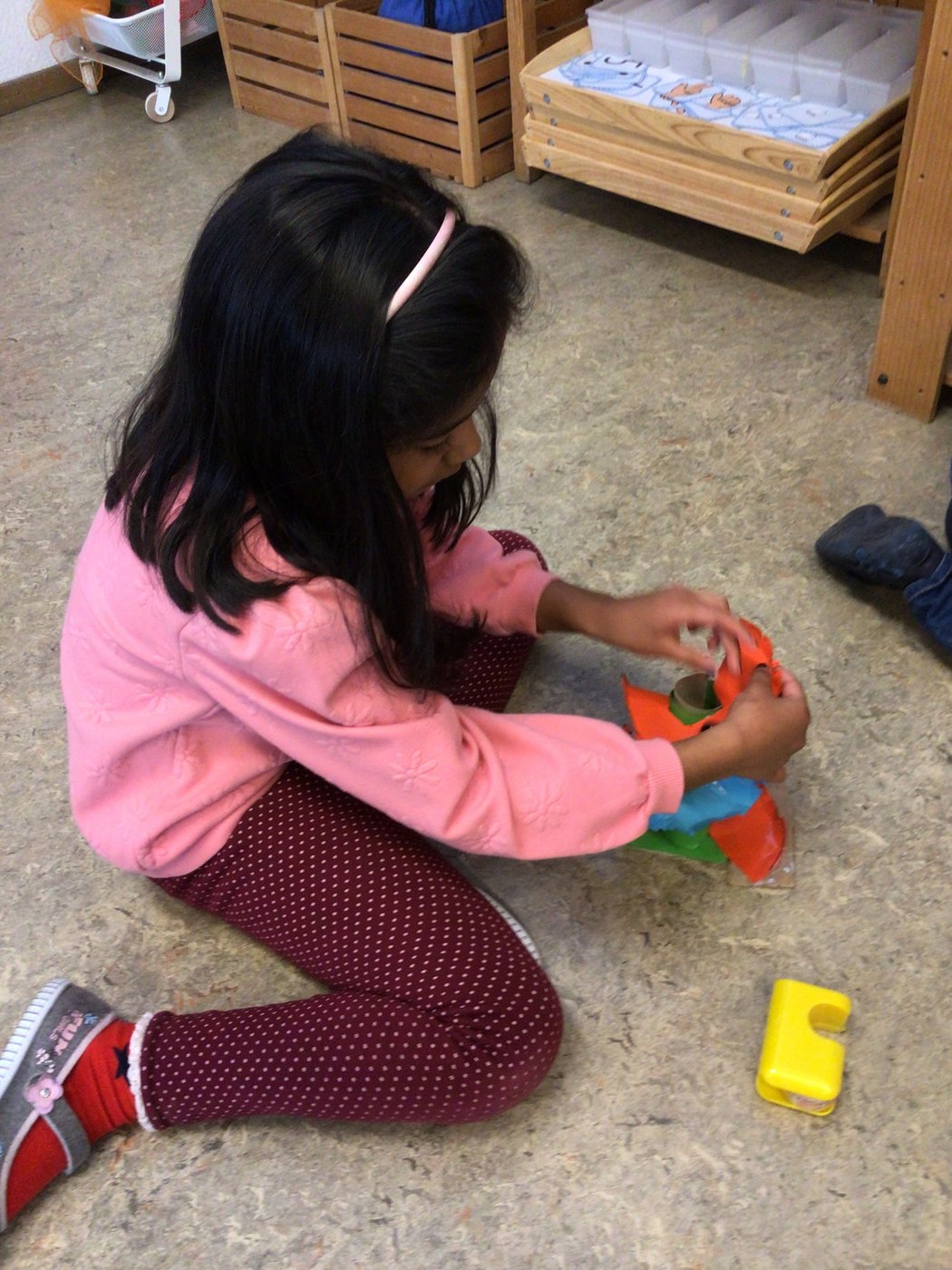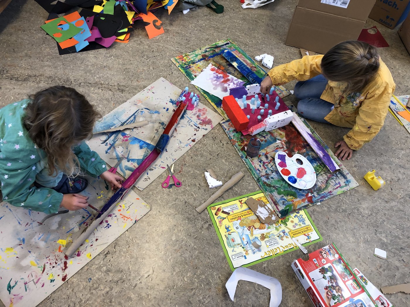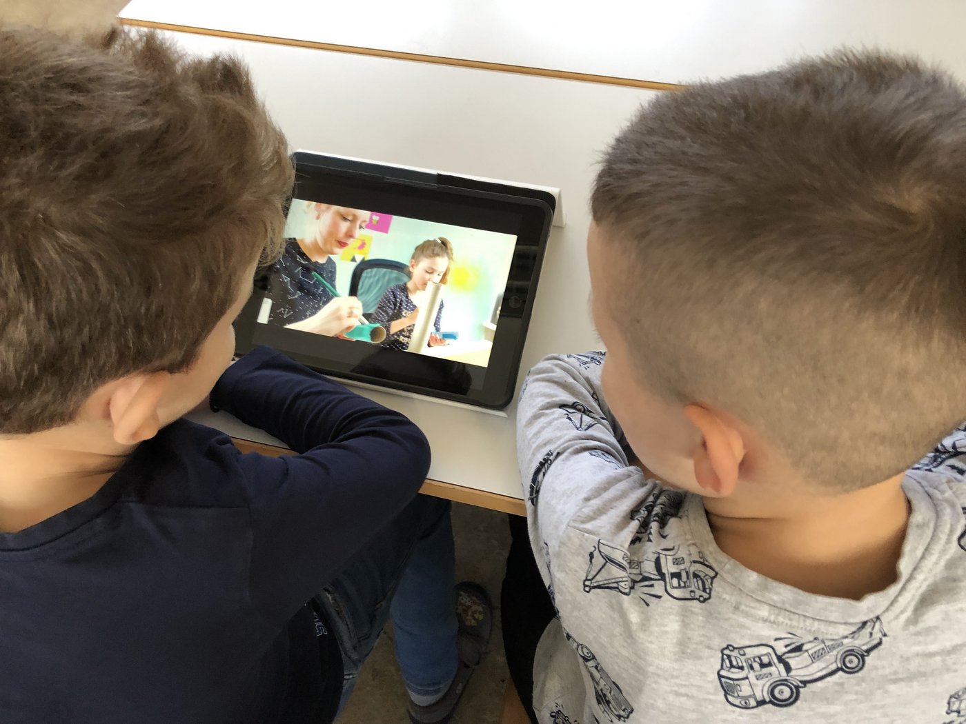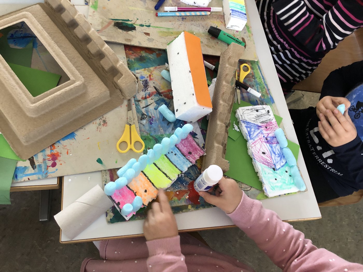 Nachdem sich die Kinder auf dem iPad über den Bau und die Konstruktion einer Murmelbahn informieren und Inspirationen holen konnten, begann bereits die Umsetzung der eigenen Murmelbahn. Dazu benutzten die Kinder verschiedene Materialien wie Karton, Papier, Styropor, PET-Flaschen usw., welche sie teilweise sogar von zu Hause mitbrachten. Nach einer ersten Phase der Umsetzung besprachen und ergründeten die Kinder zusammen, worauf es beim Bau einer funktionierenden Murmelbahn ankommt. Somit entstanden durch diesen Austausch weitere tolle Ideen, welche die Schülerinnen und Schüler kreativ umsetzten.