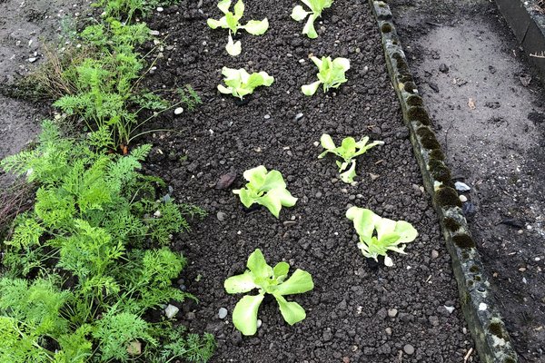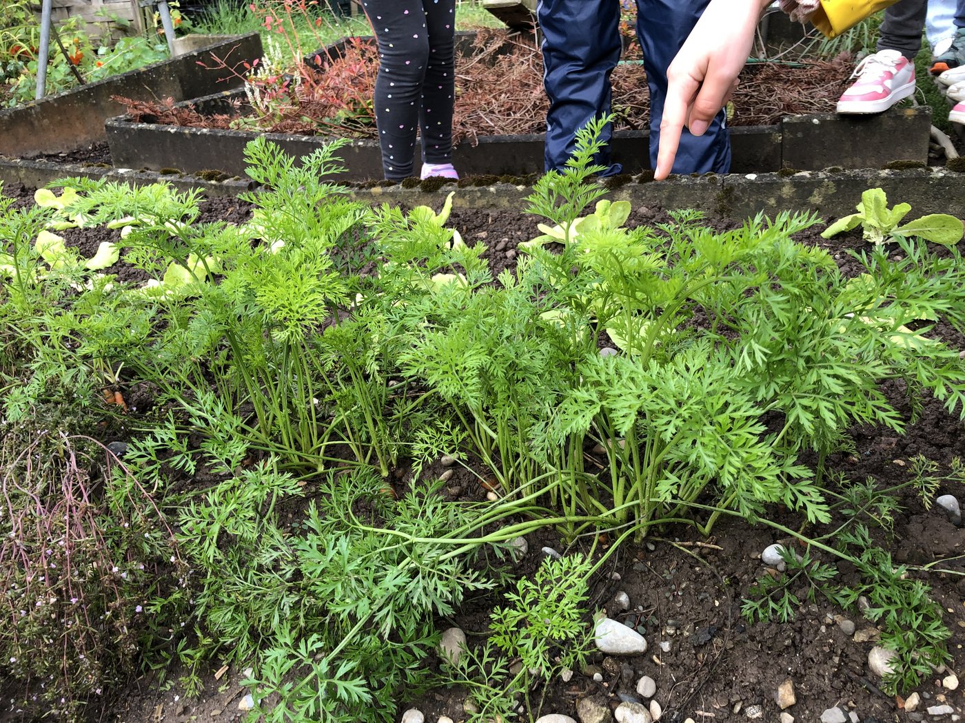 Wir entdeckten viele Gemüsesorten, wie zum Beispiel Tomaten, Karotten, Lauch, Kohlrabi, Bohnen, Salat, Gurken, Fenchel und vieles mehr. Es gab auch einige Obstbäume mit reifem Obst.
