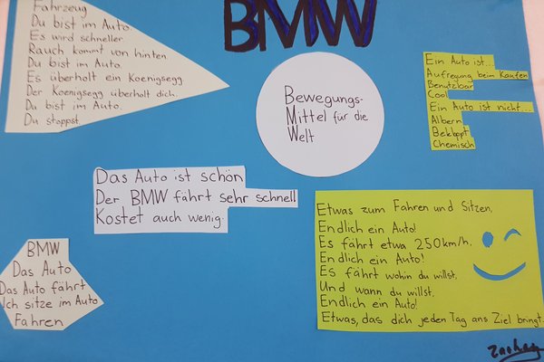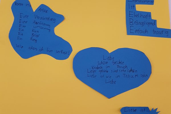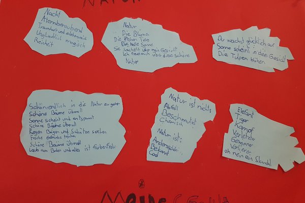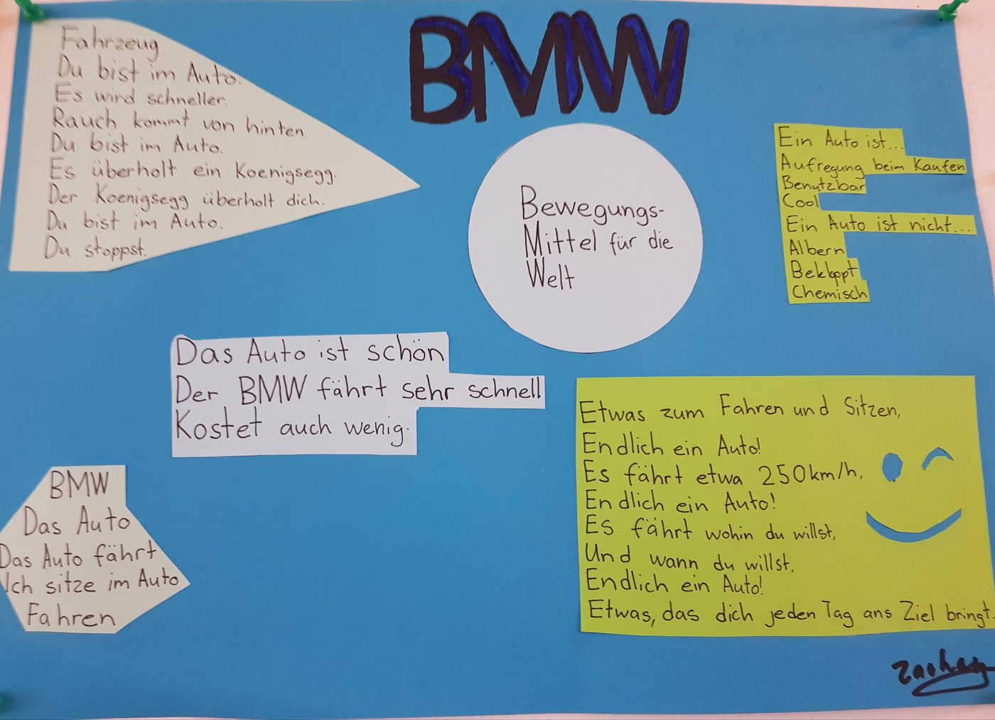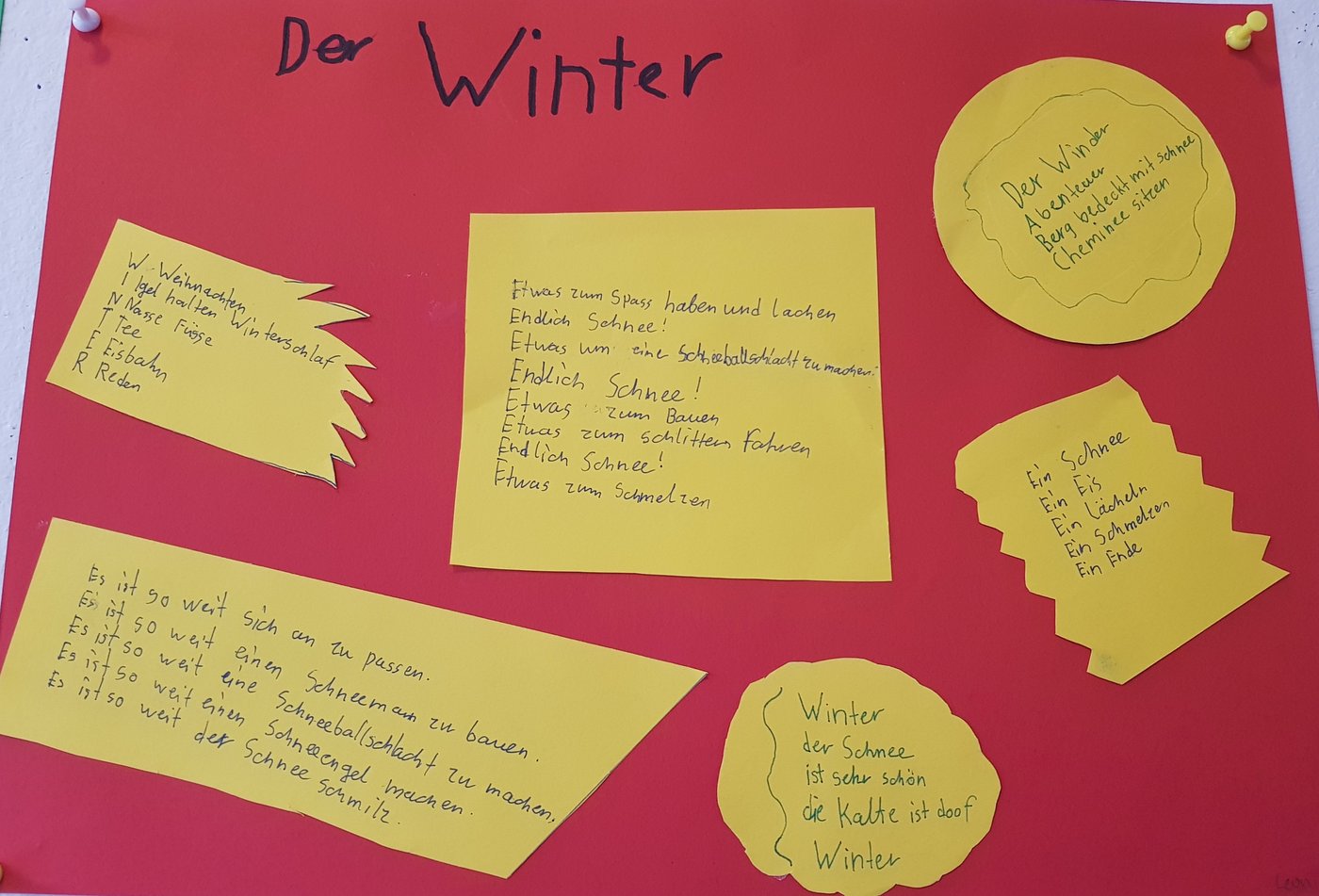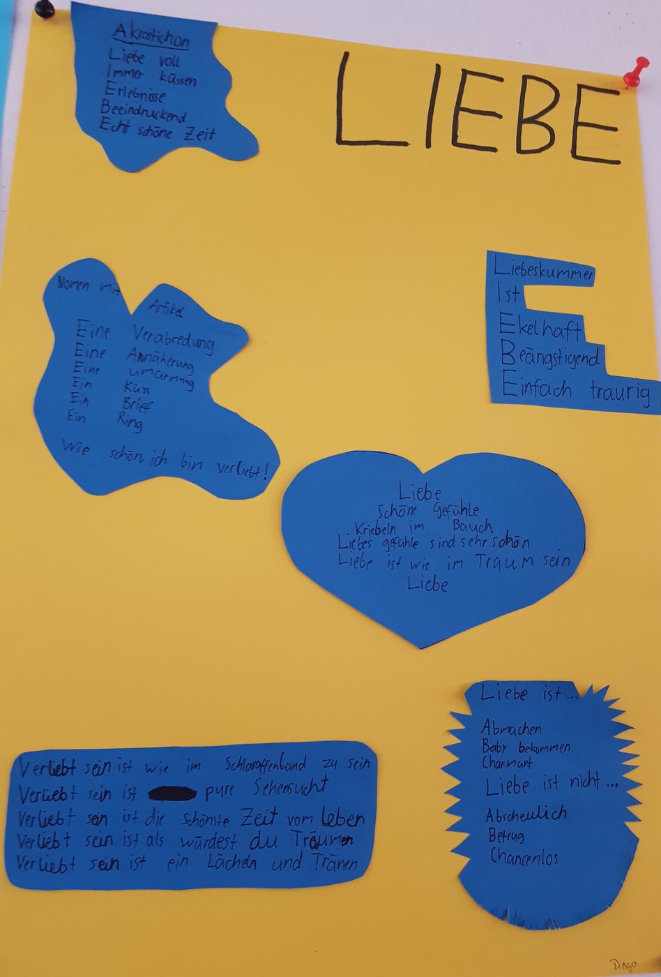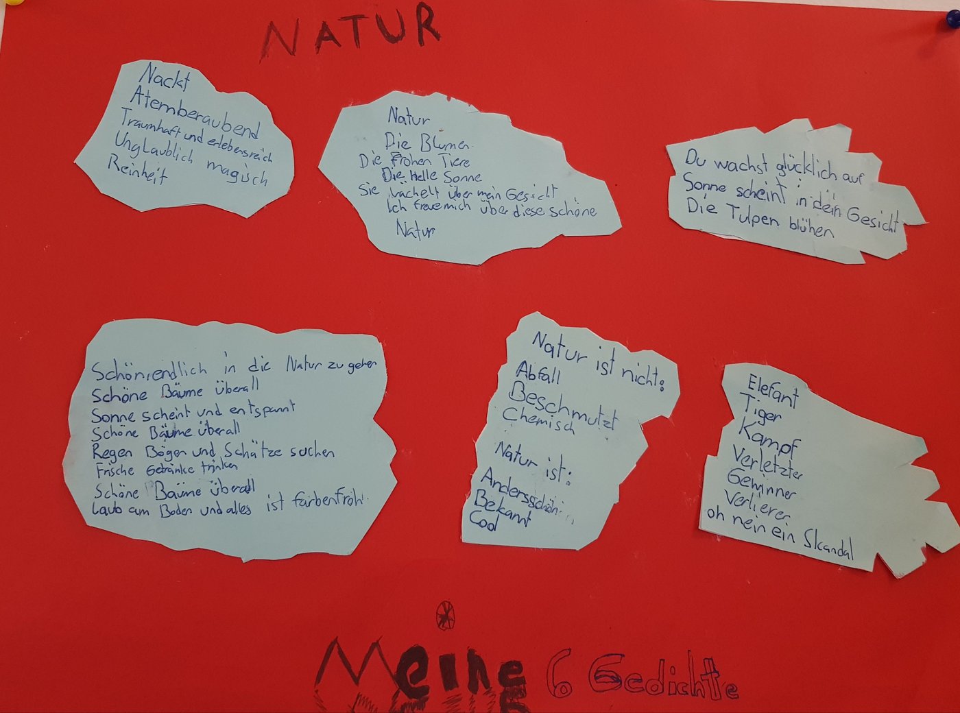Unter dem Thema "Gedichte schreiben" hat sich jeder ein Thema überlegt und dazu Gedichte in sechs verschiedenen Gedichtformen, wie z. B. Rondell und Akrostichon, geschrieben. Am Anfang war es für uns eine kleine Herausforderung, aber mit der Zeit waren wir drin.