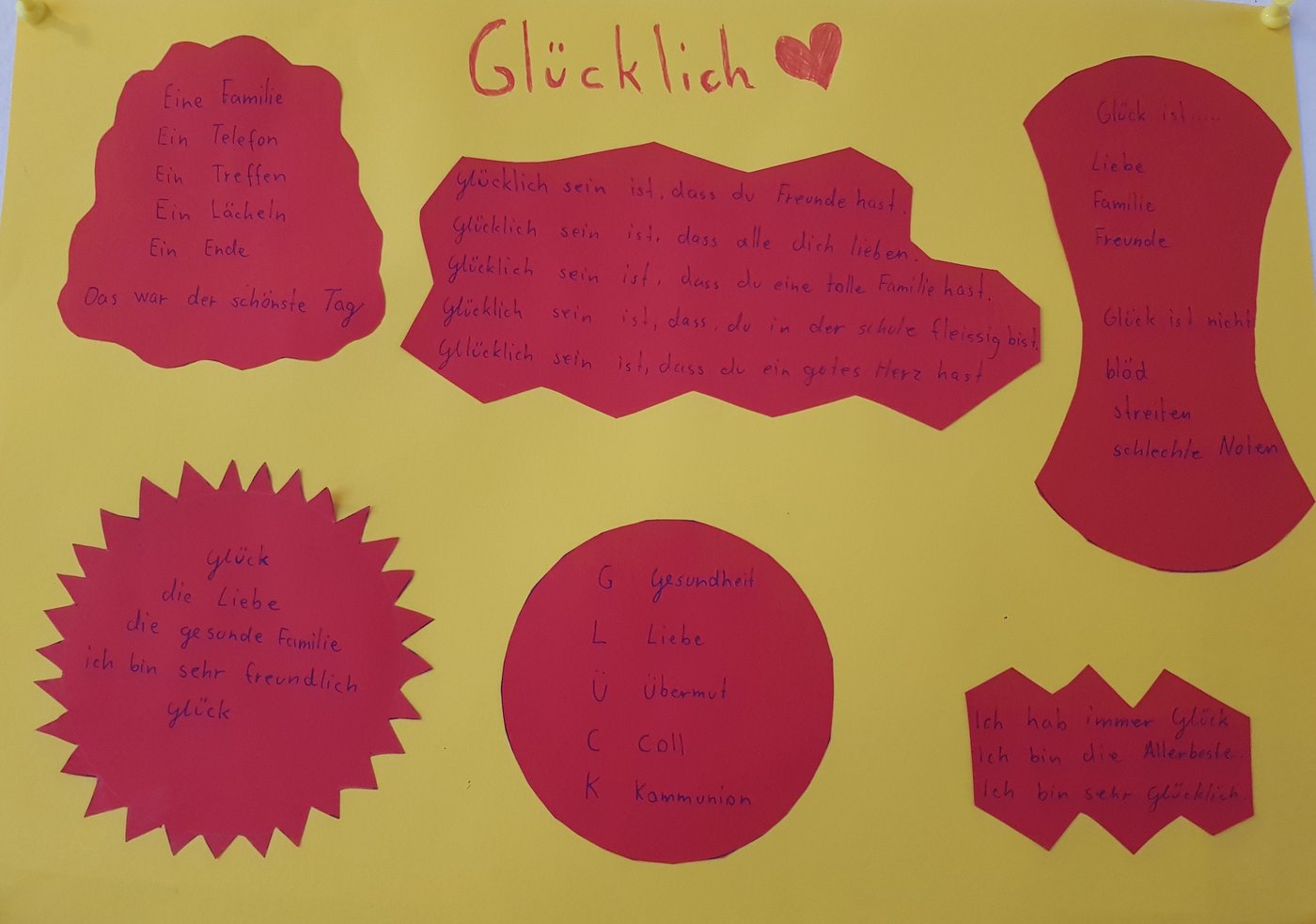 Als wir fertig waren, haben wir die einzelnen Gedichte auf Blätter geschrieben und diese auf ein farbiges A3 Blatt geklebt.