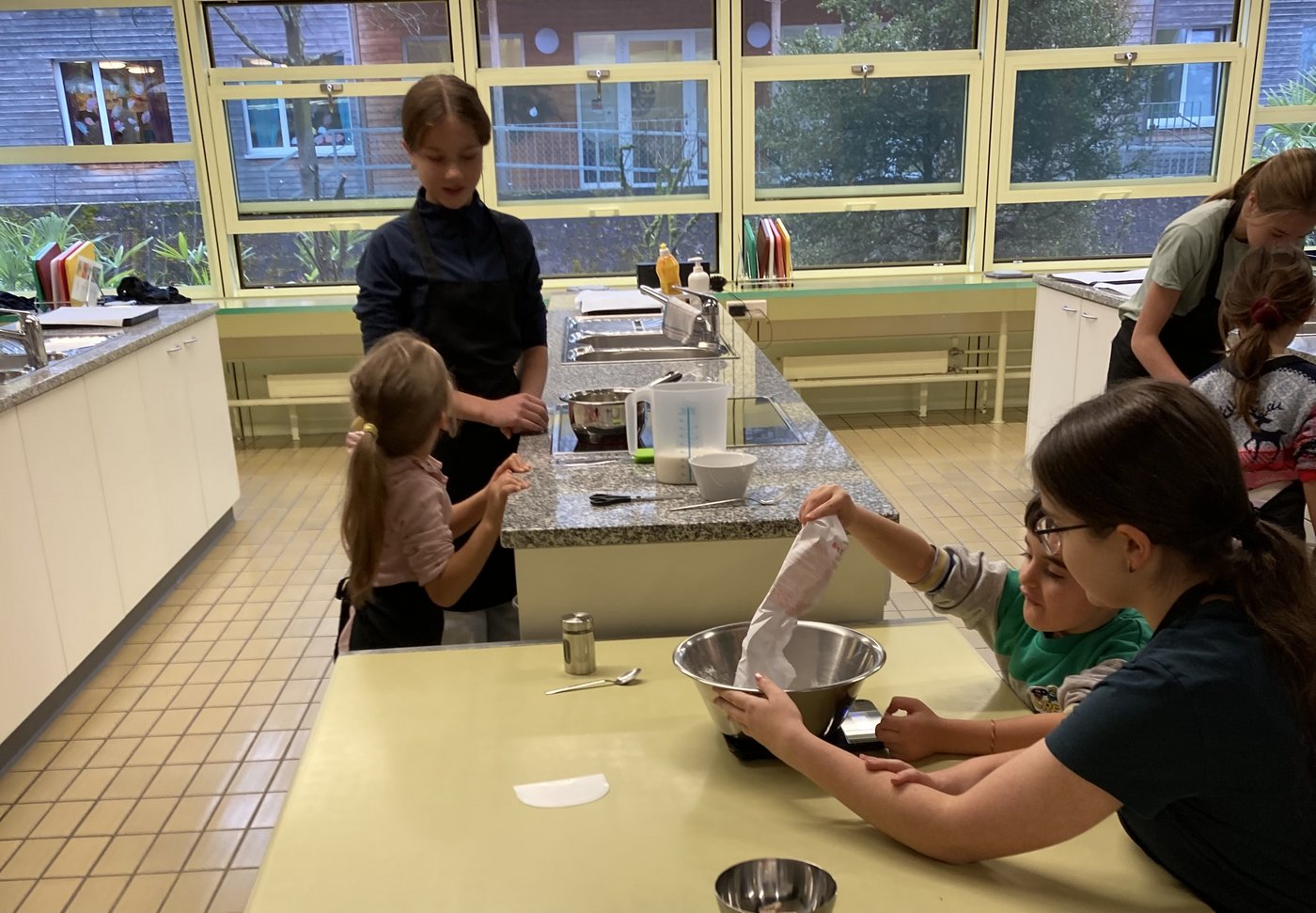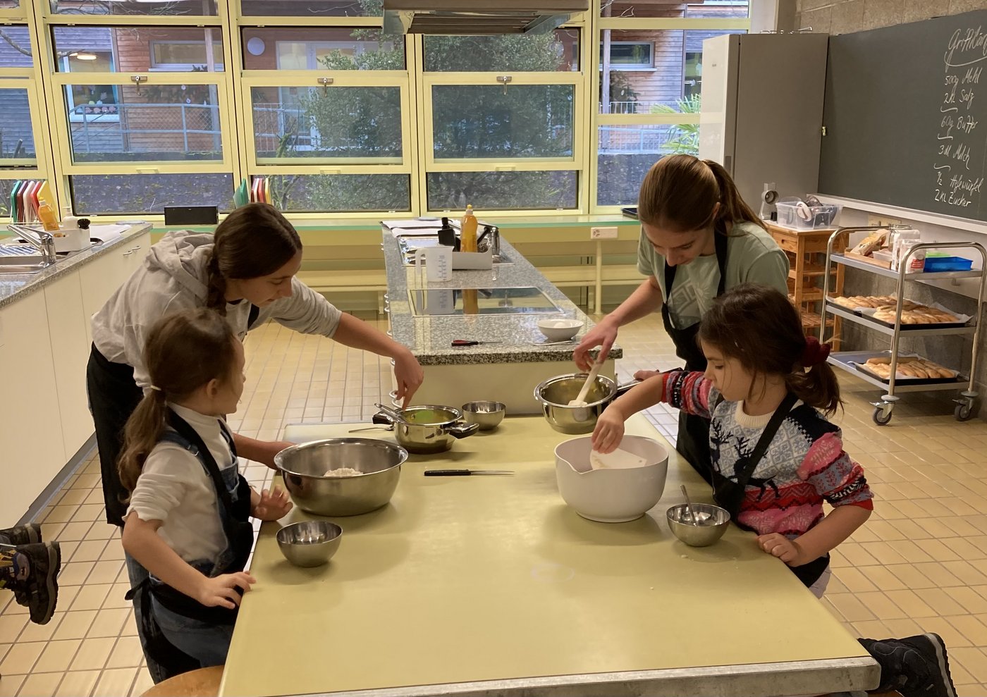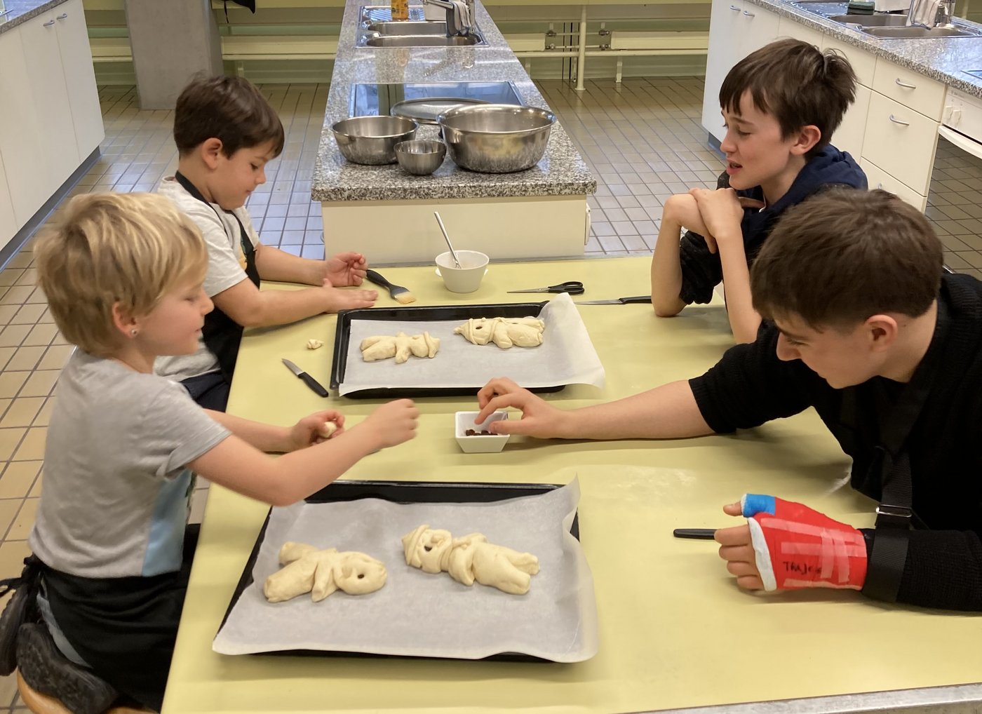 Im Dezember trafen sich die Zweitkindergartenkinder des KIGA Nuechtal 1mit den Schülerinnen und Schülern der B2a in der Kochschule. Die Oberstufenschülerinnen und -schüler leiteten die Kindergartenkinder mit viel Geduld und Können an, sodass aus den Grundzutaten wunderbar individuelle Grittibänze entstehen durften.