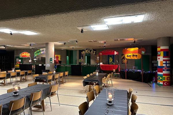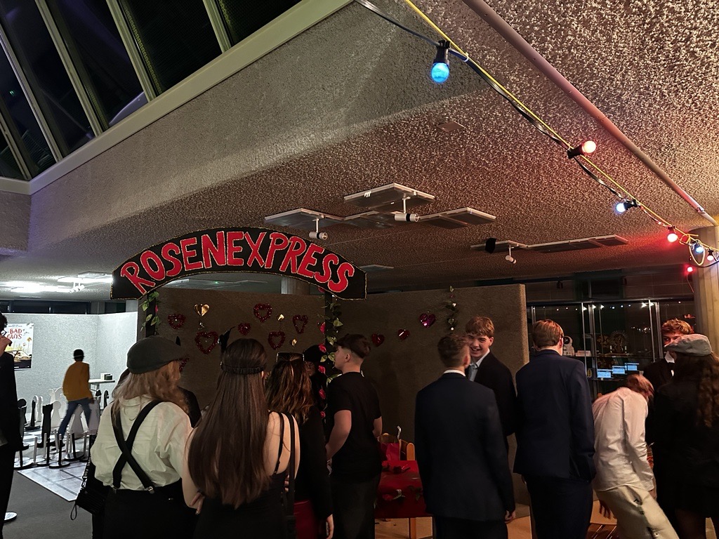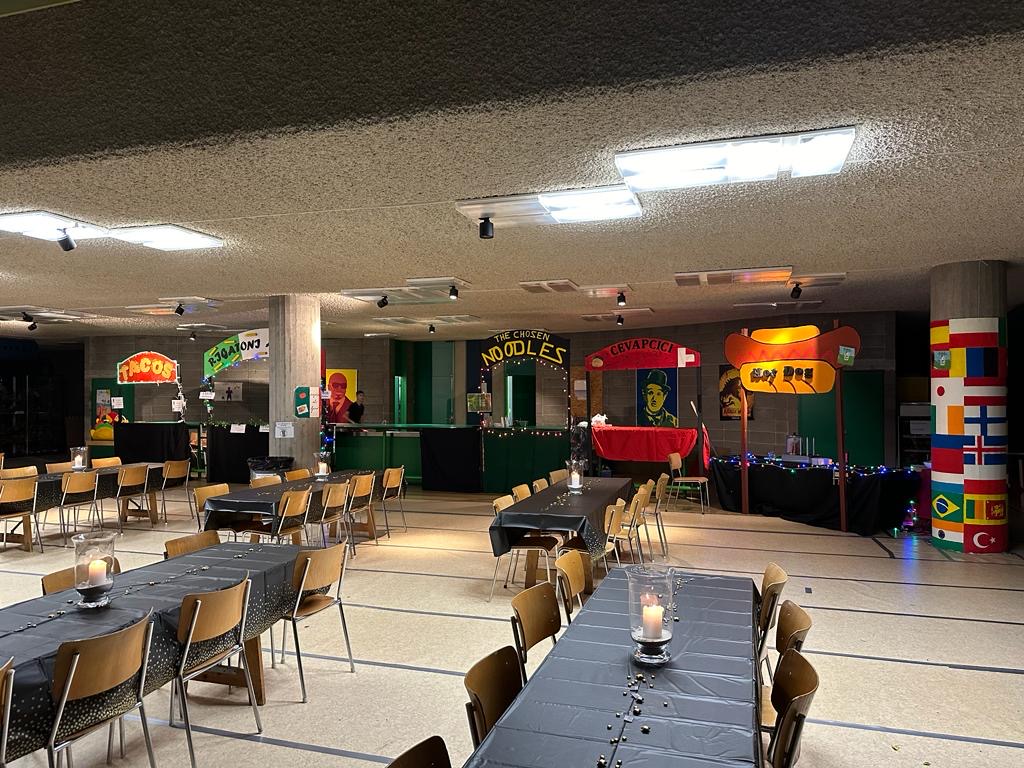 Das Schulhaus wurde auf verschiedenste Arten dekoriert und geschmückt. Man fand überall etwas anderes. An den Wänden waren Plakate aufgehängt mit den Essens- und Spielangeboten. Im Foyer befanden sich die Essensstände, bei denen man viele Gerichte aus den verschiedensten Ländern ausprobieren konnte. Den Schülerinnen und Schülern gefiel die grosse Auswahl sehr. Im oberen Stock des Schulhauses befanden sich die Unterhaltungsstände, unter anderem Mariokart, Just dance, eine Photobooth, Fussball und ein Quiz-Duell. Man sah, wie die Schülerinnen und Schüler sich dort mit ihren Freunden amüsierten. Sie tanzten, sangen, machten bei Wettbewerben mit und so weiter. Auch ein Highlight für die Schülerinnen und Schüler war der Rosenexpress, bei dem man eine Rose anonym verschicken konnte.