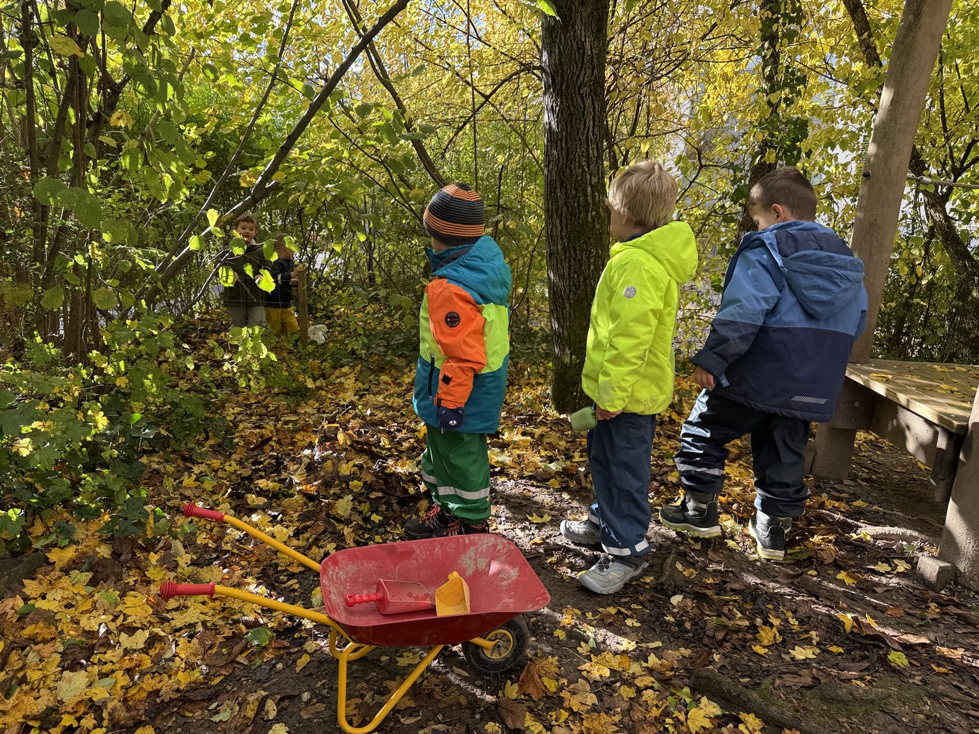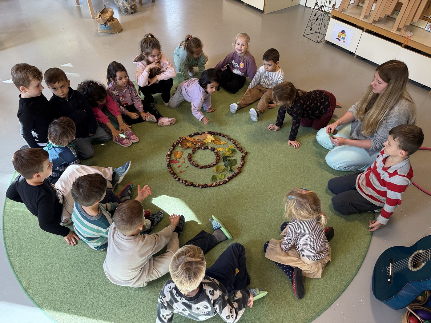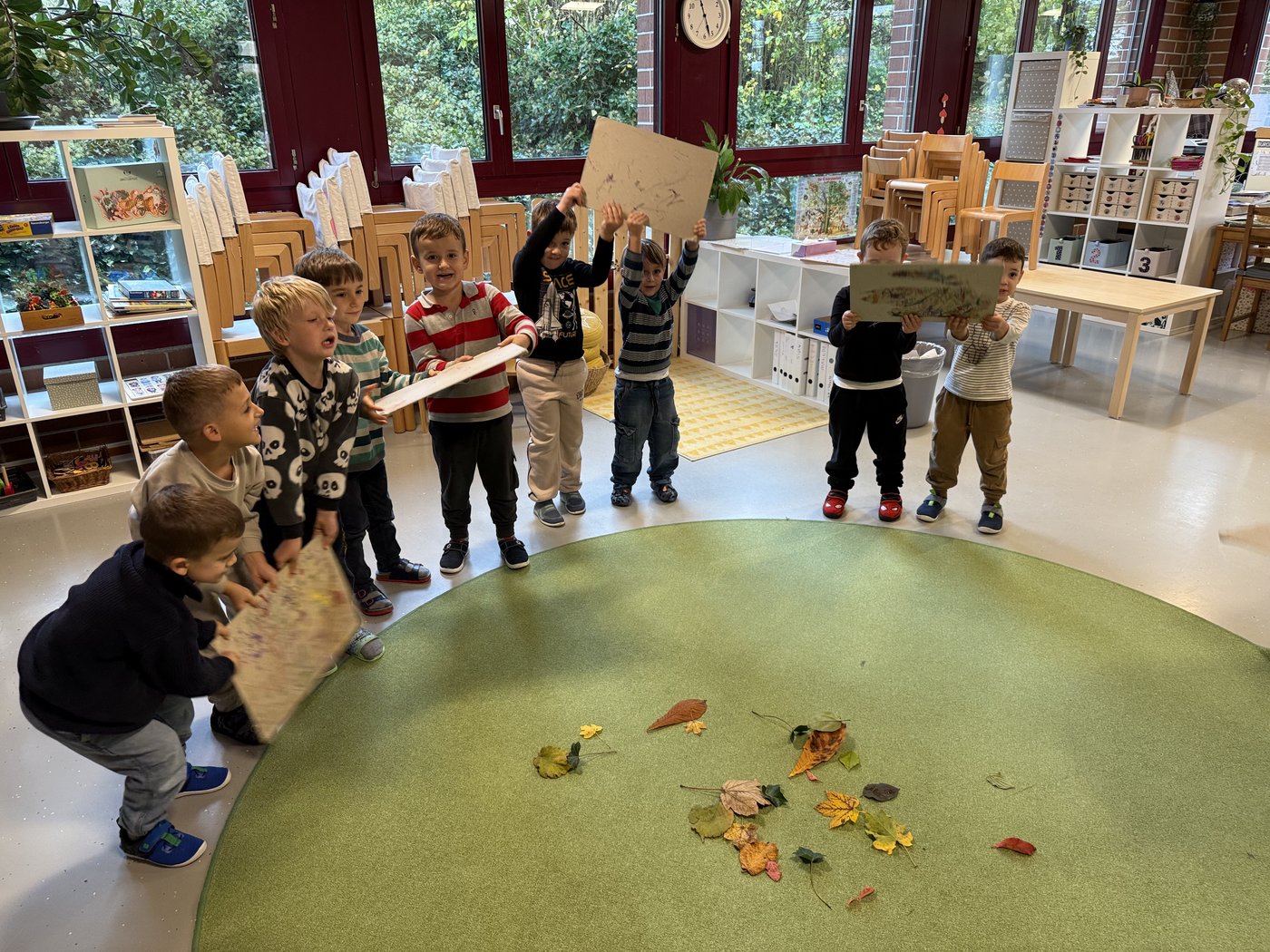 Trotz des stürmischen Herbstwetters geniessen die Kinder das Spielen und Entdecken im Freien. Unter den Blättern verstecken sich spannende kleine Tiere, die genaustens inspiziert werden. Auch ein Igelhotel darf im Kindergarten nicht fehlen. Fleissig werden dafür Blätter, Nüsse, Kastanien und andere Naturschätze gesammelt und zu einem Haufen zusammengetragen. Die besonders schönen Kastanien und Blätter werden im Kindergarten für Spiele und Legefiguren eingesetzt. Der Unterricht im Herbst – stürmisch, nass, farbenfroh und spannend in all seinen Facetten.