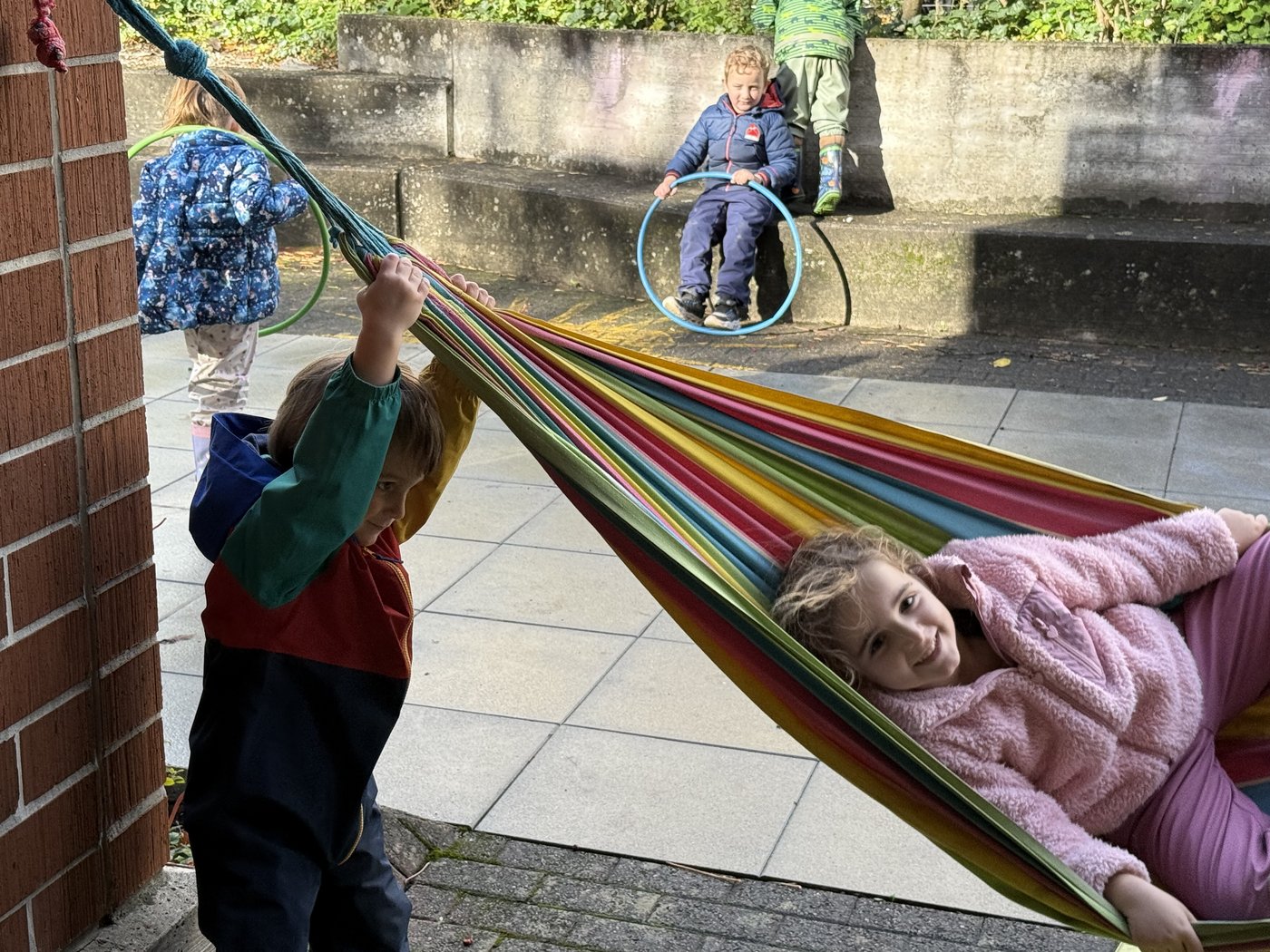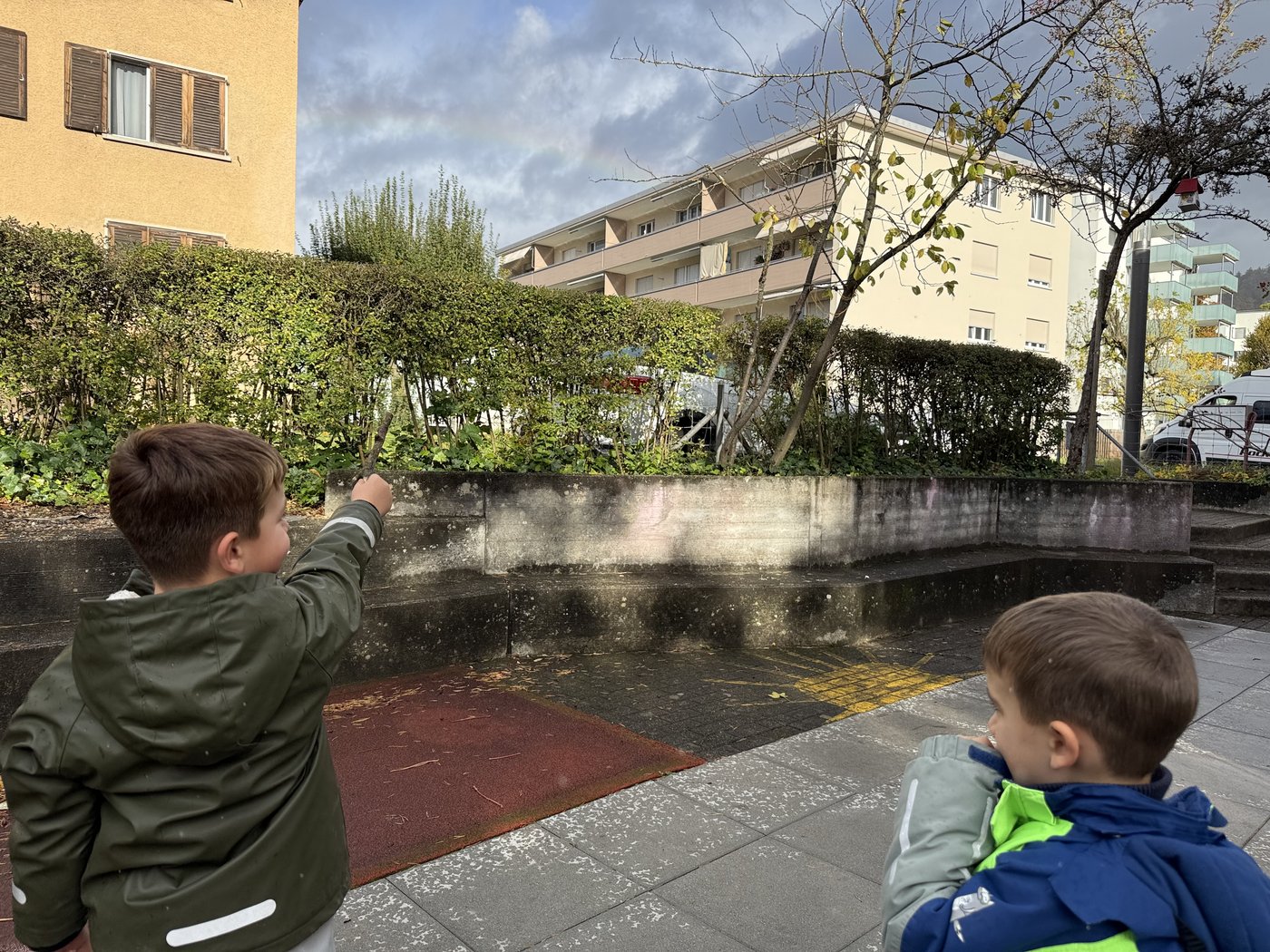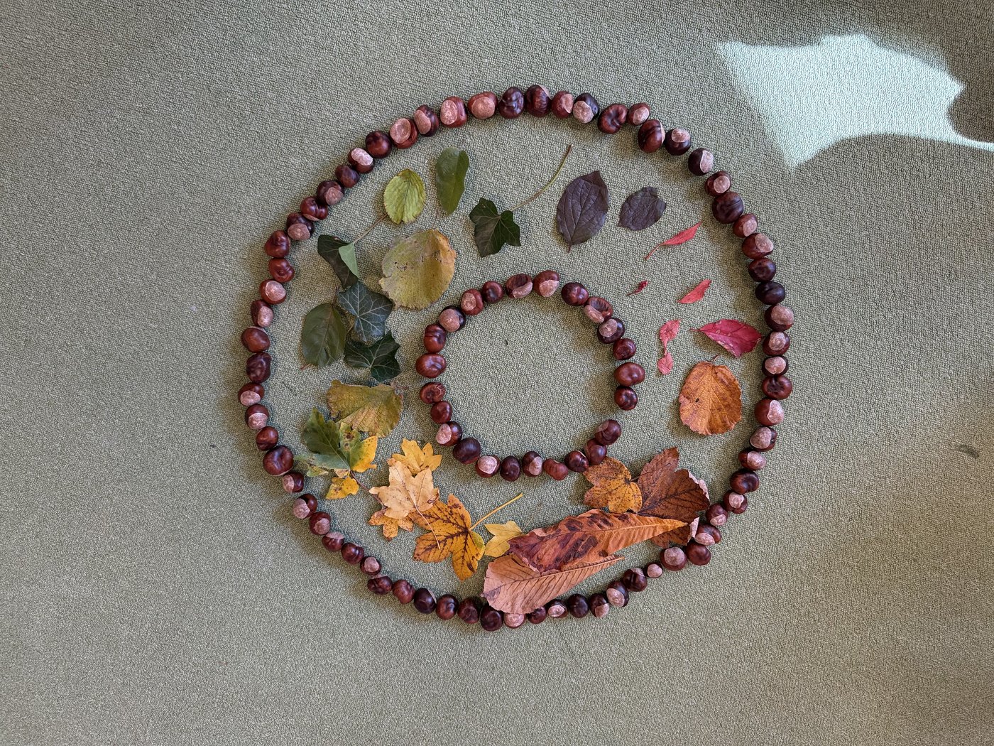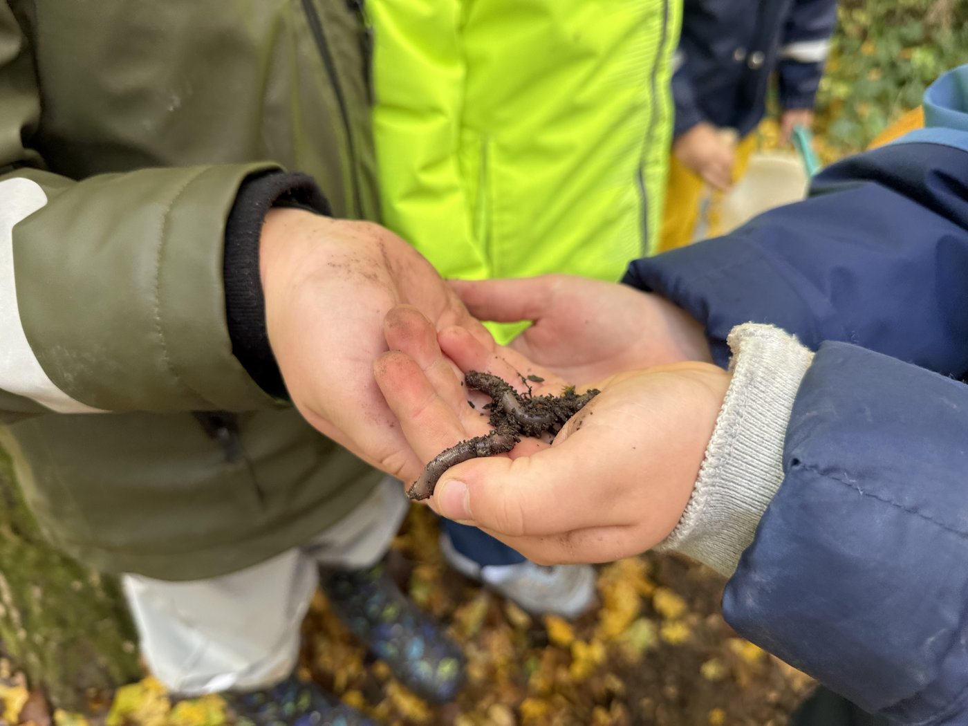 Trotz des stürmischen Herbstwetters geniessen die Kinder das Spielen und Entdecken im Freien. Unter den Blättern verstecken sich spannende kleine Tiere, die genaustens inspiziert werden. Auch ein Igelhotel darf im Kindergarten nicht fehlen. Fleissig werden dafür Blätter, Nüsse, Kastanien und andere Naturschätze gesammelt und zu einem Haufen zusammengetragen. Die besonders schönen Kastanien und Blätter werden im Kindergarten für Spiele und Legefiguren eingesetzt. Der Unterricht im Herbst – stürmisch, nass, farbenfroh und spannend in all seinen Facetten.