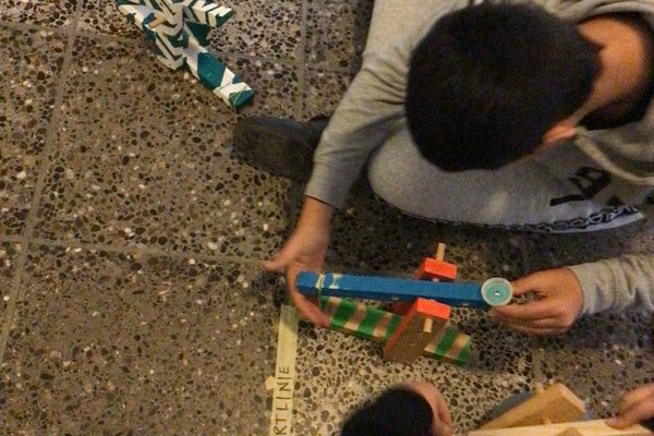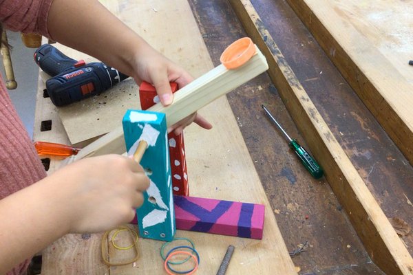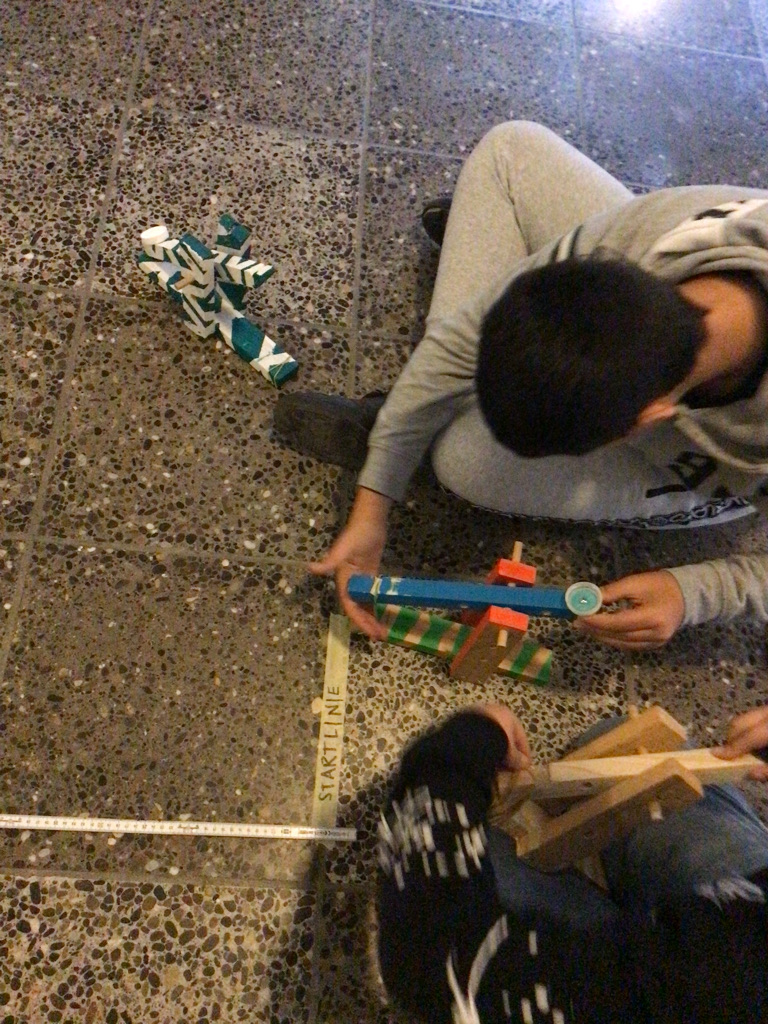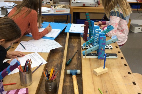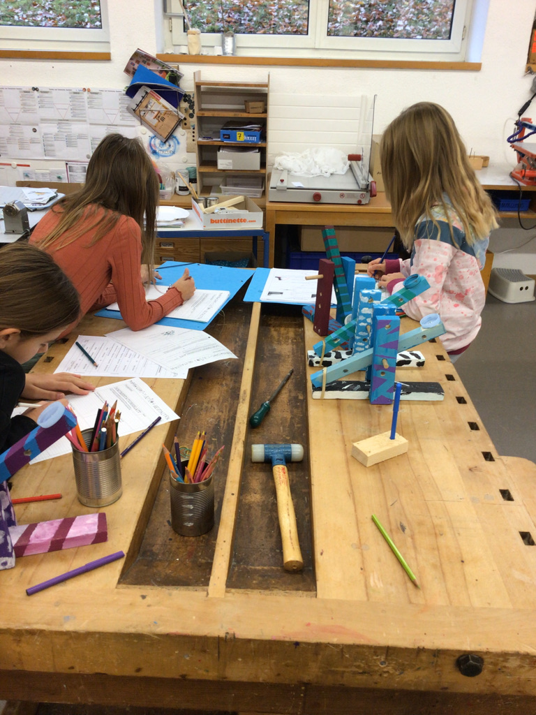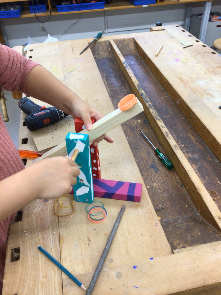 Nachdem sich die Klasse P5c mit den Hebelgesetzen beschäftig hat, tüftelten die Schülerinnen und Schüler mit verschiedenen Gummibändern herum, bis die selbstgebauten Sugus-Katapulte zum Teil über 12 Meter weit schiessen konnten! Mit dem Verändern des Drehpunktes (wie weit oben soll der Hebel befestigt werden?) schafften es einige Kinder auch, die Testgeschosse ein ganzes Stockwerk hoch zu katapultieren!