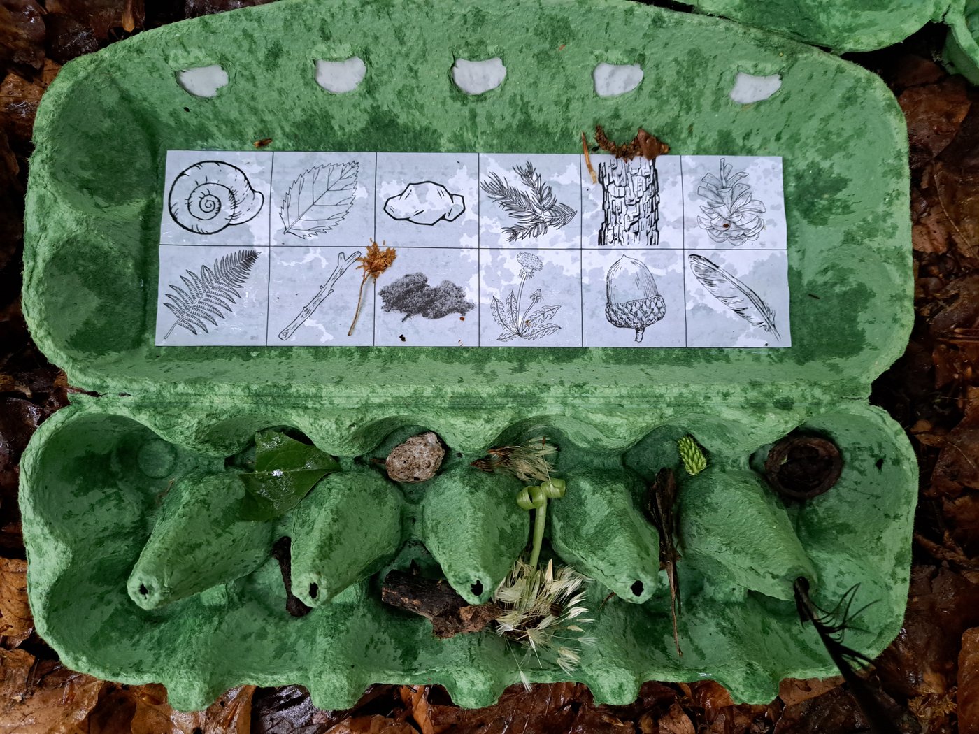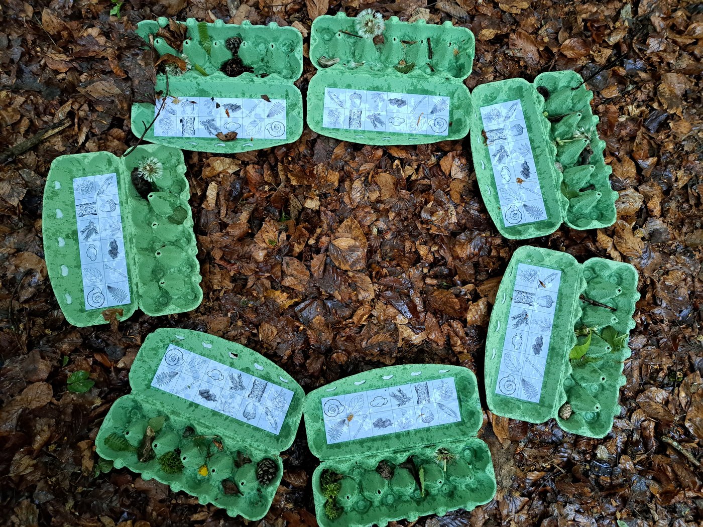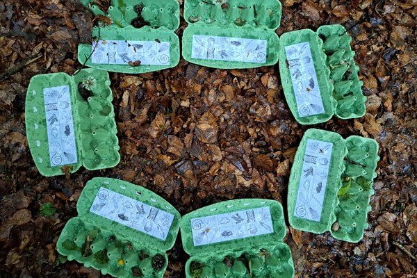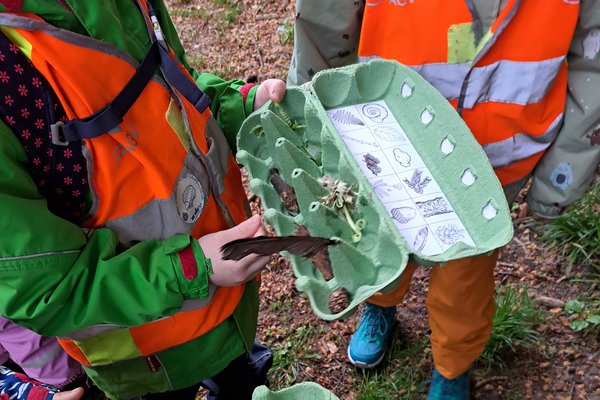 Am Waldrand erhalten die Kinder eine Eierschachtel mit einem Suchauftrag. Voller Elan machen sich die Kinder auf die Suche. Selbst im strömenden Regen haben die Kinder nicht aufgehört.