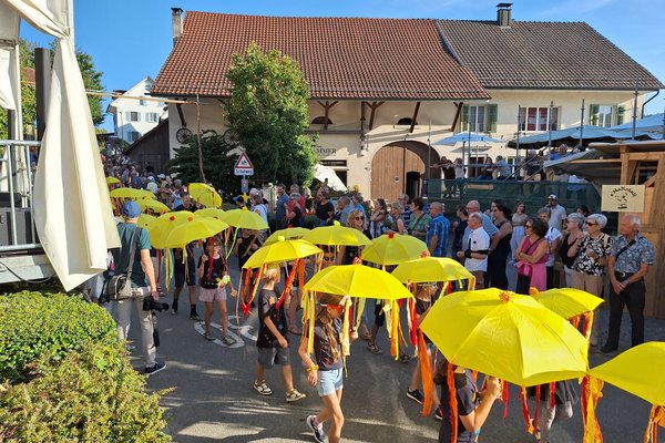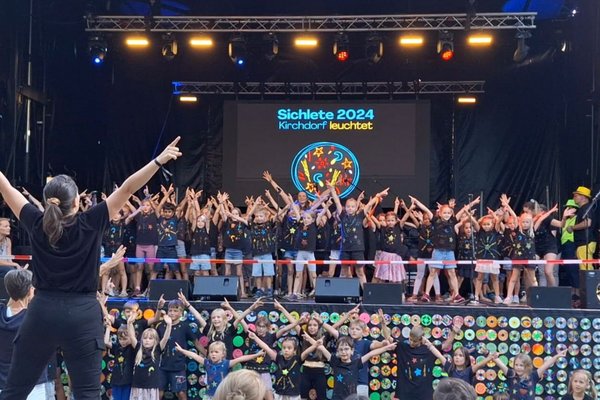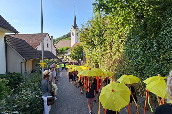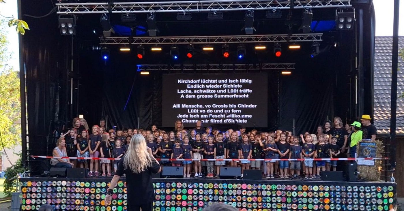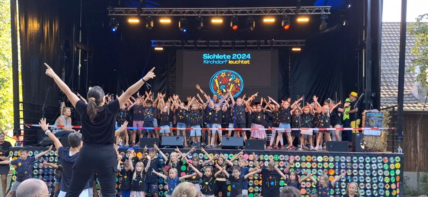 Im August war es dann endlich so weit. Die Kindergartenkinder und die Schülerinnen und Schüler der 1., 2. und 3. Klasse von Kirchdorf zogen bei der Eröffnungsfeier des grossen Festes mit ihren leuchtenden Schirmen, begleitet von den Tambouren und Kirchdorfer Vereinen sowie vielen klatschenden Zuschauerinnen und Zuschauer, durch das Dorf. Auf der Bühne sangen die fast hundert Kinder das Sichlete-Lied, das sie zusammen mit den Lehrerinnen getextet hatten, und führten einen Tanz auf. Die begeisterten Zuschauerinnen und Zuschauer dankten den Kindern mit einem grossen Applaus.