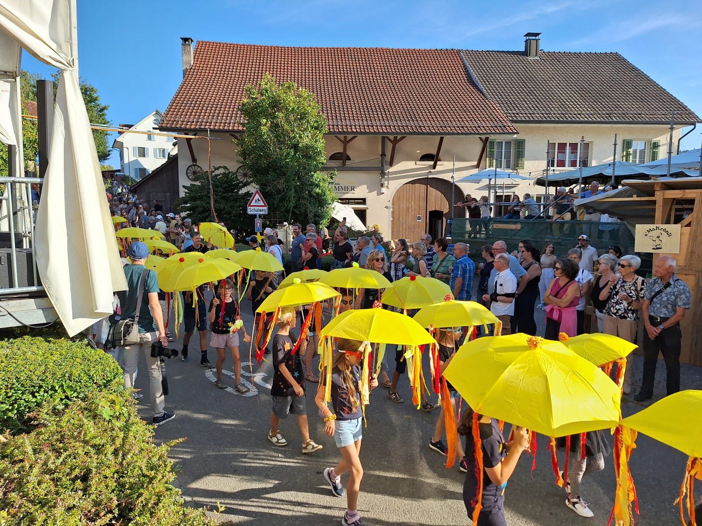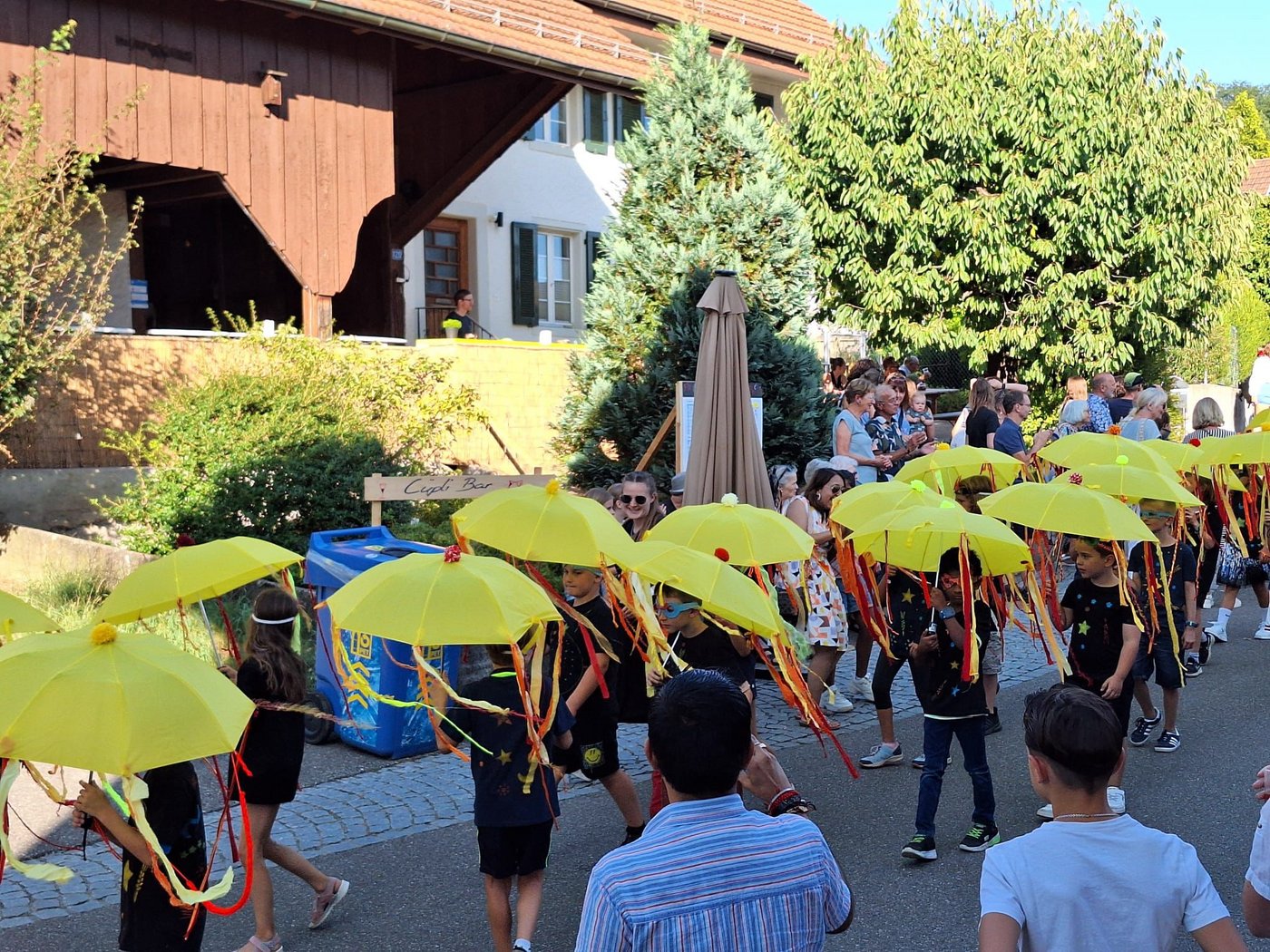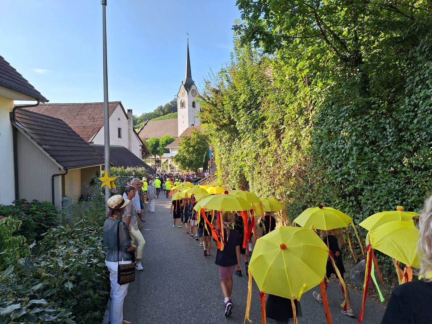 Im August war es dann endlich so weit. Die Kindergartenkinder und die Schülerinnen und Schüler der 1., 2. und 3. Klasse von Kirchdorf zogen bei der Eröffnungsfeier des grossen Festes mit ihren leuchtenden Schirmen, begleitet von den Tambouren und Kirchdorfer Vereinen sowie vielen klatschenden Zuschauerinnen und Zuschauer, durch das Dorf. Auf der Bühne sangen die fast hundert Kinder das Sichlete-Lied, das sie zusammen mit den Lehrerinnen getextet hatten, und führten einen Tanz auf. Die begeisterten Zuschauerinnen und Zuschauer dankten den Kindern mit einem grossen Applaus.