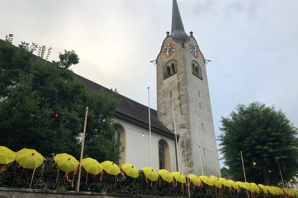 Die leuchtenden Schirme wurden als Dekoration an der Kirchenmauer aufgehängt und erfreuten die Festbesucher.