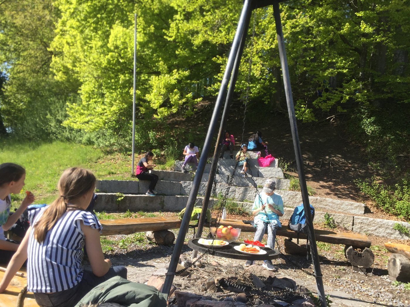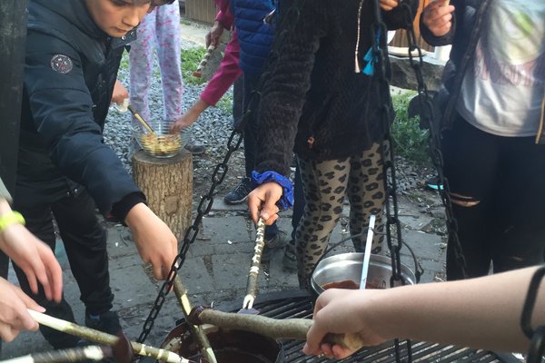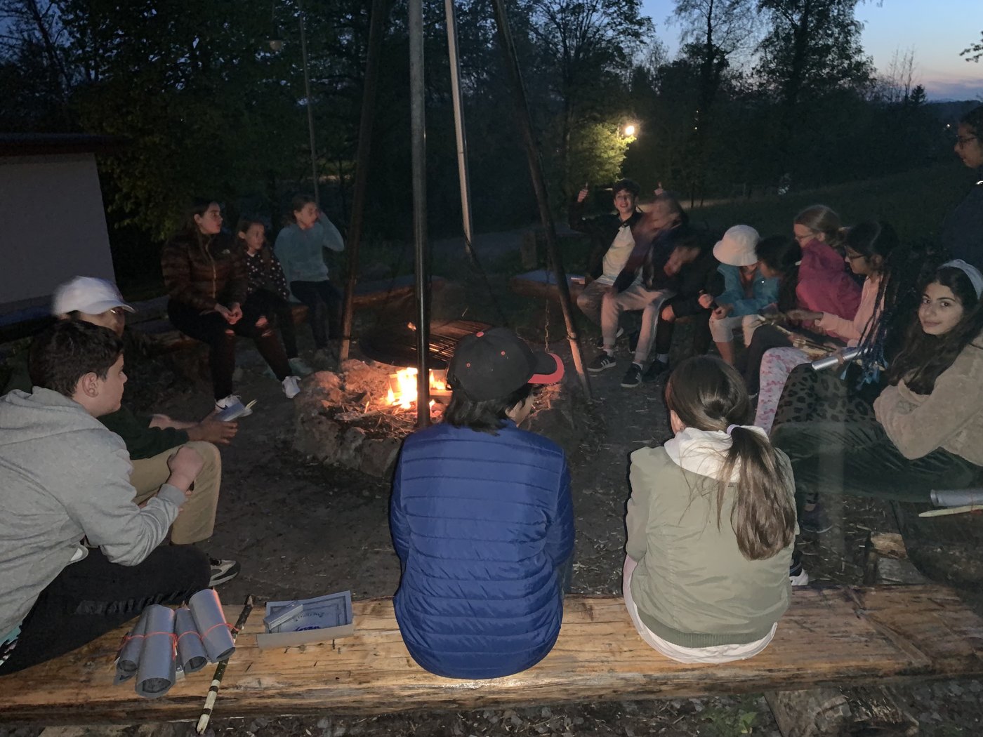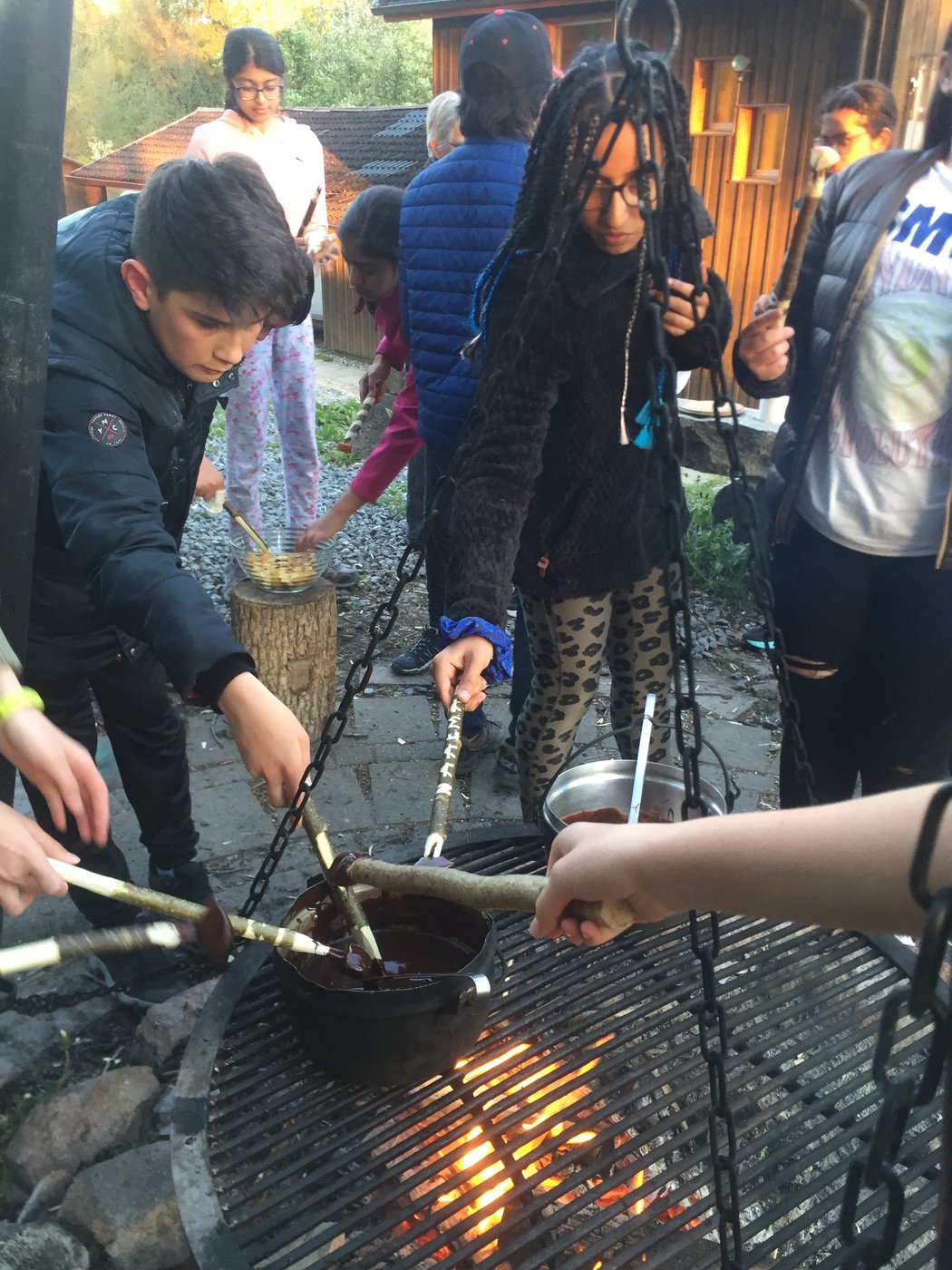Danach sassen wir am Lagerfeuer und hatten ein Schokofondue mit Äpfeln und Marshmallows. Die Äpfel und Marshmallows haben wir mit unseren selbst geschnitzten Gabeln aufgespiesst. Danach haben viele Wahrheit oder Pflicht gespielt. Schliesslich waren wir alle müde und machten uns bettfertig.