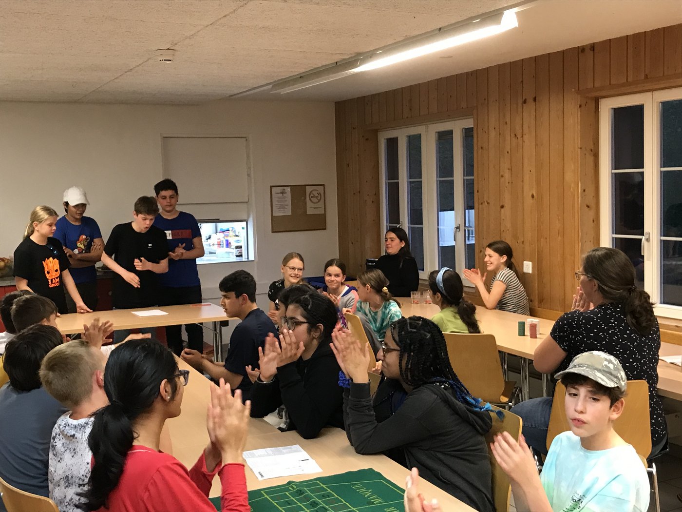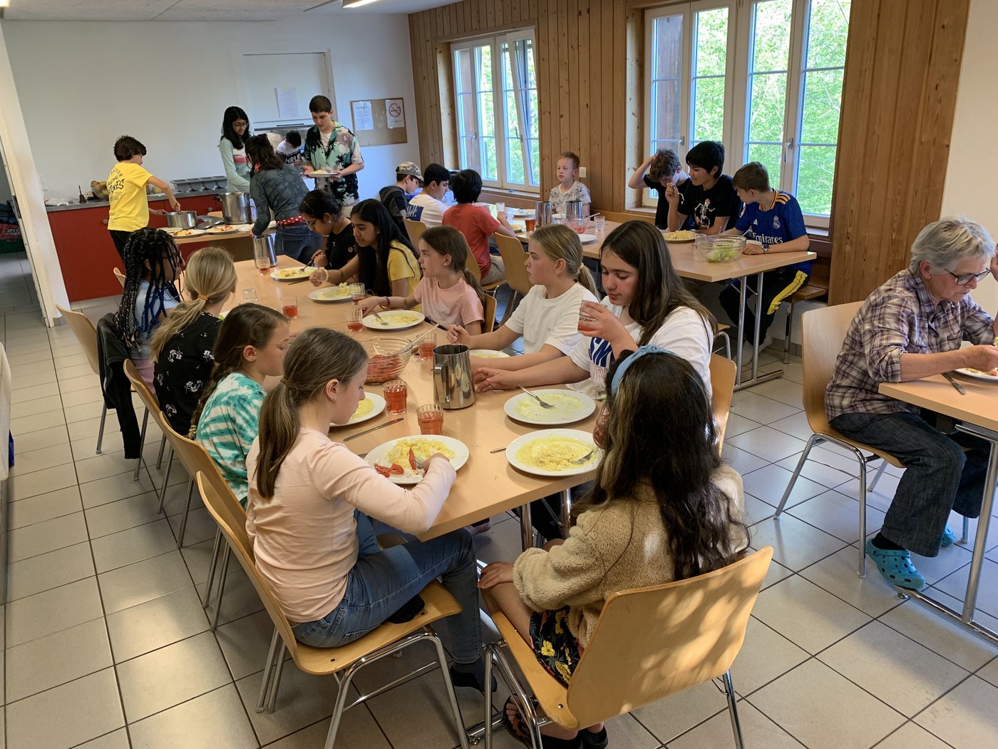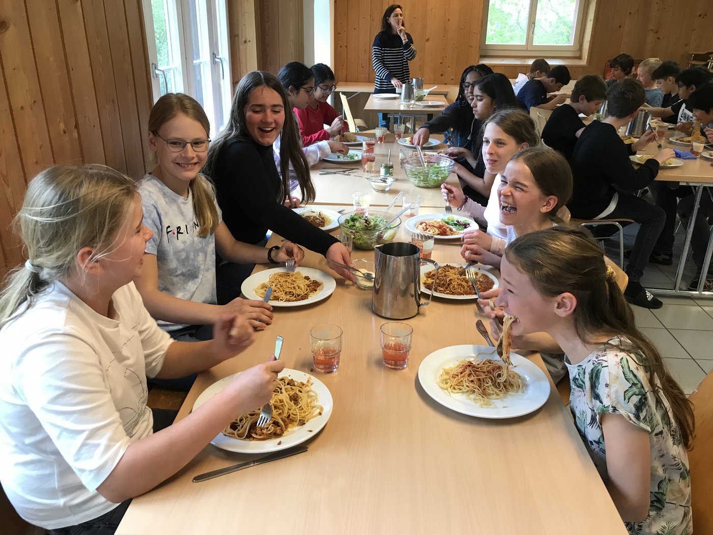 Heute sind wir zum ersten Mal in einem Lagerhaus aufgestanden. Leider hat uns das Wetter nicht besonders schön begrüsst, denn es regnete, regnete und regnete. Frau Fong hatte uns gestern gesagt, dass, wenn es sehr stark regnen würde, wir keine Wanderung machen, sondern ins Hallenbad gehen würden. Und - naja -…. Am Morgen gingen wir nach unten und versammelten uns an den Essenstischen. Silvio, David, Julian, Fabian und Nikola waren als erstes unten, für etwa eine Stunde. Als wir begannen, das Frühstück zu essen, verkündete Frau Fong, dass wir ins Hallenbad gehen. Wir packten unsere Sachen und liefen zum Bahnhof. Wir machten eine kleine Pause an einem Kiosk. Wir gingen mit dem Bus zum Hallenbad, das uns eine guten Eindruck machte. Als wir das Hallenbad betraten, gab es ein Highlight: die Wasserrutsche war richtig toll. Dann haben wir etwas am Rand des Hallenbads Mittag gegessen. Danach sind wir eine Stunde in den Wald zu einem Grillplatz gelaufen. Dort hat uns Frau Doppler Weiteres zum Schnitzen gezeigt. Es gab auch eine kleine Strömung, die eine ruhige Umgebung erzeugte. Nach etwa 80 Minuten sind wir wieder eine Stunde zurück zum Lagerhaus gewandert. Zwischendurch hatte Lia H. eine Idee: Sie hüpfte durch alle Pfützen - egal wie gross, egal wie klein - sie hatte schlussendlich komplett nasse Hosen und Schuhe. Im Lagerhaus ruhten wir uns sehr aus. Um 17:00 Uhr fingen wir an, die Ämtlis zu erledigen. Zum Abendessen gab es leckere Hamburgers und Pommes. Das Abendprogramm war besonders spektakulär, weil wir, wie im Casino, Poker gespielt haben. Zwei Stunden lang haben wir nur Glücksspiele gesuchtet. Heute war die «Gutenachtsgeschichte» besonders langweilig.