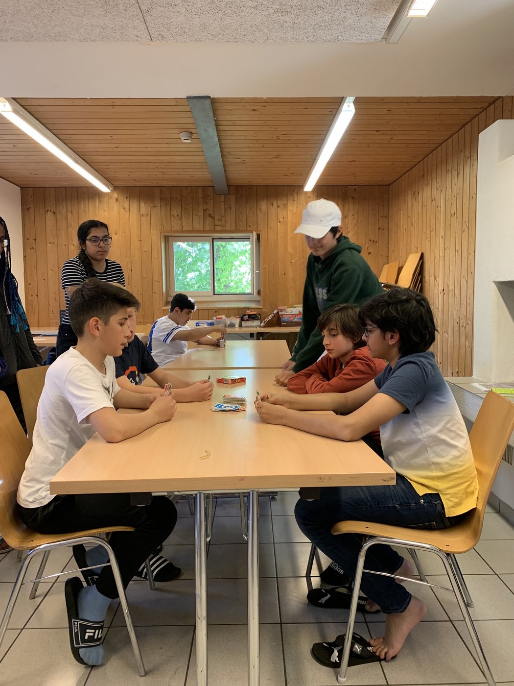 Frau Seibert weckte uns um 7.00 Uhr mit der Glocke. Wir haben uns bereit gemacht für den Tag. Um 7.30 Uhr haben wir gefrühstückt. Nach dem Frühstück hat uns Frau Seibert angekündigt, dass wir uns Turnkleider anziehen müssen. Wir haben an der Feuerstelle eine Gabel aus Holz angefangen zu schnitzen für das Dessert (Schokoladenfondue) am Abend. Wir liefen danach los zum Bahnhof und fuhren mit dem Bus zur Kletterhalle nach Uster. Dort hat eine Hälfte der Klasse zuerst gebouldert und die andere Hälfte ist mit einem Sicherheitsseil geklettert. Das war recht cool! Später gingen wir zurück mit dem Bus, Zug und Boot. Nachher haben wir noch die Gabel fertig geschnitzt. Um 17:23 Uhr wurde ein Klassenkamerad abgeholt. Also war’s das für ihn mit dem Schokofondue. Los ging’s mit den Ämtlis um 17:30! Um 18 Uhr haben wir zum Abendessen Fajitas gegessen. Nach dem Essen wurde noch der Zorro aufgelöst und es war Lia H. Die Gehilfen des Zorros waren Nikola und Loris. Das Abendprogramm fing an. Wir hatten ein Uno-Turnier. Es gab 10 Teams, in einem Team waren 2-3 Spieler. Schlussendlich waren Frau Seibert und Frau Disler die Gewinner!