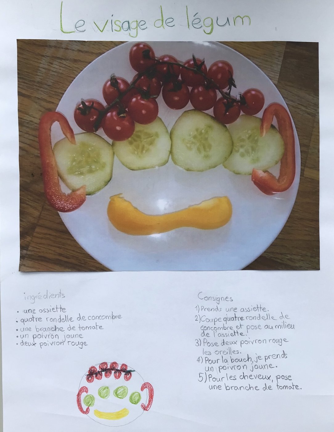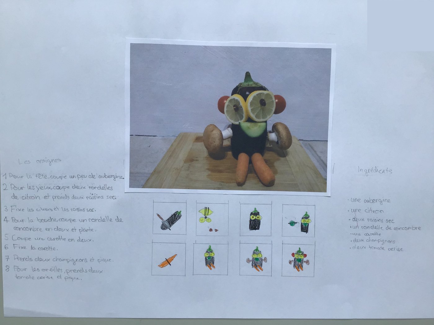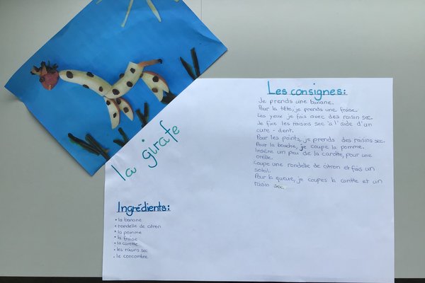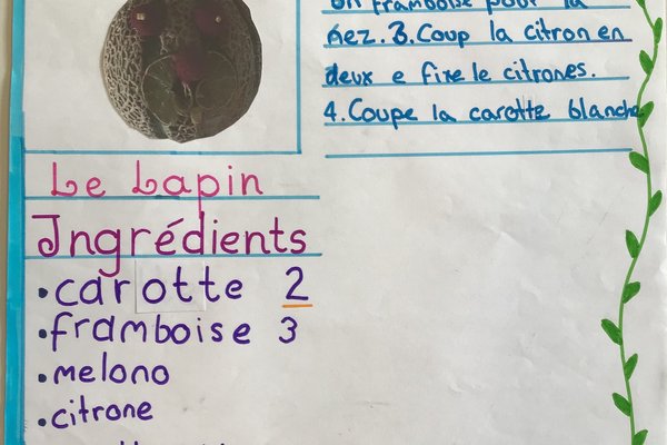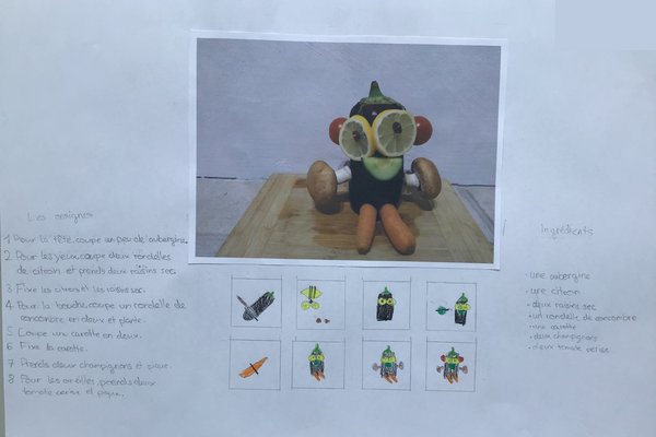 In der Unité 4 - Les aliments dans tous les sens sollten wir als Schlussprojekt eine Figur aus Gemüse & Früchten gestalten. Zudem mussten wir danach ein schönes Plakat gestalten. Auf diesem schrieb man die Zutaten und Anleitung zu der Kreation. Es erschienen sehr viele wunderschöne Werke.