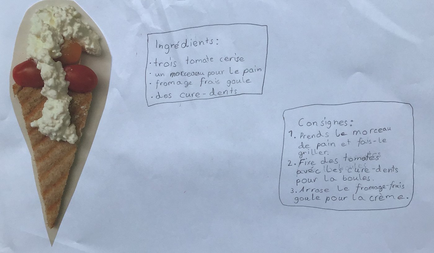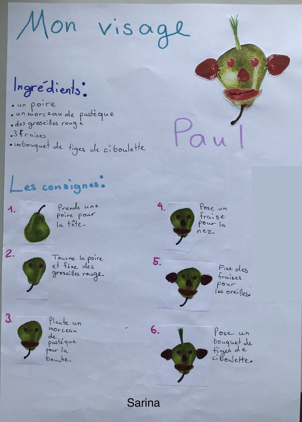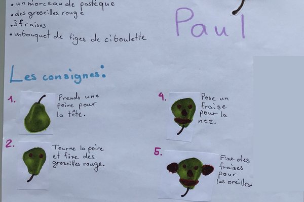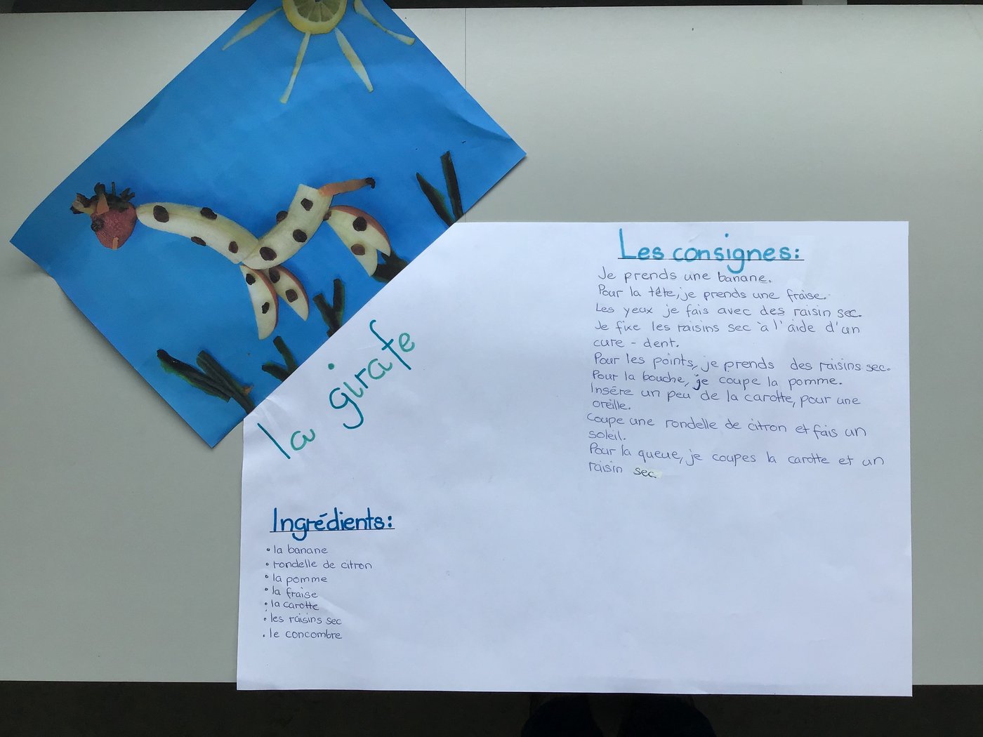 In der Unité 4 - Les aliments dans tous les sens sollten wir als Schlussprojekt eine Figur aus Gemüse & Früchten gestalten. Zudem mussten wir danach ein schönes Plakat gestalten. Auf diesem schrieb man die Zutaten und Anleitung zu der Kreation. Es erschienen sehr viele wunderschöne Werke.