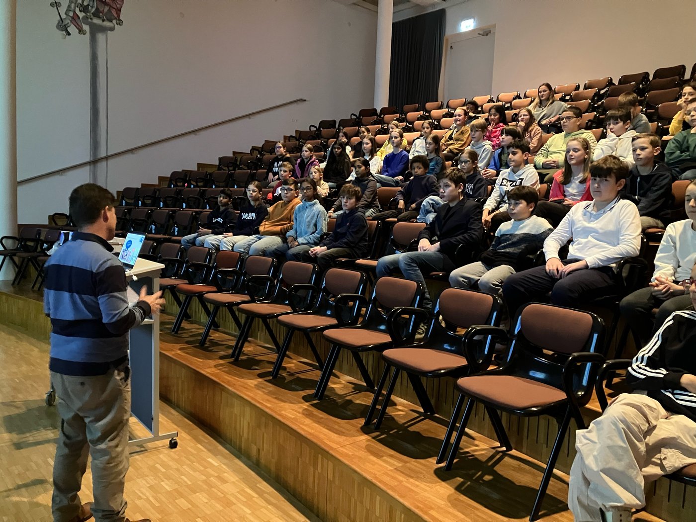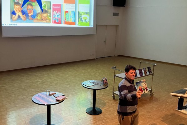 Während am Freitagabend die Erzählnacht für die 4. und 5. Klässler stattfand, durften die sechsten Klassen in der Aula eine Lesung des Autors Marcel Naas geniessen. Der Autor der «Mounteens»-Bücher liess die Schülerinnen und Schüler am Entstehungsprozess des ersten Bandes teilhaben - von der ersten Idee bis zum finalen Roman.