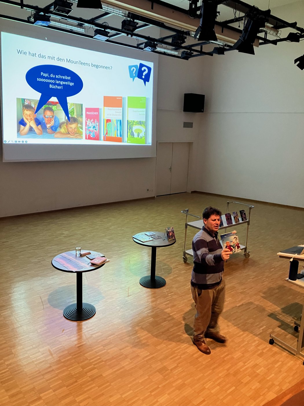 Natürlich wurden auch Szenen aus dem Buch vorgetragen. Im Stil eines Lesetheaters gab Naas spannende, brenzlige, aber auch romantische Szenen aus seinen Büchern zum Besten. Dazu passend wurden Illustrationen aus den Büchern im Hintergrund an eine Leinwand projiziert.