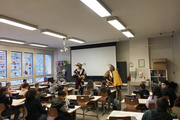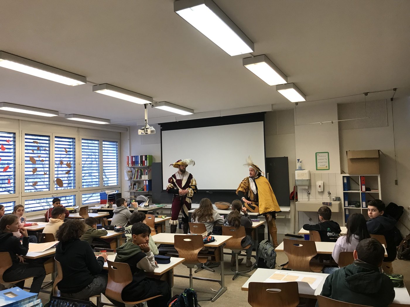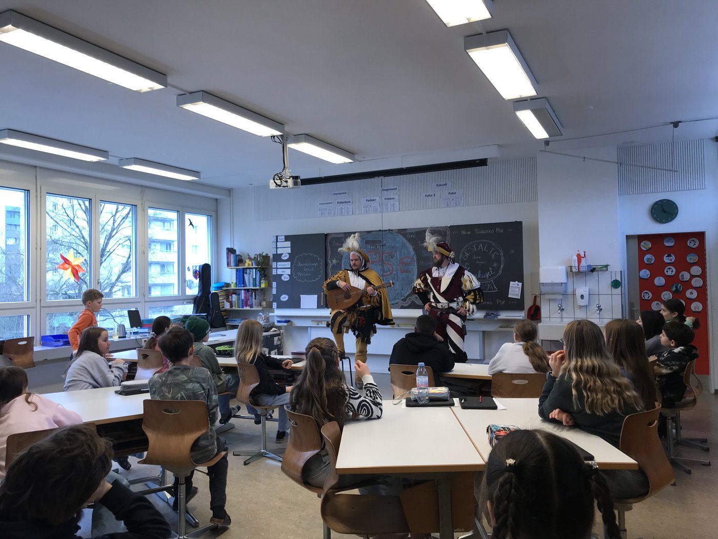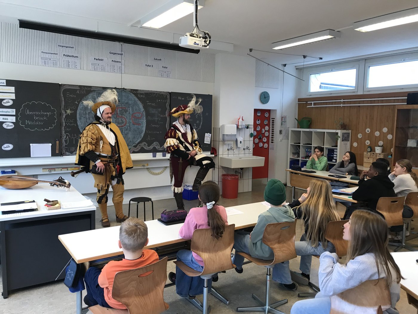 Passend zum aktuellen NMG-Thema erhielten die Klassen 5e und 5c eine besondere Überraschung: Zwei Mitglieder der "Helle-Barden" besuchten sie und entführten sie mit Musik und Erzählungen ins Mittelalter. In authentischen Gewändern brachten sie den Kindern das Leben vergangener Jahrhunderte näher. Begeistert lauschten die Schülerinnen und Schüler den mittelalterlichen Klängen und Geschichten. Ein herzliches Dankeschön an die "Helle-Barden" für dieses unvergessliche Erlebnis!