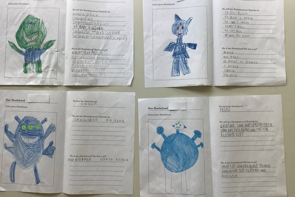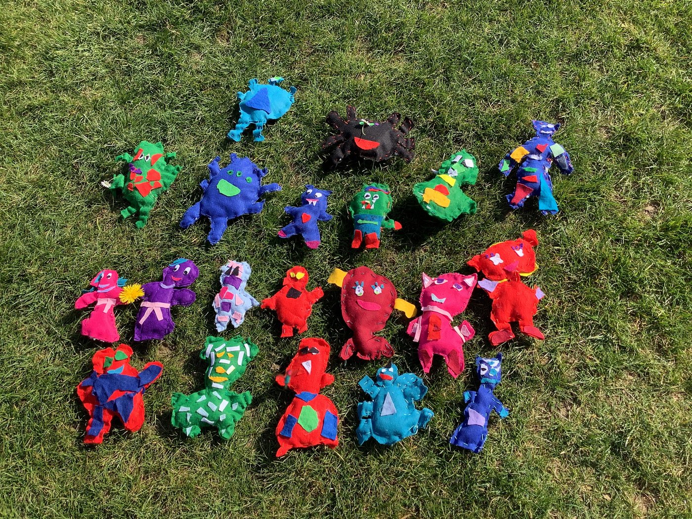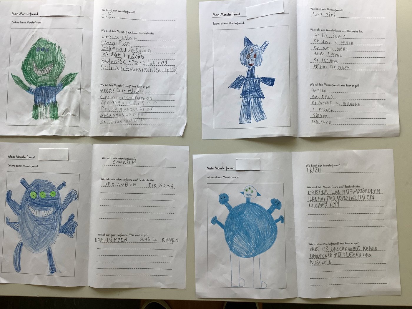 Natürlich wollten auch die Schülerinnen und Schüler der ersten Klasse einen Monsterfreund haben. Mit viel Fantasie und vielen Ideen haben sie ihren Monsterfreund aufgezeichnet und beschrieben. Aus den Zeichnungen wurden anschliessend Schnittmuster gemacht und die Kinder nähten mit grossem Eifer aus Filz ihren Monsterfreund. Danach wurde dieser noch verziert. Viele tolle Monsterfreunde sind entstanden und die Schülerinnen und Schüler sind mit Recht stolz auf ihre Kreationen.