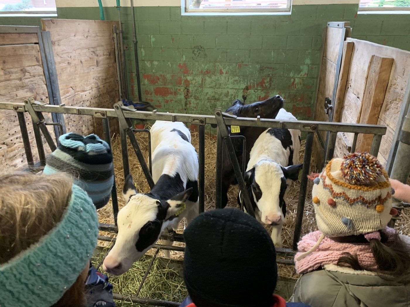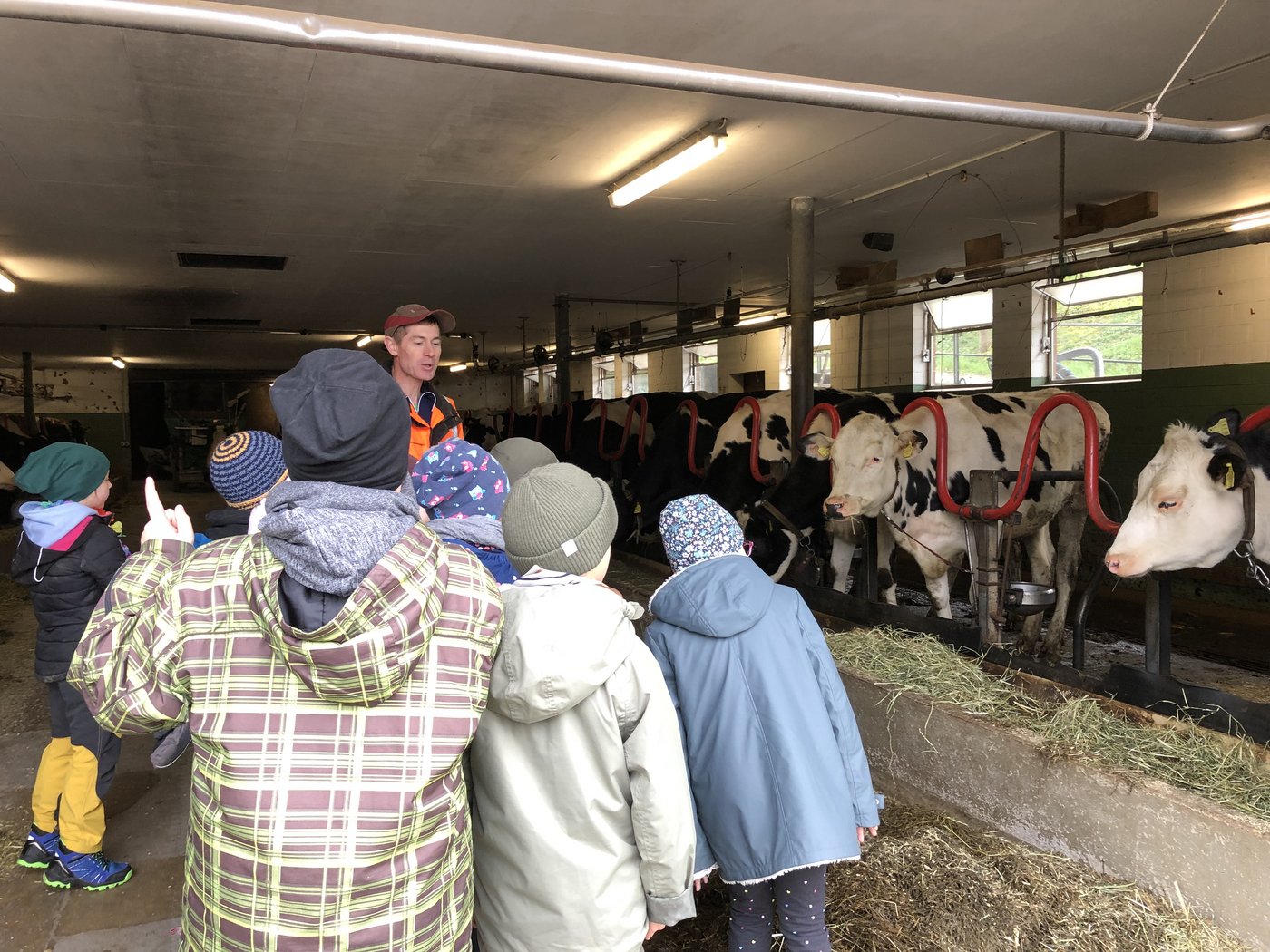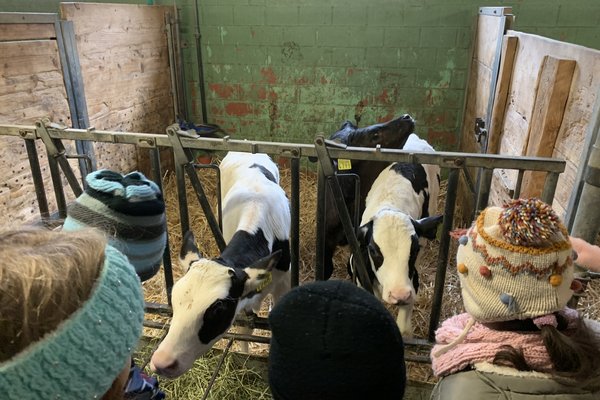 Es machte Spass, die Kühe und Rinder mit Heu zu füttern und die Kälber zu streicheln. Im Milchraum guckten wir in den Milchtank und erfuhren, dass darin 1250 Liter Milch reinpassen. Wer Lust hatte, durfte einen Becher frische Milch probieren.