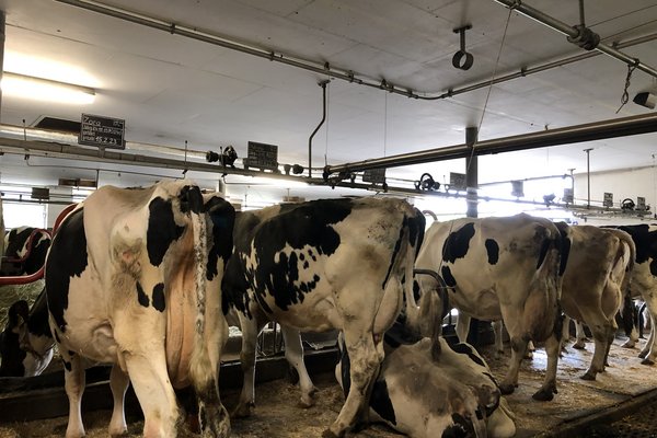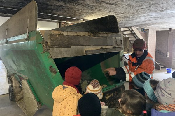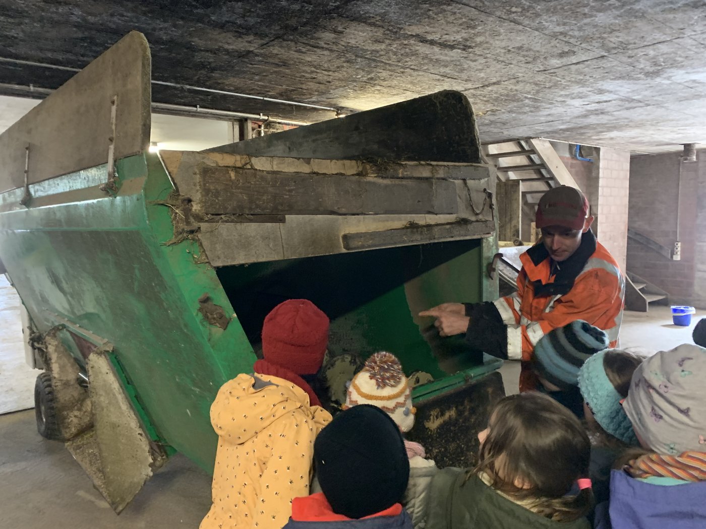 Aufgeteilt in vier Gruppen erkundeten wir den Kuhstall, den Milchraum, den Hühnerstall und zwei Traktoren.