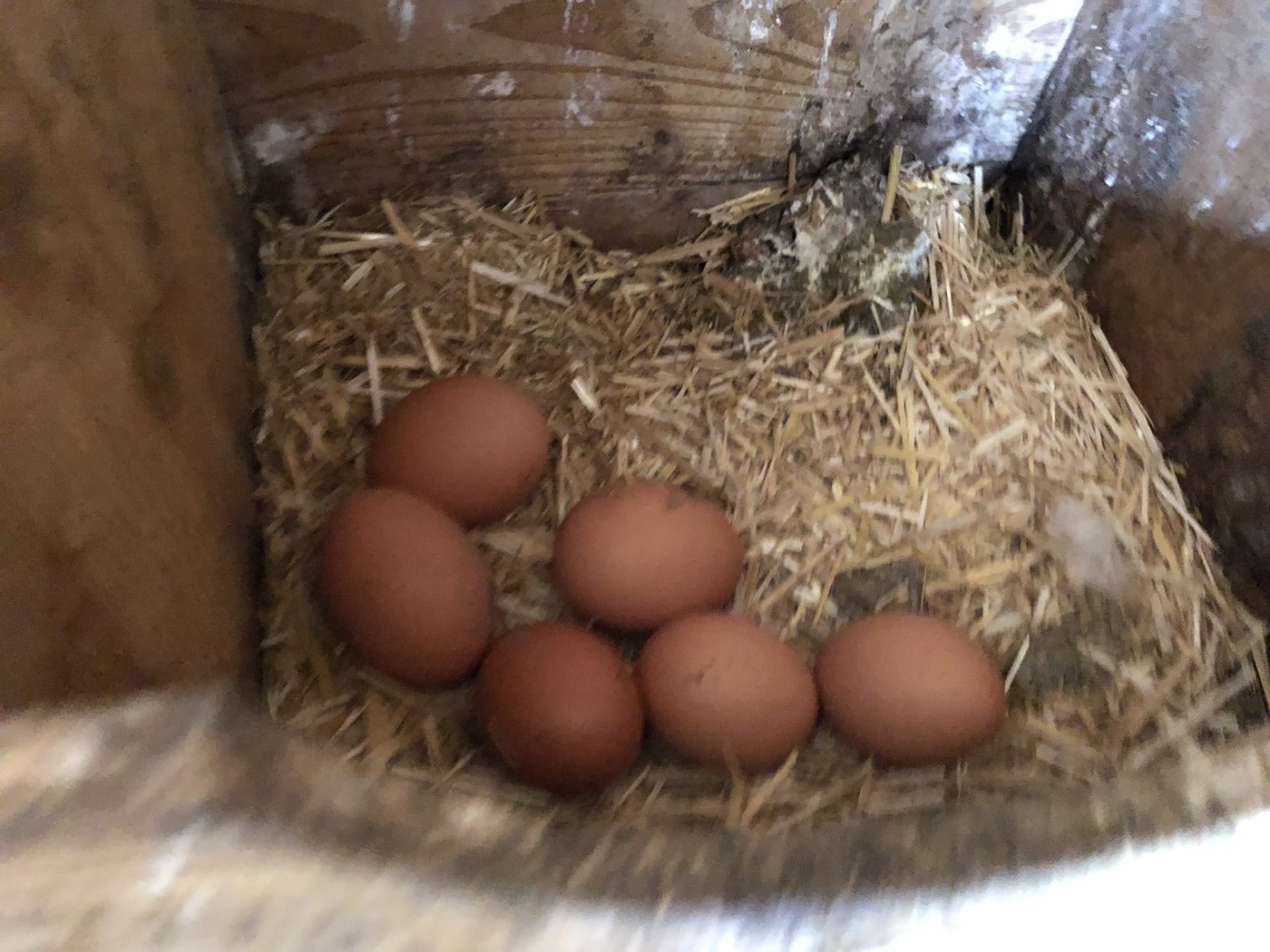 Im Hühnerstall zählten wir 14 frische Eier. Dann gab uns Frau Schmid eine Handvoll Körner für die Hühner.