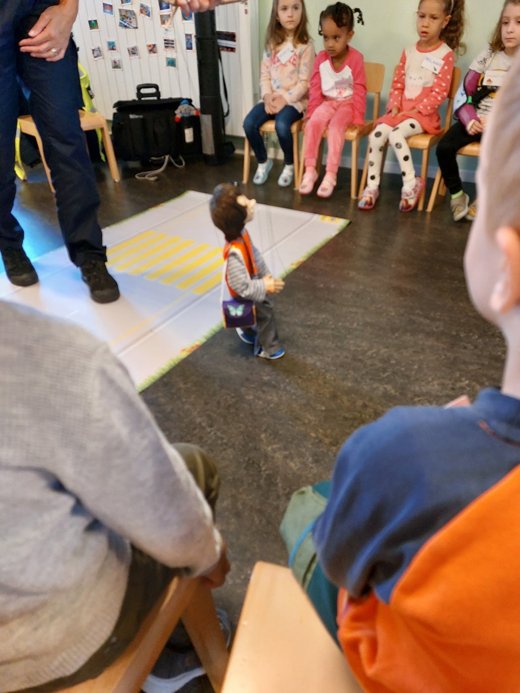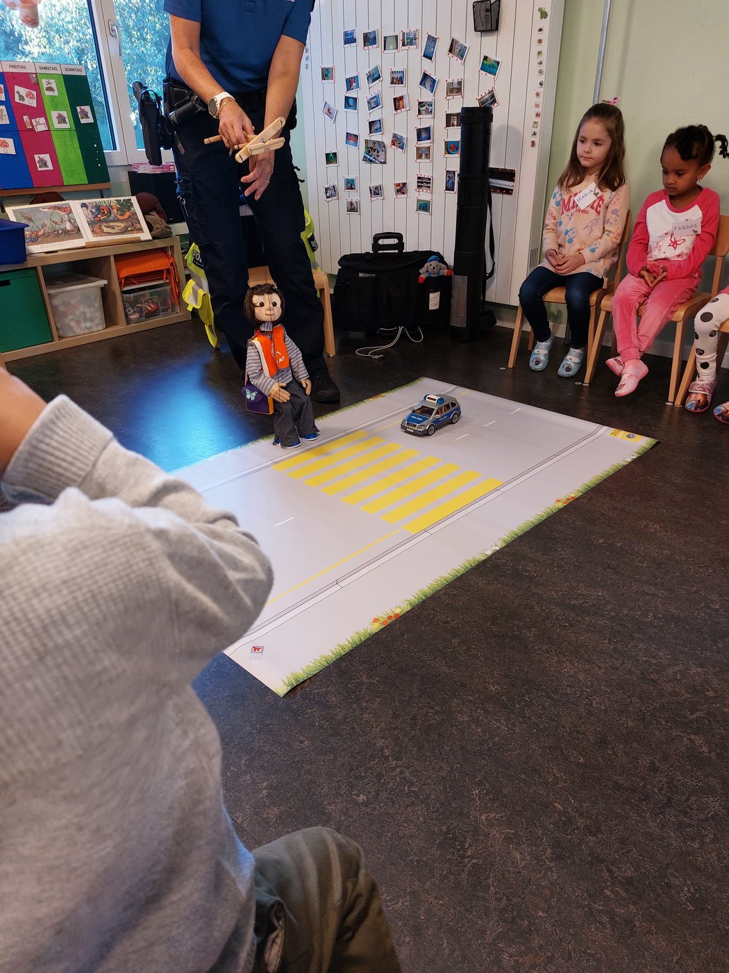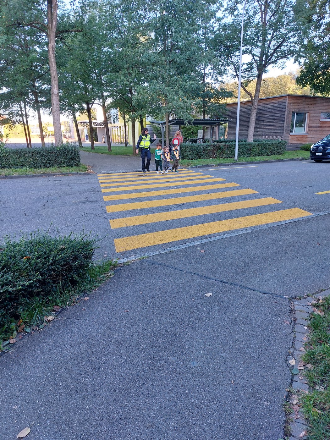 Einmal im Schuljahr besucht eine Polizistin oder ein Polizist die Kindergartenklassen in Obersiggenthal. Im Theorieunterricht wird den Kindern zuerst mit Hilfe einer grossen "Spielstrasse" und einer Marionette mit Leuchtweste erklärt, wo und wie die Strasse richtig überquert wird. Anschliessend üben die Kinder draussen in Begleitung und unter Aufsicht der Polizistin/des Polizisten beim richtigen Fussgängerstreifen das Überqueren der Strasse.