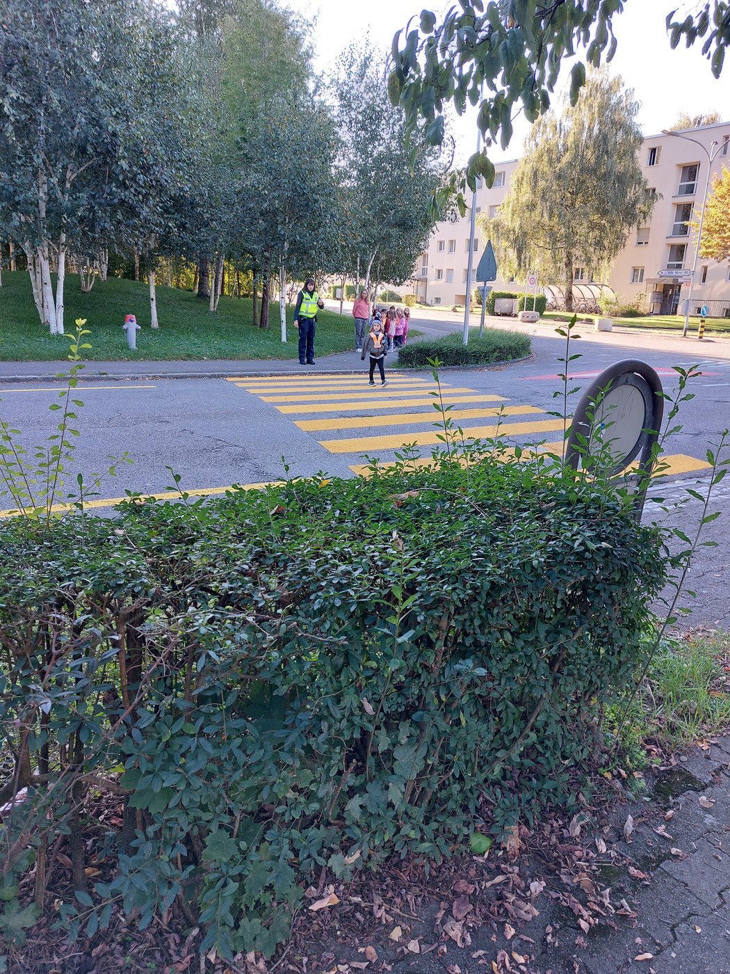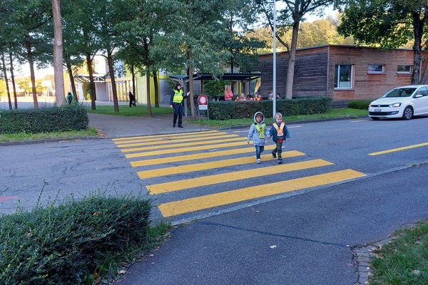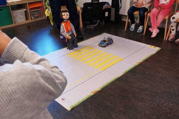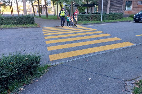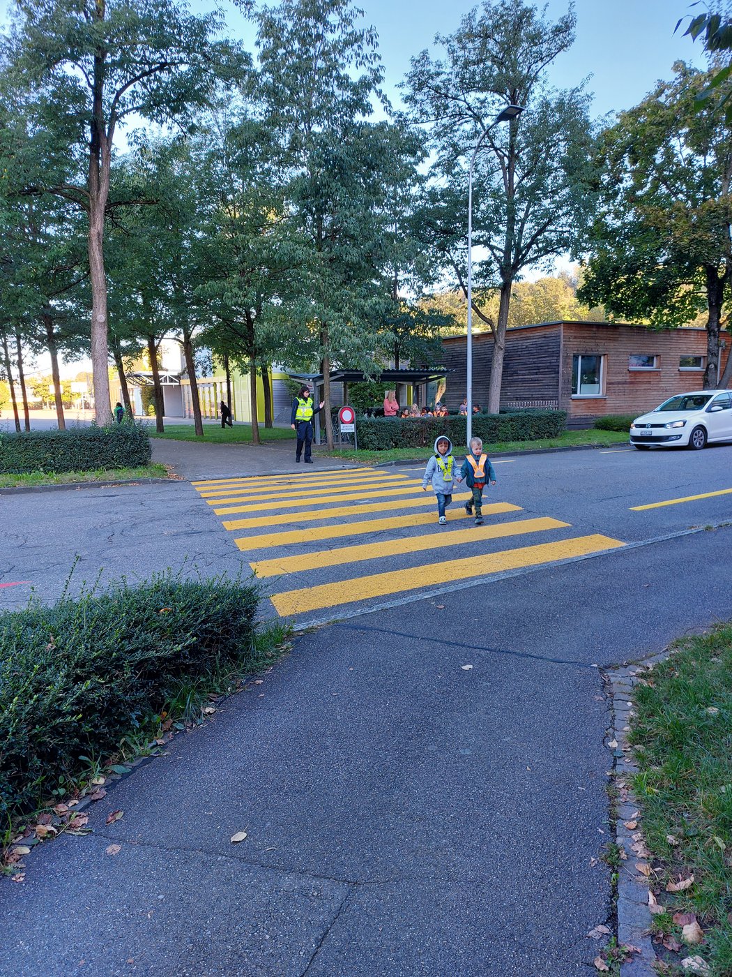 Einmal im Schuljahr besucht eine Polizistin oder ein Polizist die Kindergartenklassen in Obersiggenthal. Im Theorieunterricht wird den Kindern zuerst mit Hilfe einer grossen "Spielstrasse" und einer Marionette mit Leuchtweste erklärt, wo und wie die Strasse richtig überquert wird. Anschliessend üben die Kinder draussen in Begleitung und unter Aufsicht der Polizistin/des Polizisten beim richtigen Fussgängerstreifen das Überqueren der Strasse.