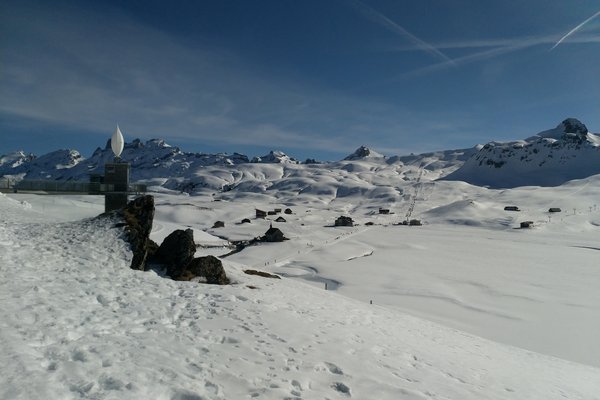 Beim Ferienhaus «Juhui» wurde durch das bewährte Leiterteam alles Gepäck ausgeladen und verstaut, und schon ging es weiter zur Talstation «Stöckalp». Die Tickets waren, wie bestellt, bereit, und die ganze Schar segelte im Gondeli auf die Frutt. Auf dem herrlich verschneiten Hochplateau wurde die Gruppe mit viel Sonnenschein begrüsst.